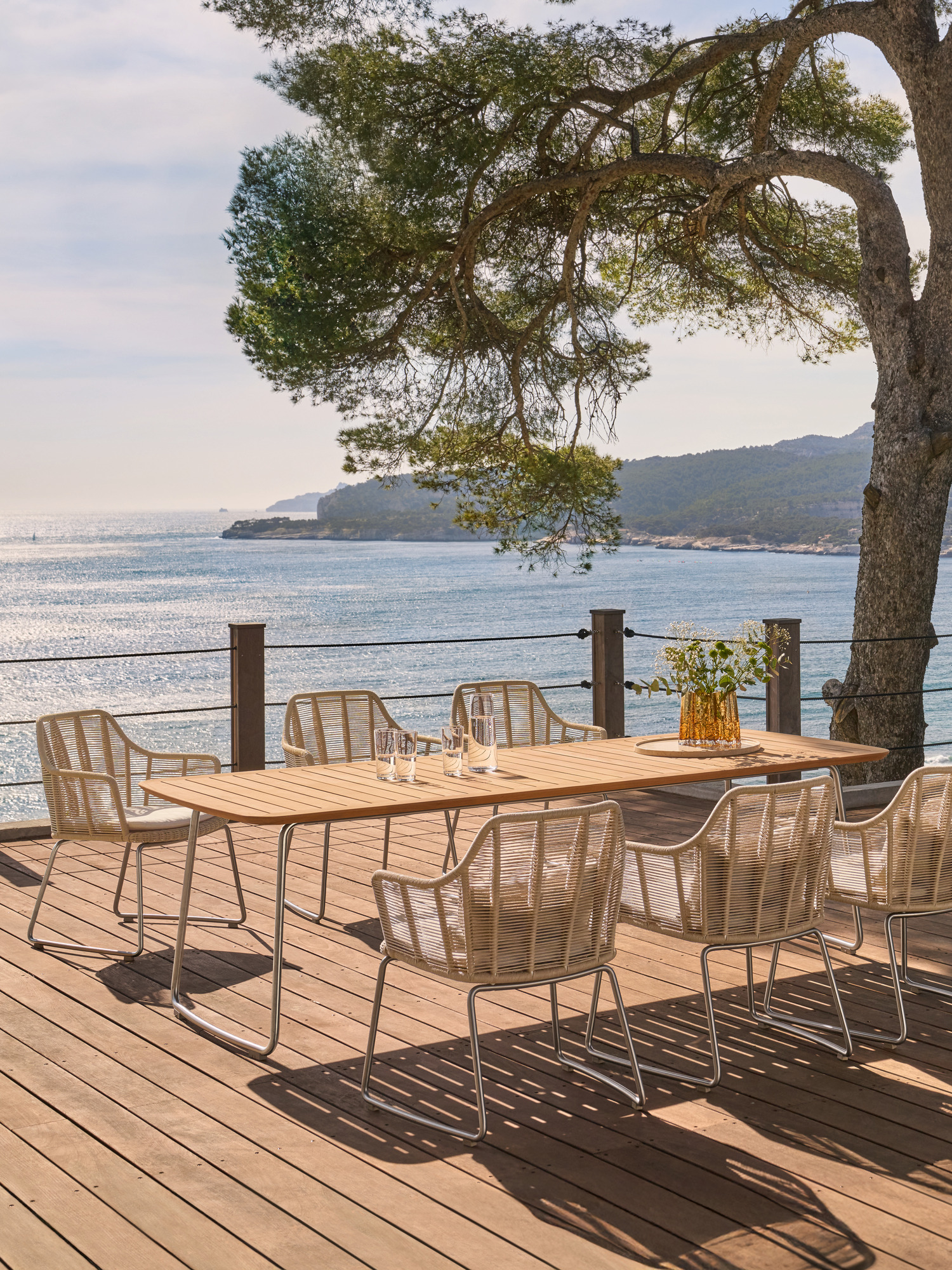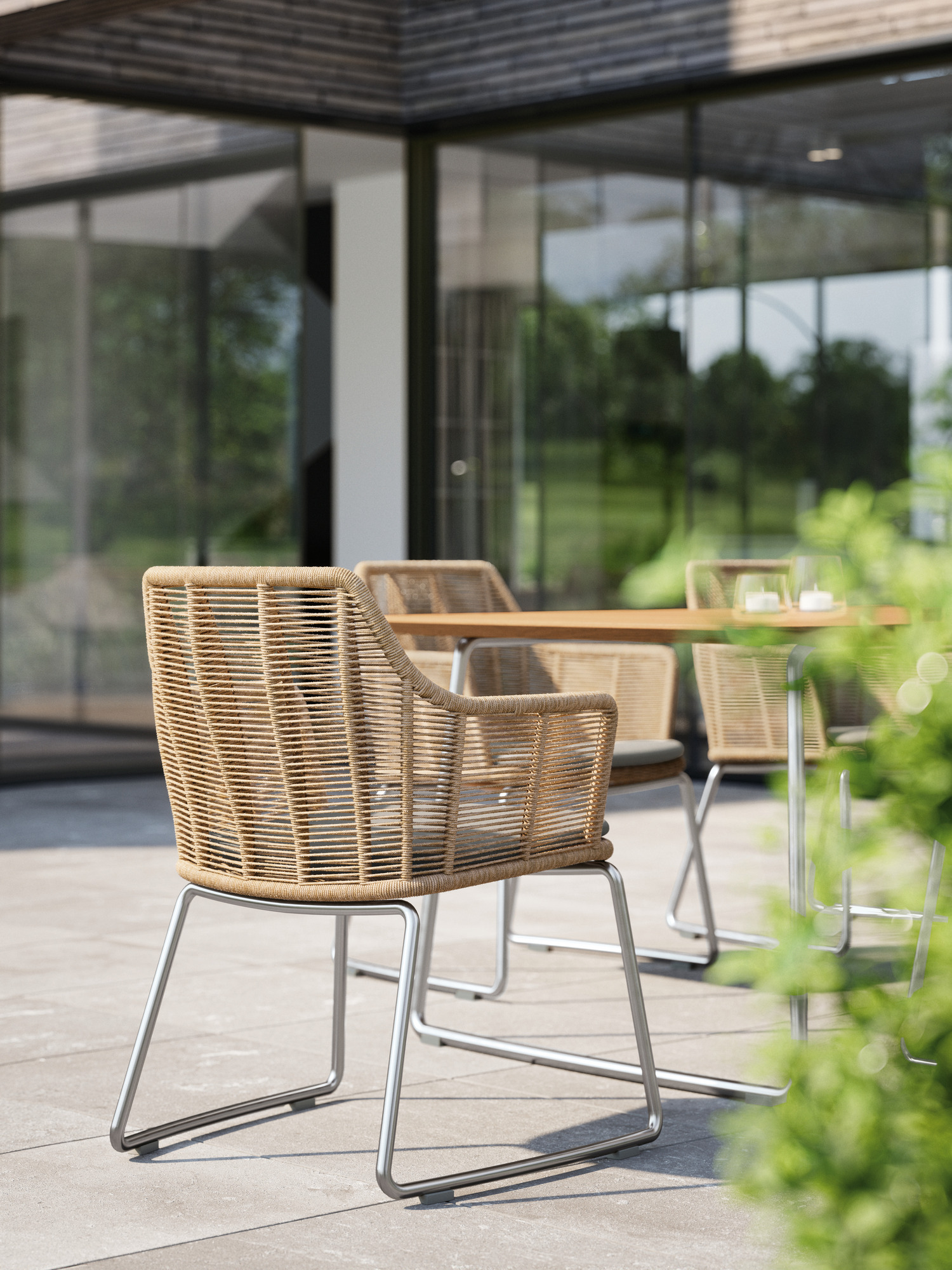 An ergonomically shaped double-sided backrest and traised armrests of the garden chair have an airy, pleasantly cocooning quality. The particularly natural and soft feel of the woven material further heightens seating comfort. Slender stainless steel runners provide the armchairs with unfailing support. The dining tables of the collection, with teak or synthetic resin tops, take their place as delightfully harmonious counterparts.