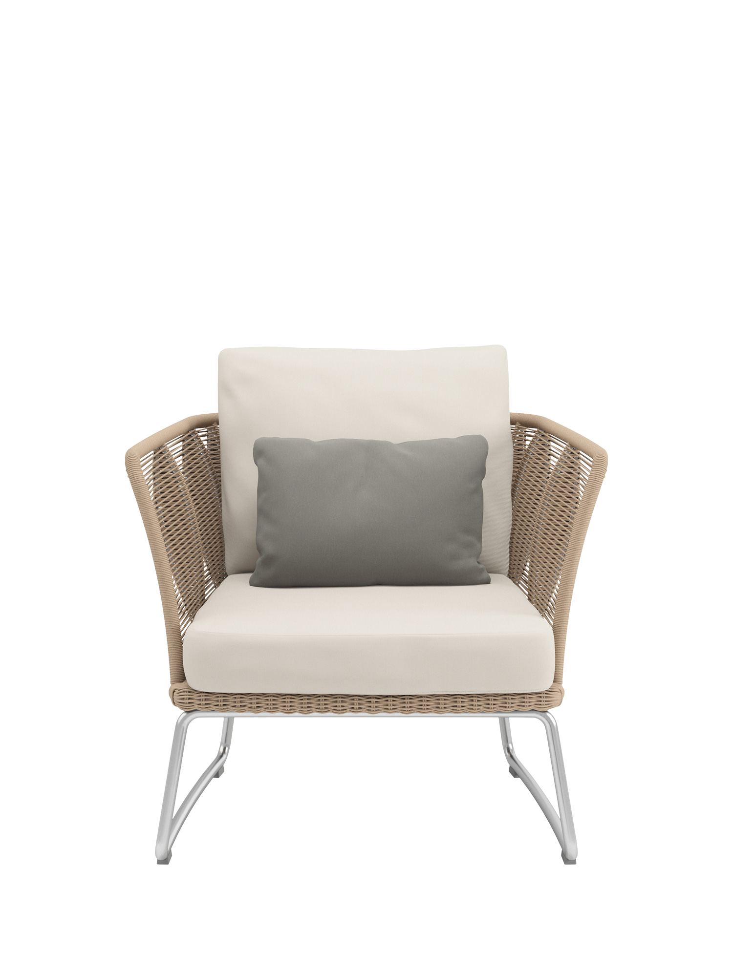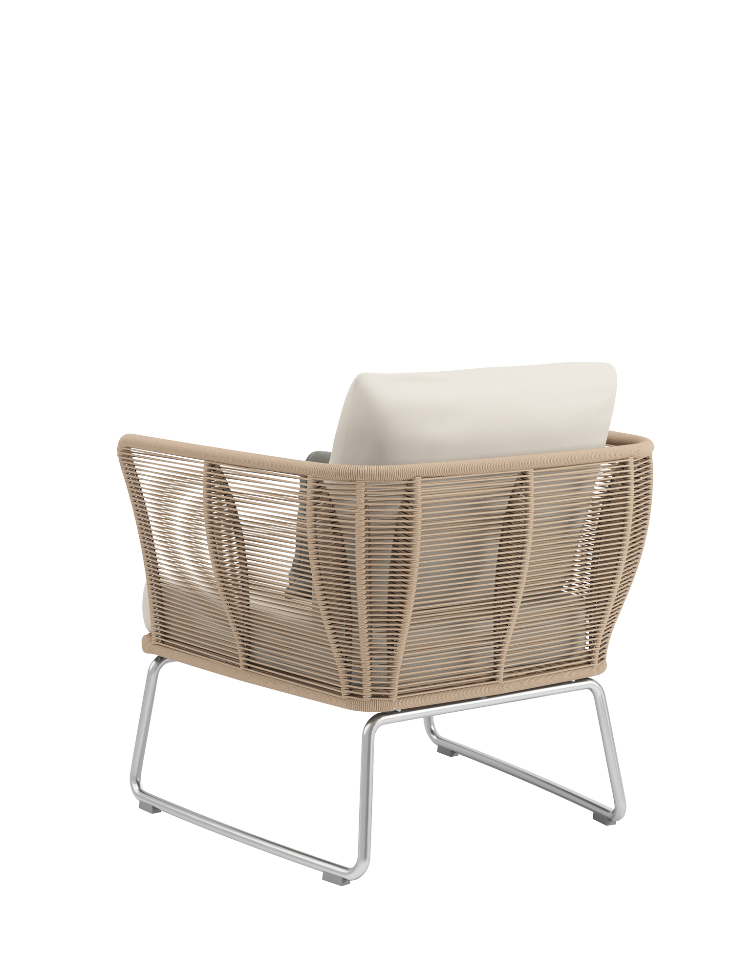 The contrasting combination of weather-resistant woven cord and stainless steel, is both delicately transparent and extremely robust. The linear wickerwork pattern of the lounge furniture allows light to shine through. The back and sides of the comfortable armchair curve round at the same height, and being dual-layered, offer nicely resilient support. Slender stainless steel runners are a distinguishing design feature, and provide reliable stability.