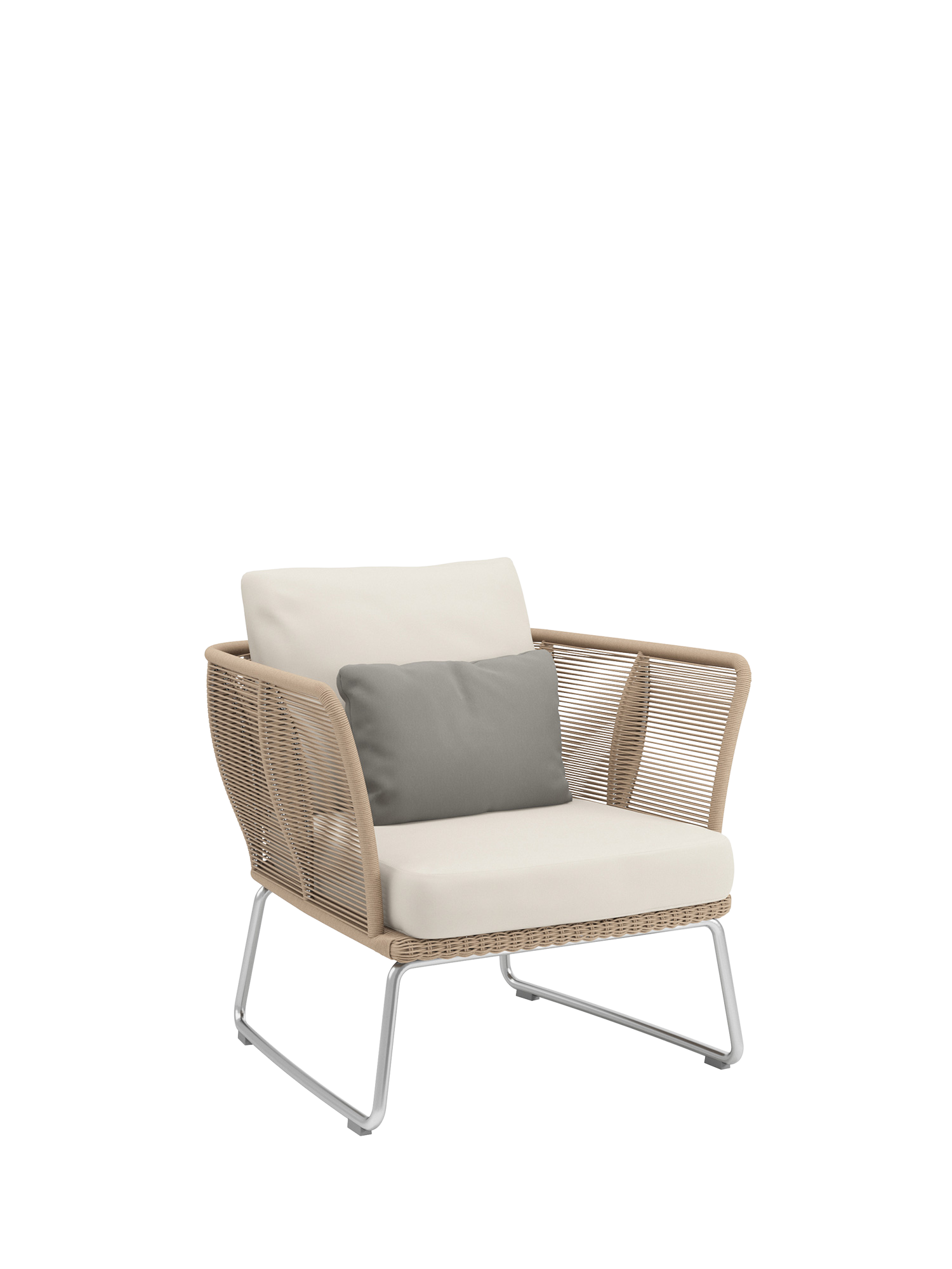 The striking lounge armchairs can be enjoyed in the garden and on the terrace all year round. They are made exclusively of weather-resistant and robust materials in unmistakable Garpa quality – especially easy to clean brushed stainless steel, and woven polyethylene cord with a lovely natural appearance.