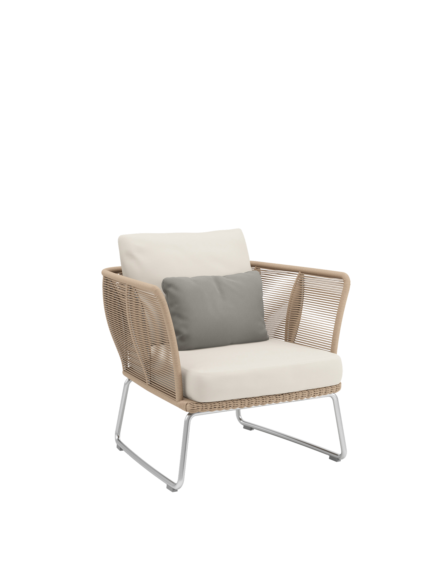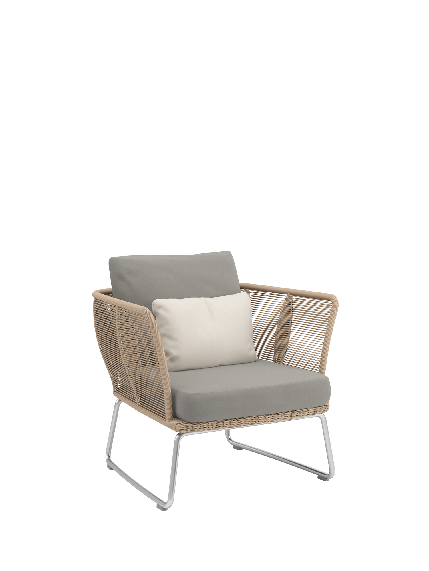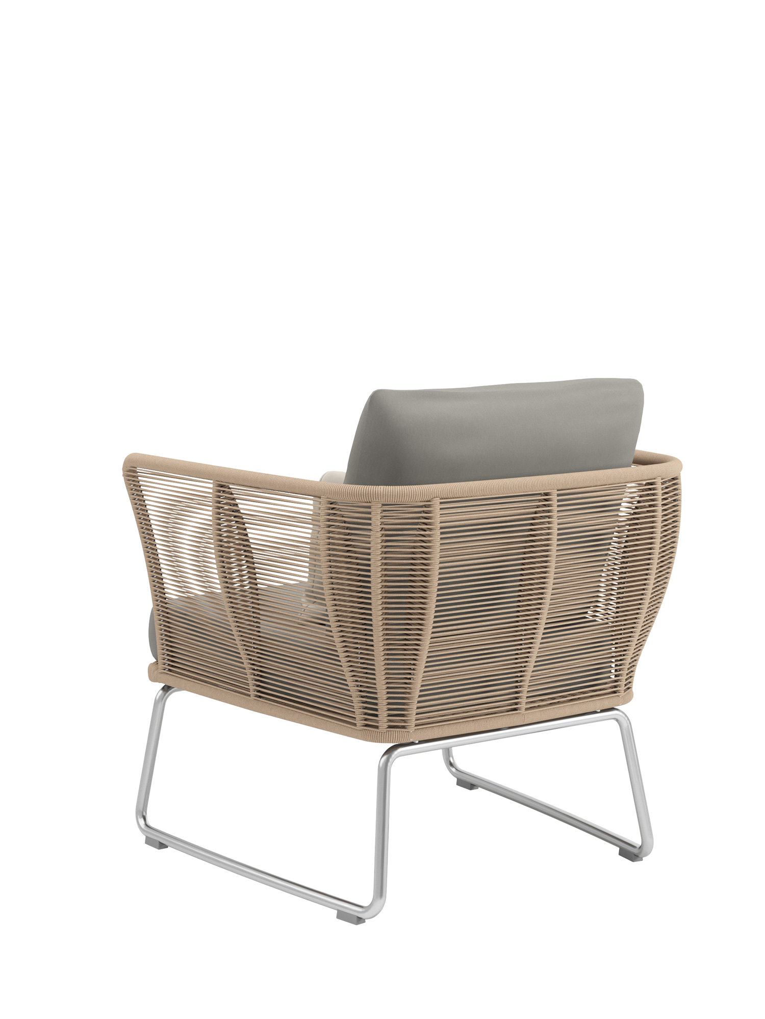 The striking lounge armchairs can be enjoyed in the garden and on the terrace all year round. They are made exclusively of weather-resistant and robust materials in unmistakable Garpa quality – especially easy to clean brushed stainless steel, and woven polyethylene cord with a lovely natural appearance.