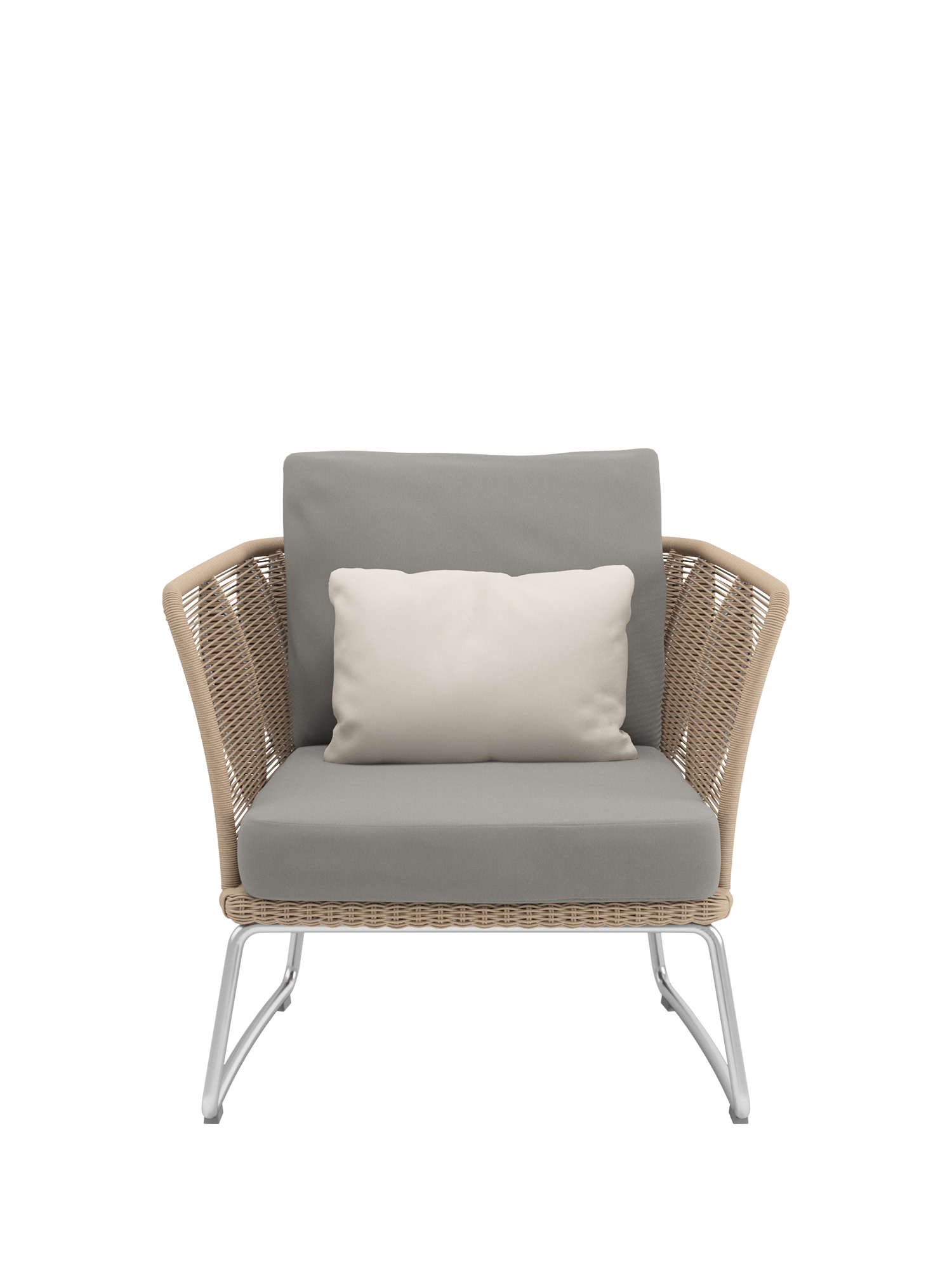 The contrasting combination of weather-resistant woven cord and stainless steel, is both delicately transparent and extremely robust. The linear wickerwork pattern of the lounge furniture allows light to shine through. The back and sides of the comfortable armchair curve round at the same height, and being dual-layered, offer nicely resilient support. Slender stainless steel runners are a distinguishing design feature, and provide reliable stability.