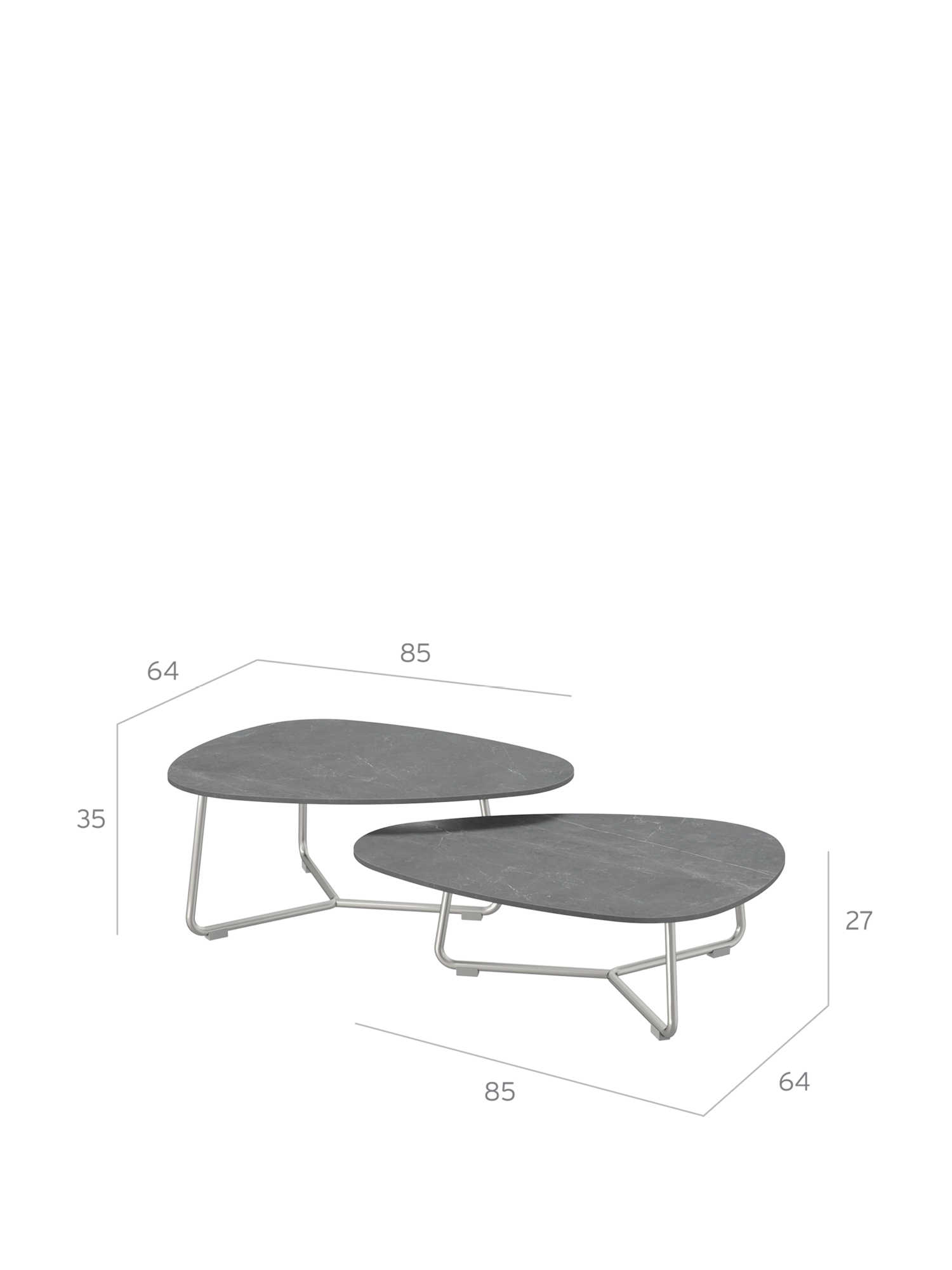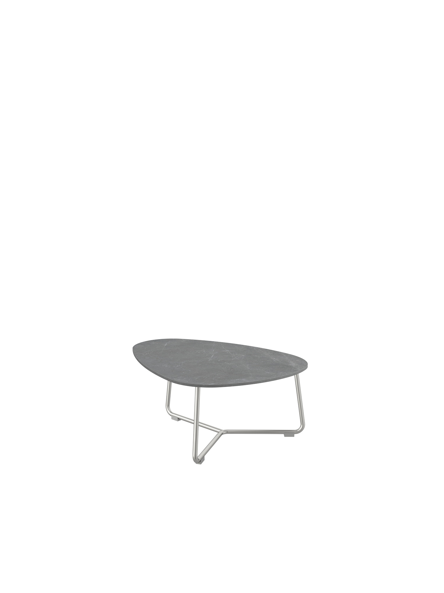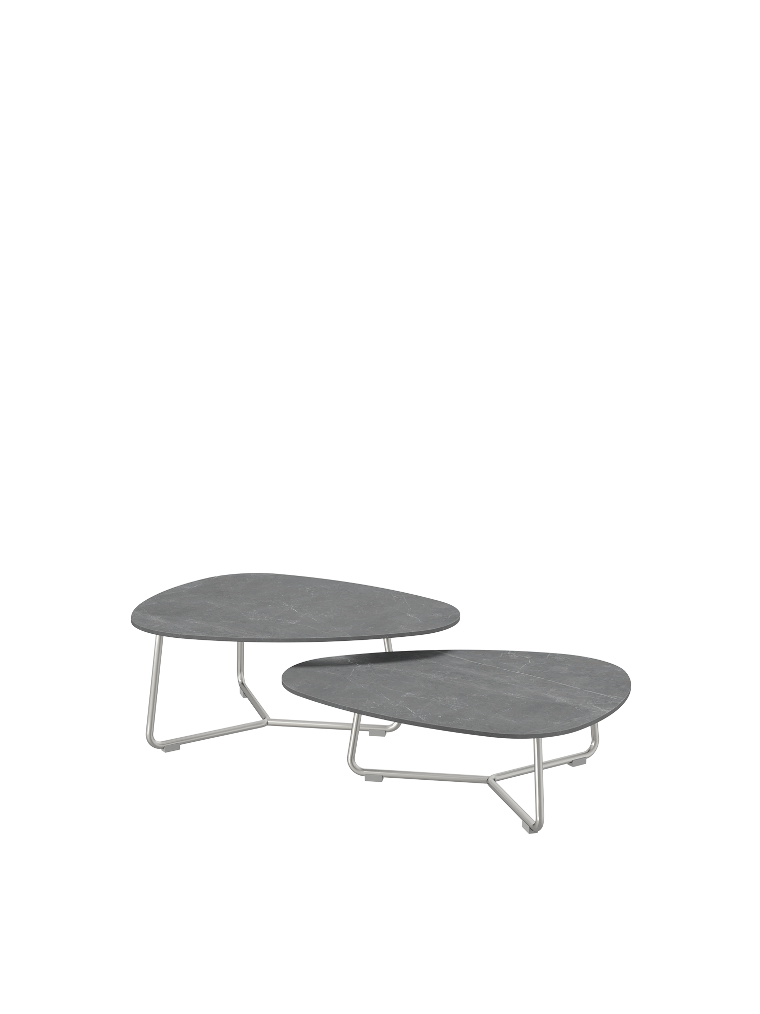 The Lounge Table Set combines a higher and a lower table with ceramic tops of the same size. The asymmetric, rounded shapes allow for flexible and individual variation. Their height is perfectly aligned with that of the lounge furniture. When their long sides are placed parallel to each other, the two lounge tables can be pushed close together or wider apart – depending on how much space is available.
