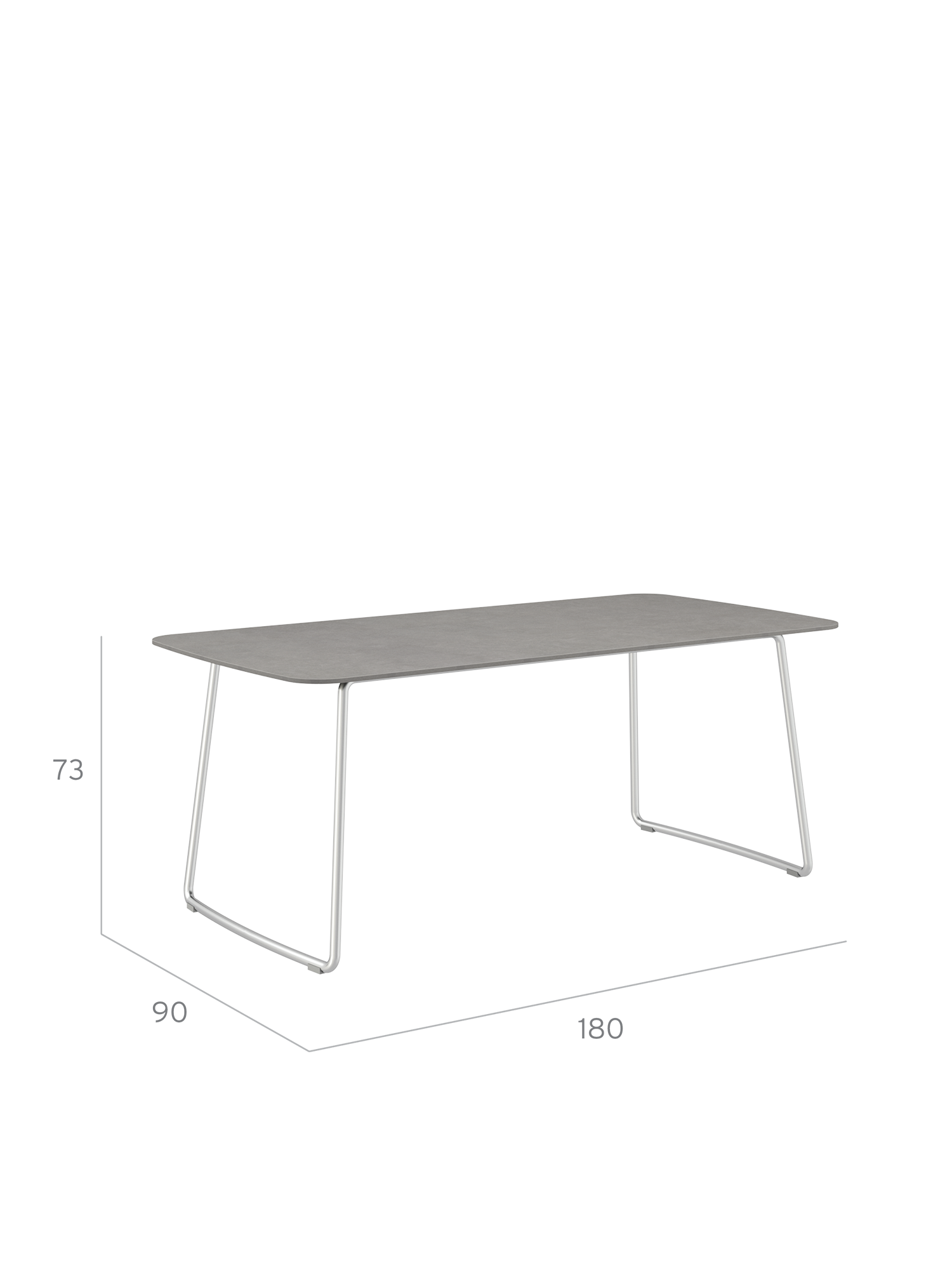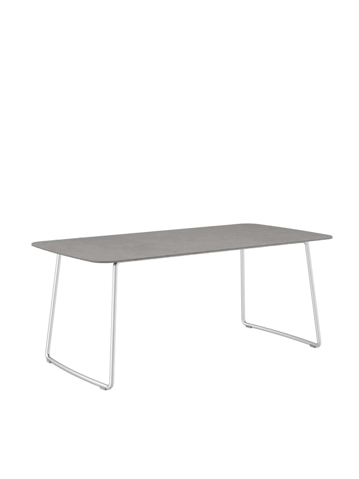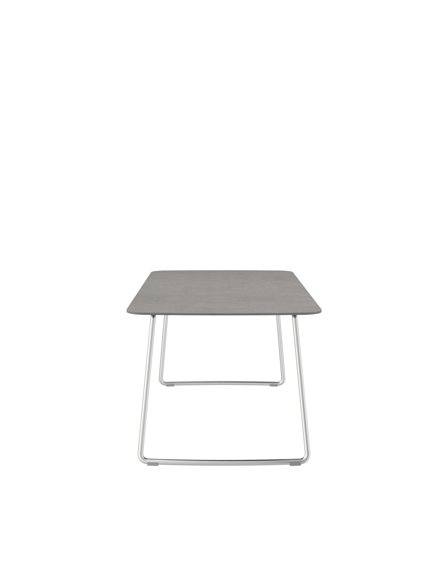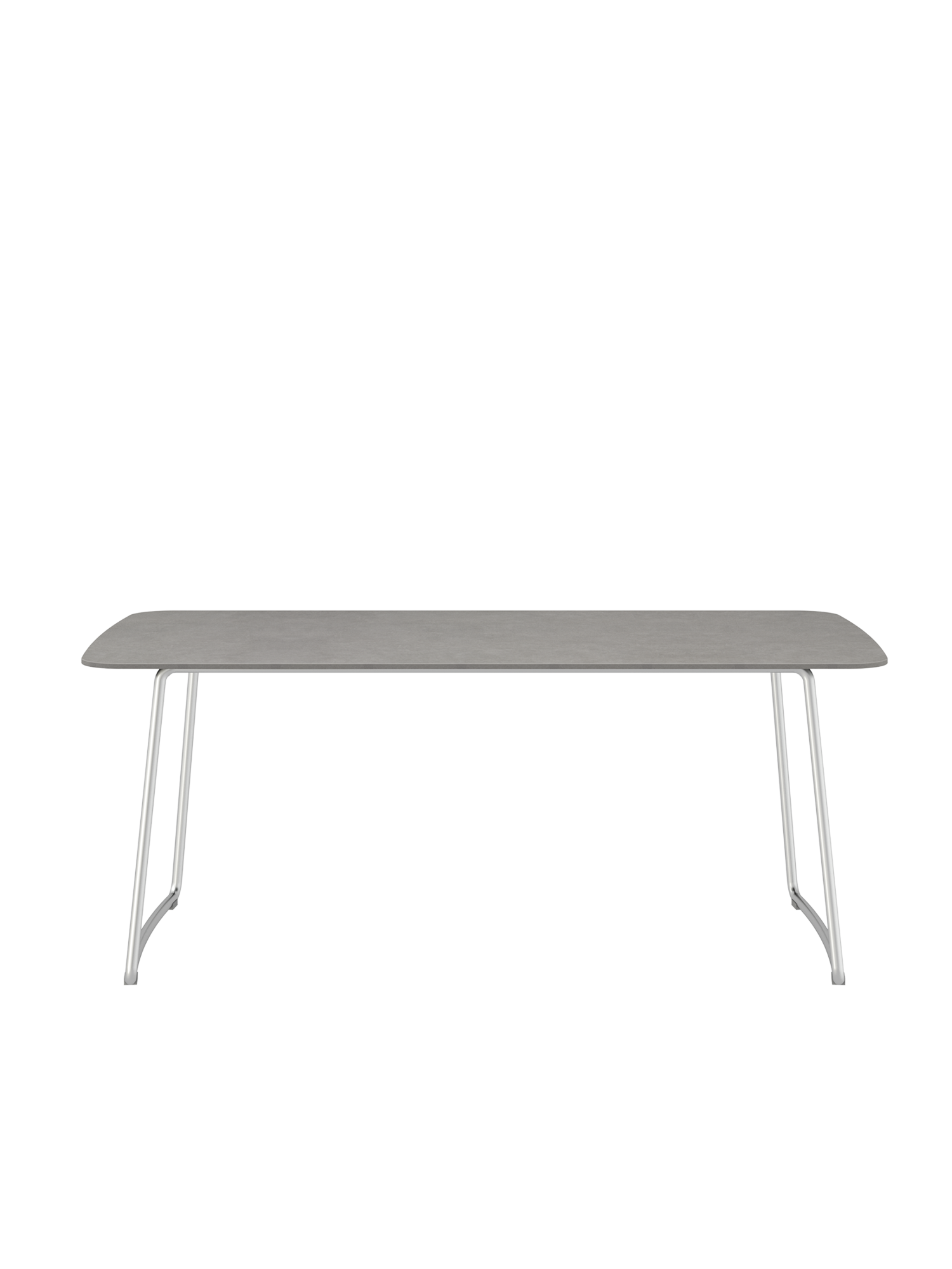 The slim table top made of synthetic resin in the colour Shade is held by the curved stainless steel runners of the table. They also blend harmoniously into the overall appearance of the Amari series. The matching armchairs can simply be pushed under the table after use.