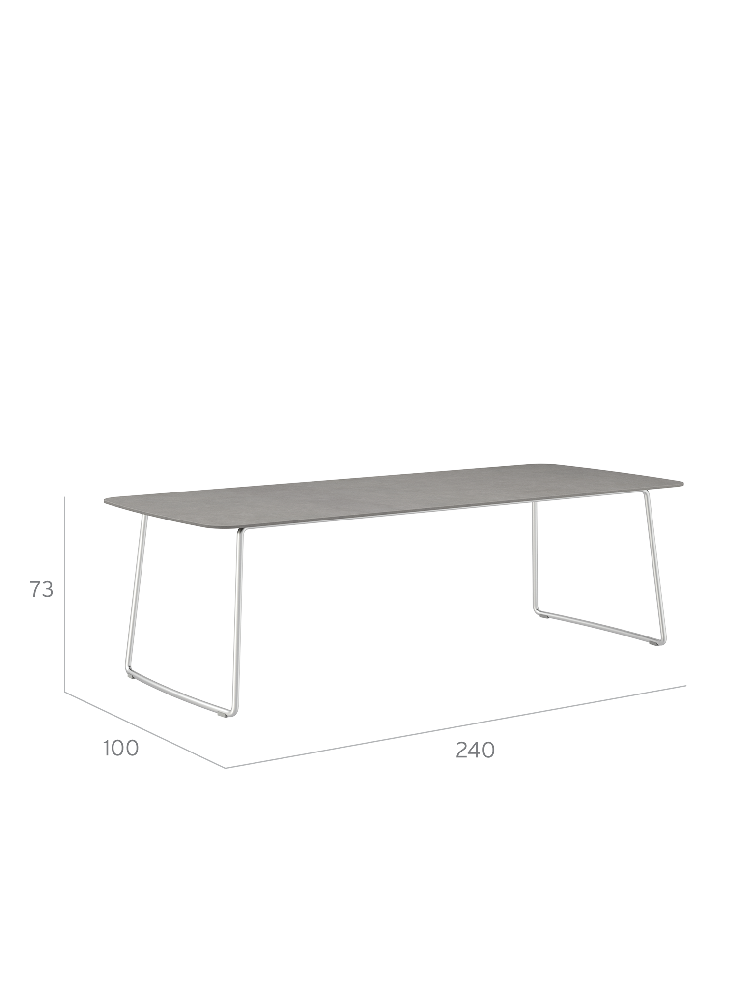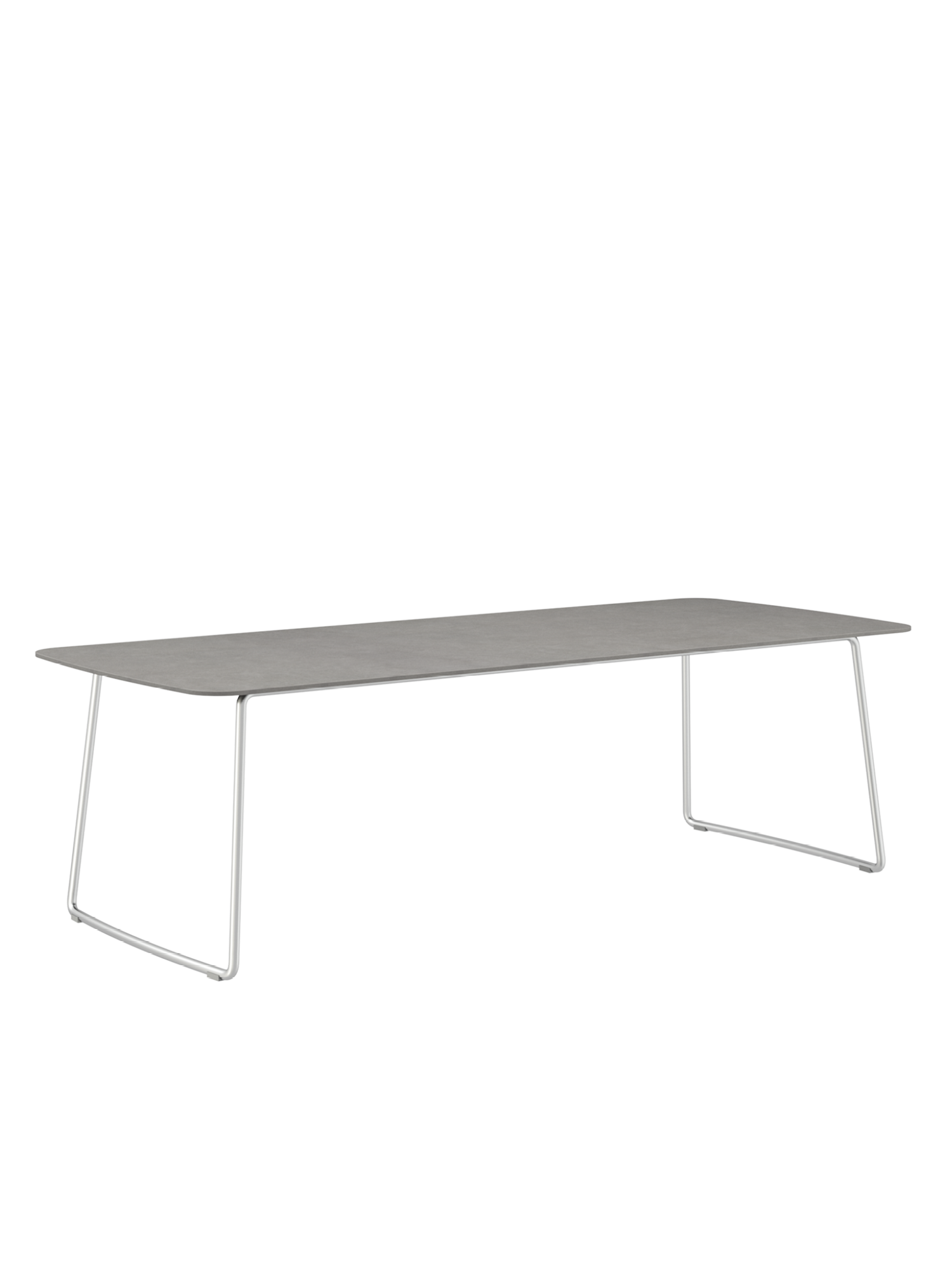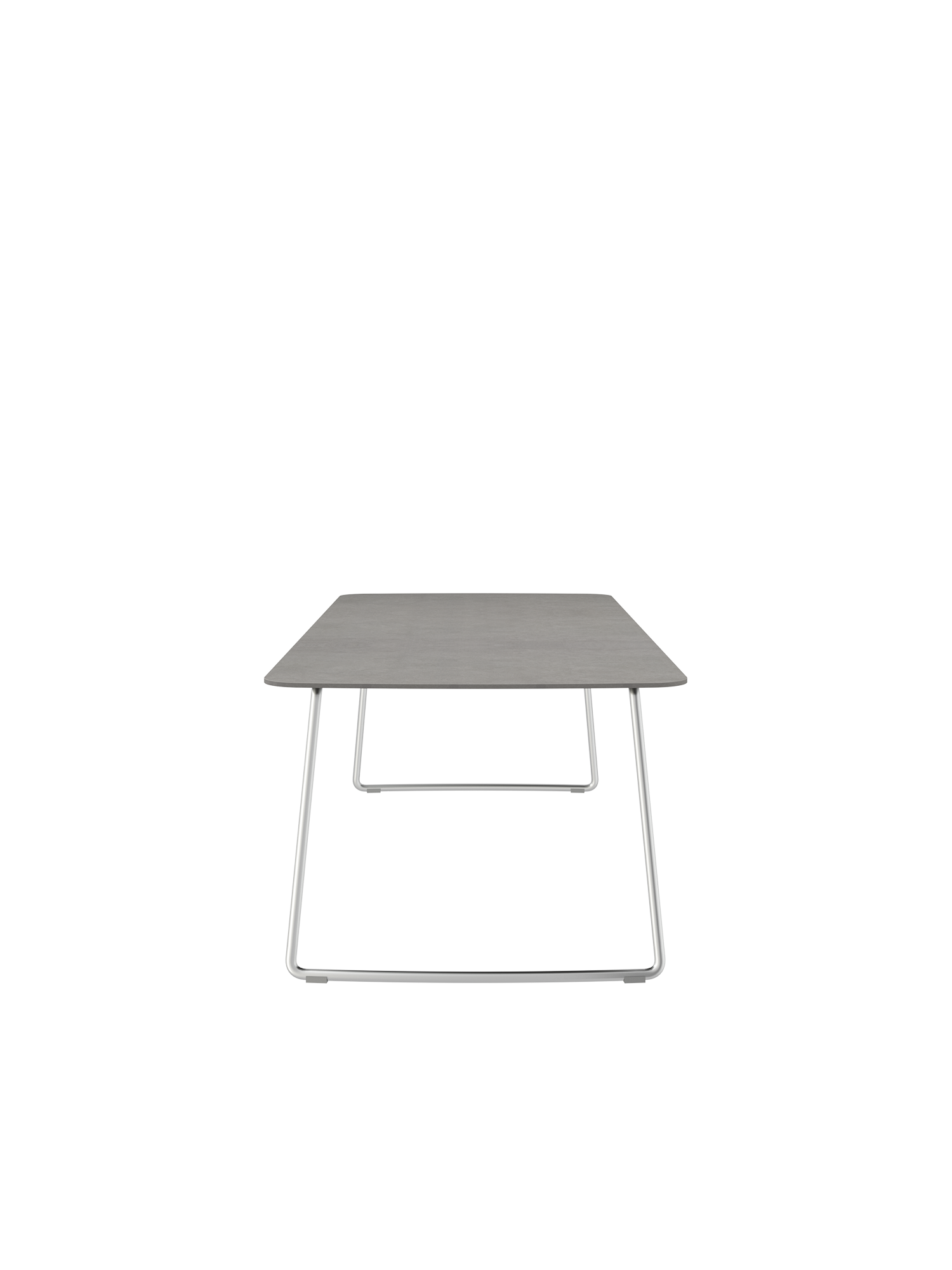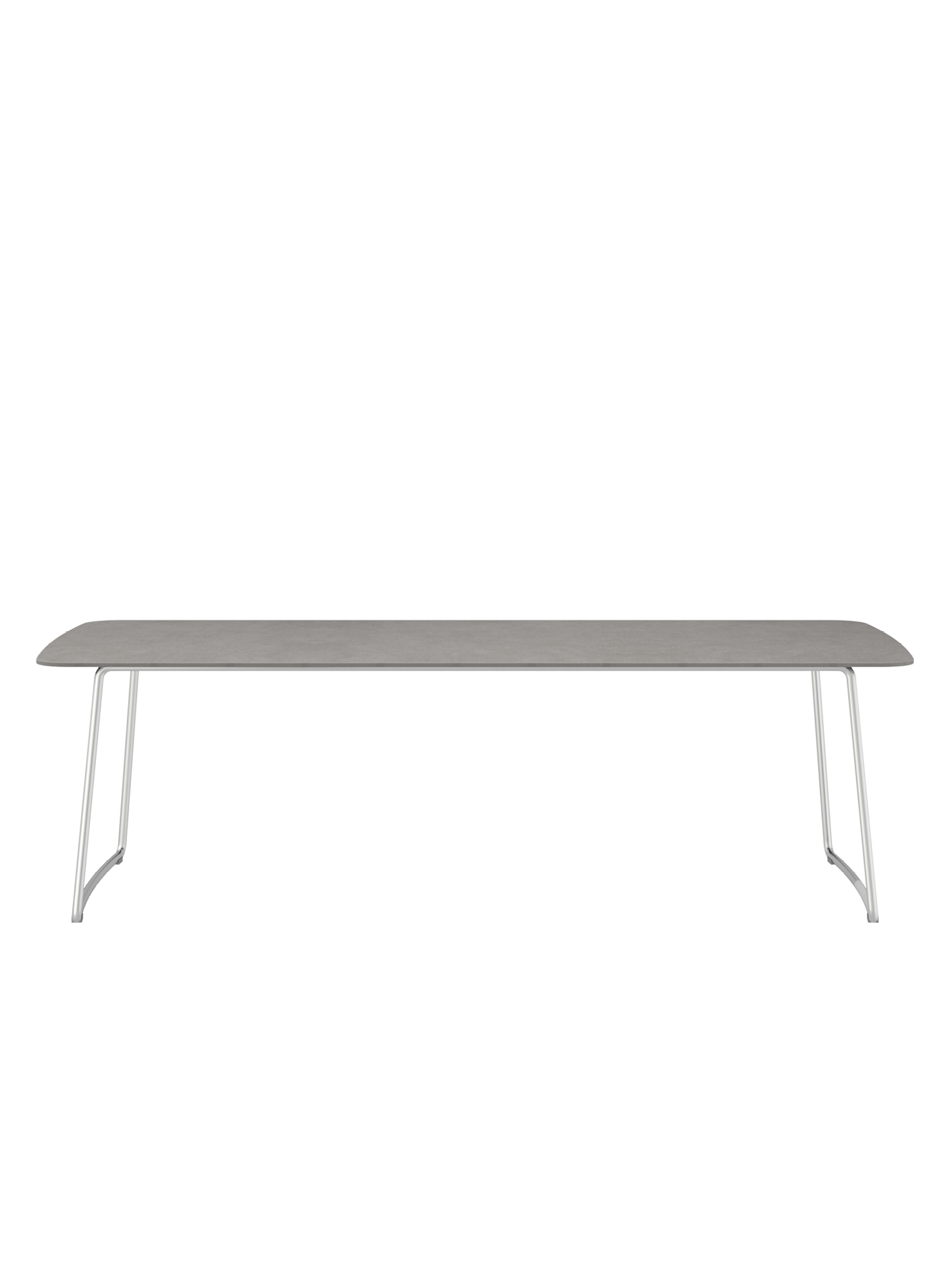 The slim table top made of synthetic resin in the colour Shade is held by the curved stainless steel runners of the table. They also blend harmoniously into the overall appearance of the Amari series. The matching armchairs can simply be pushed under the table after use.