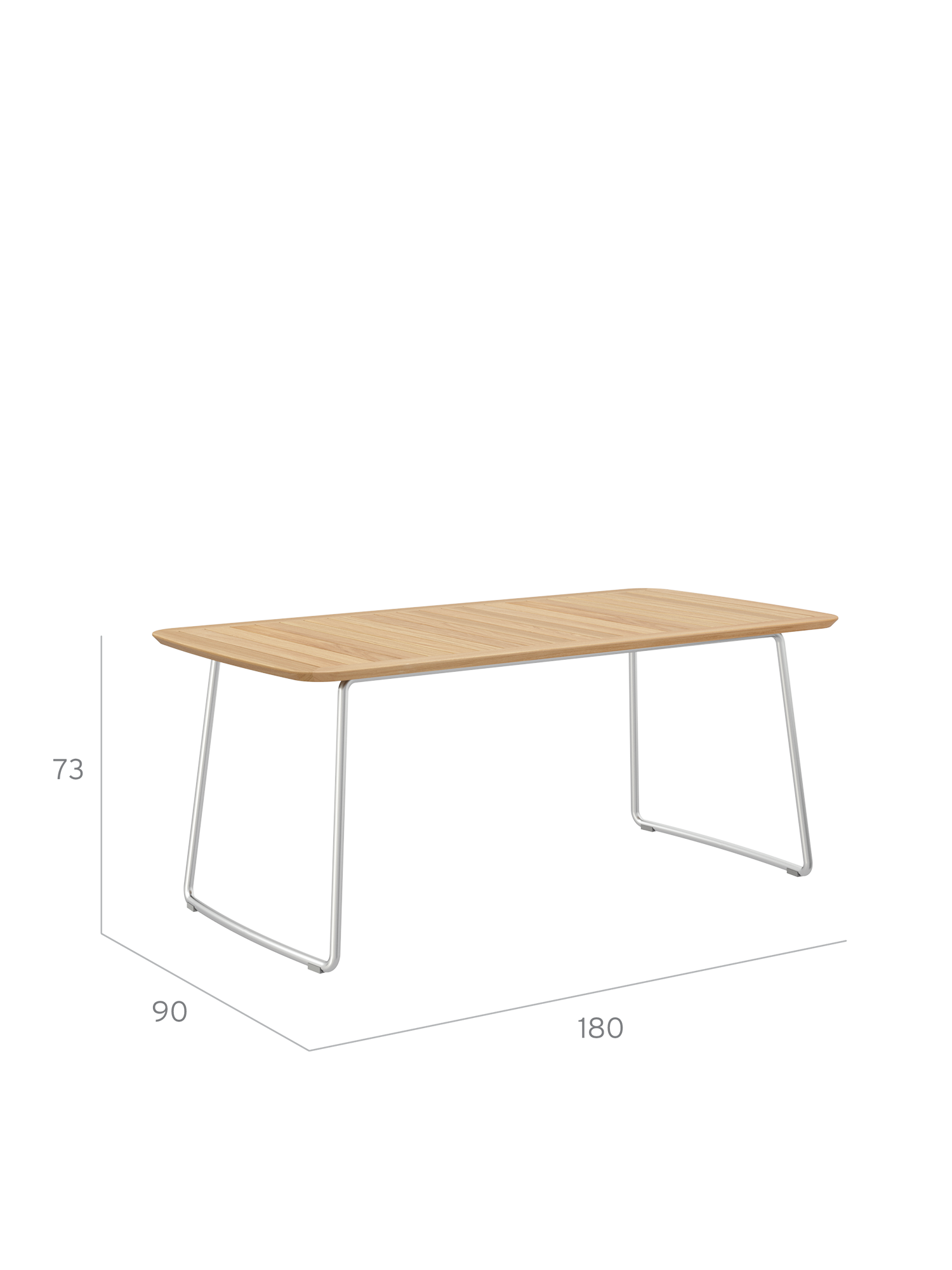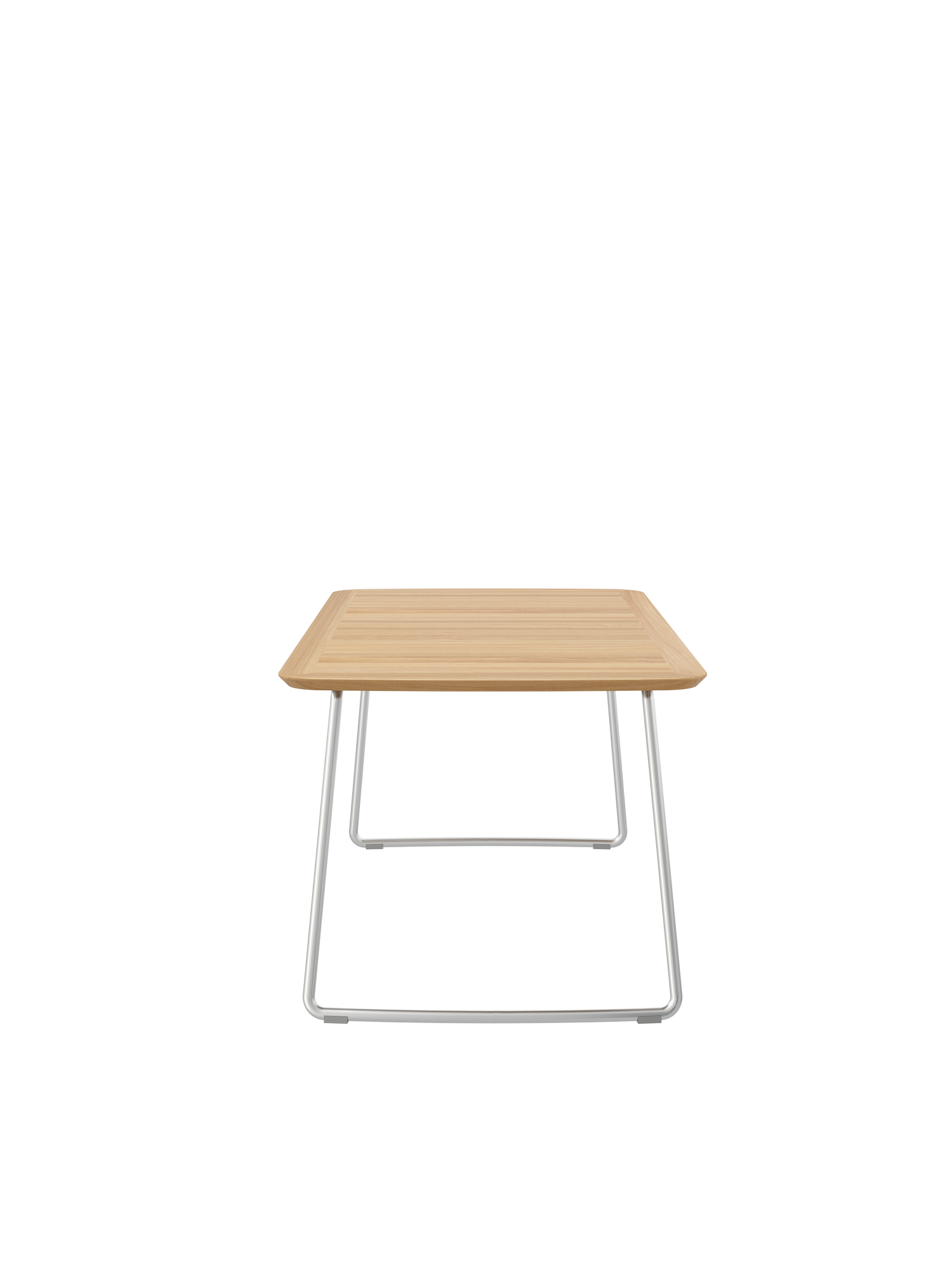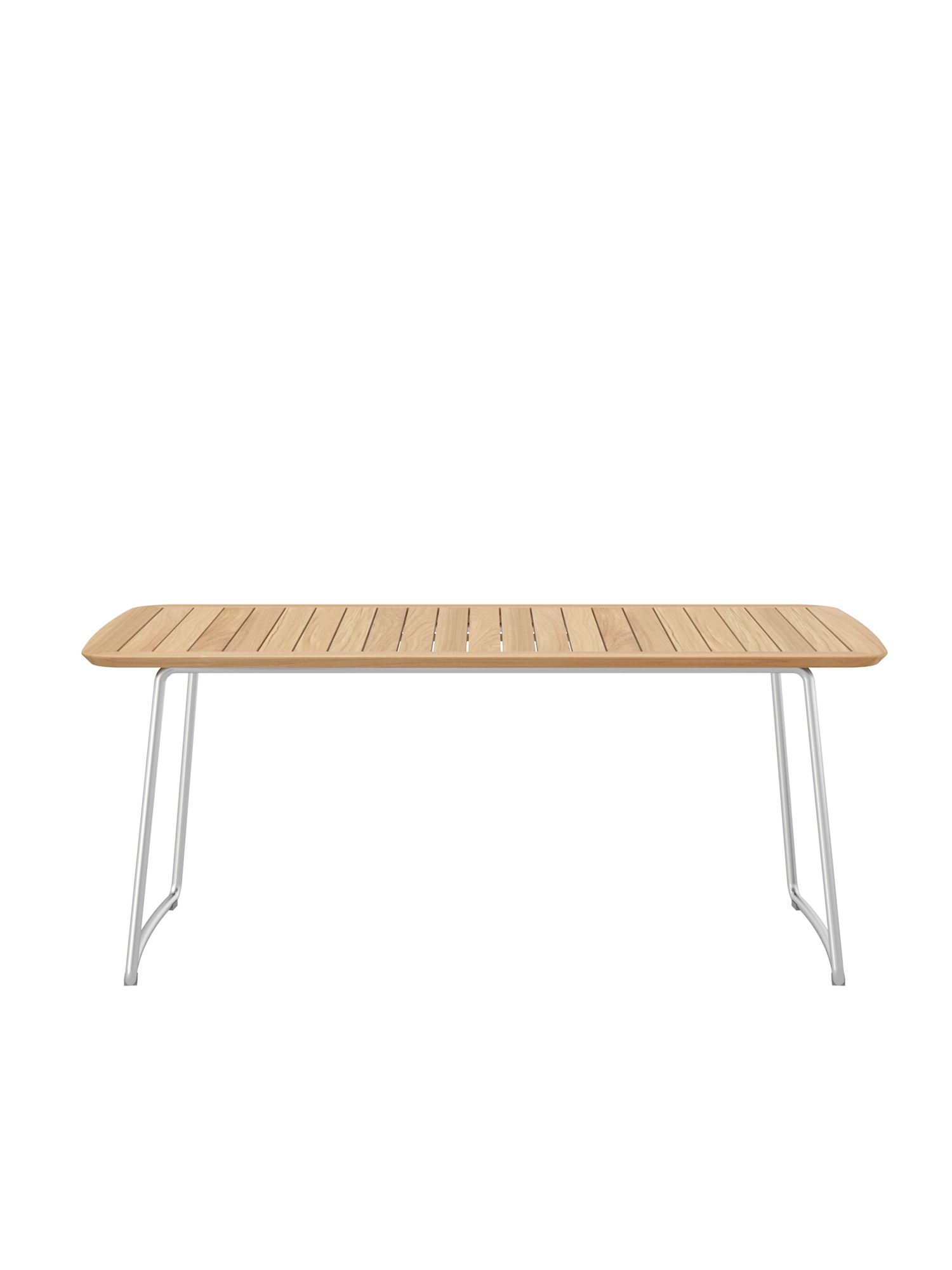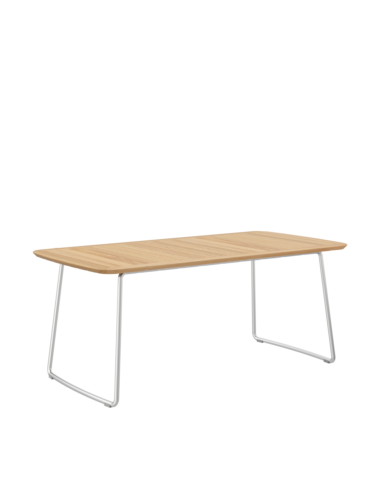 The slim table top made of closely aligned teak slats is held in a frame with meticulously rounded corners. The curved stainless steel runners of the table also blend harmoniously into the overall appearance of the Amari series. The matching armchairs can simply be pushed under the table after use.