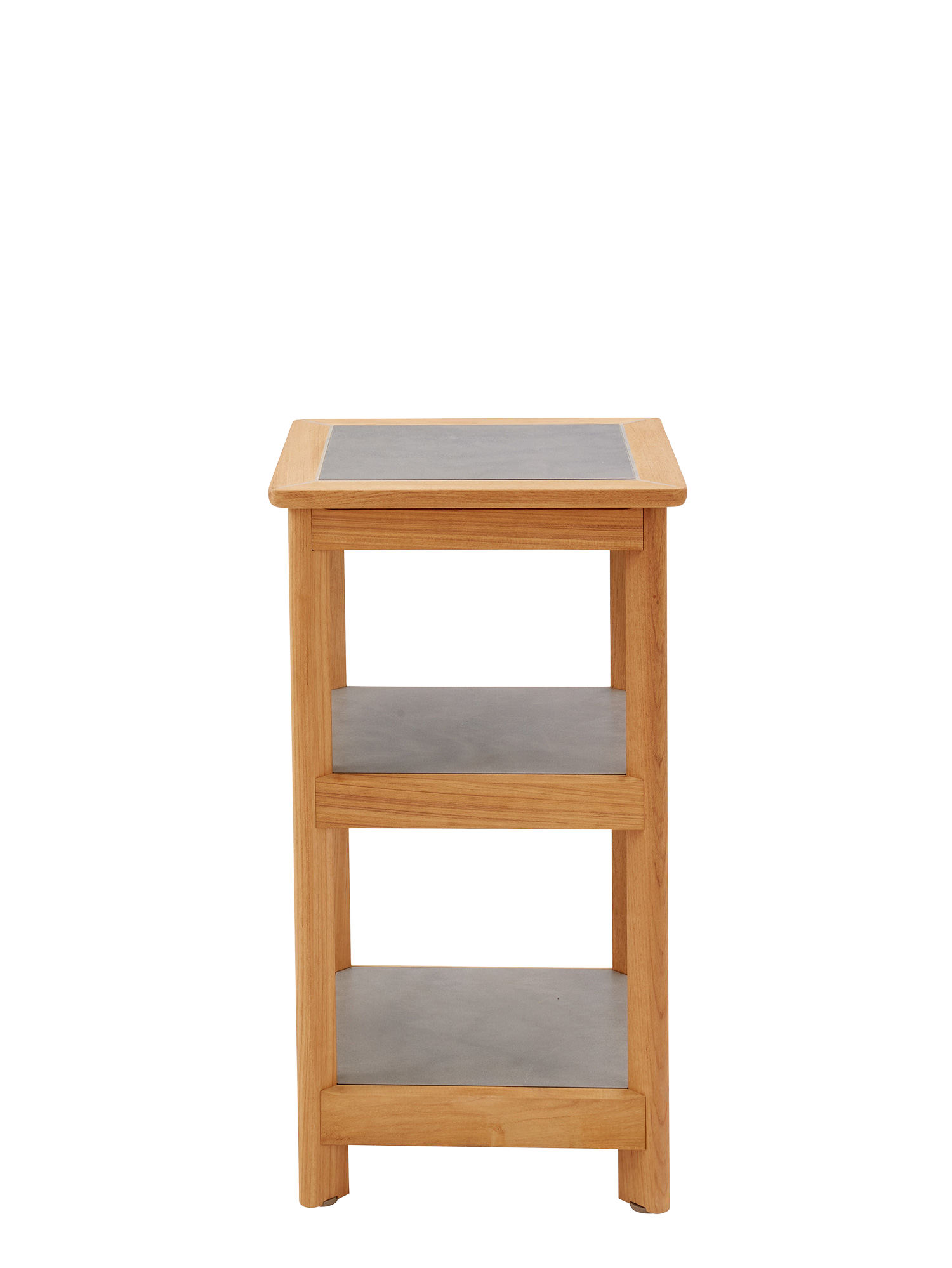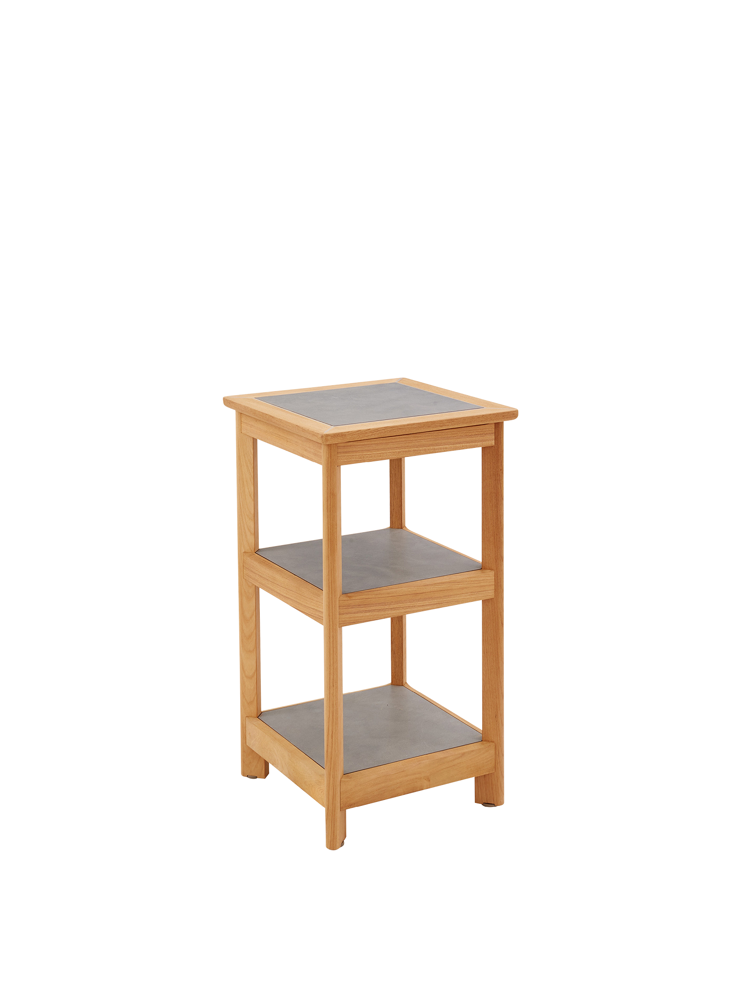 It is useful in the garden or on the balcony as a storage space with ample depth or a place to display decorative objects. The solid frame with the elegant leg and frame construction is made of teak, the shelves are made of synthetic resin with a stone look. Height adjusters level out any unevenness in the floor.