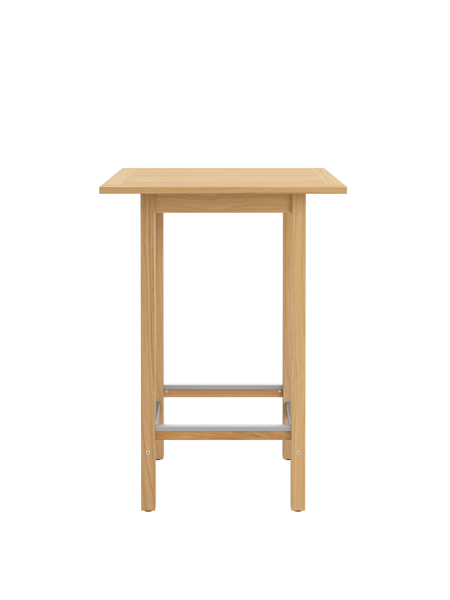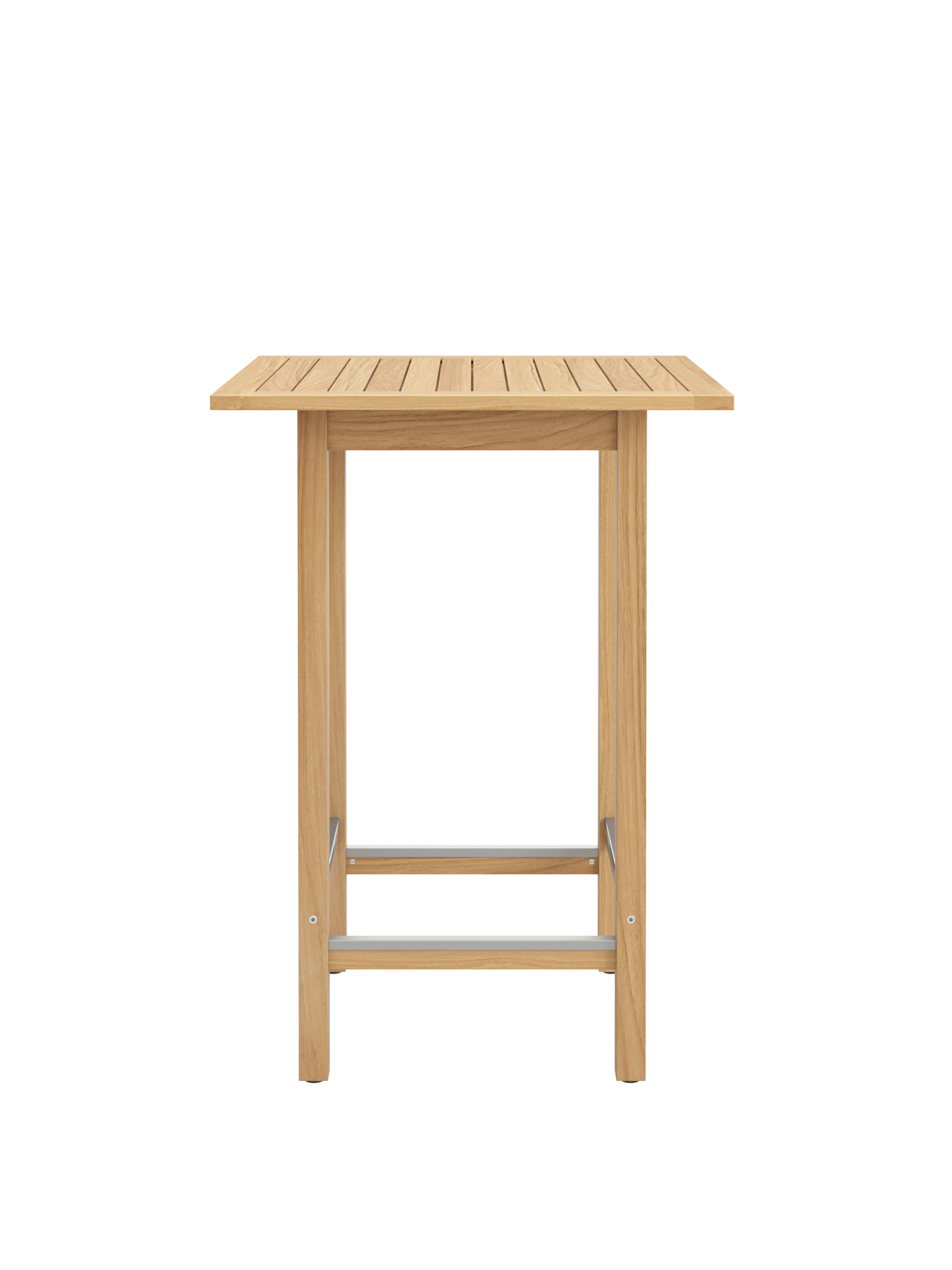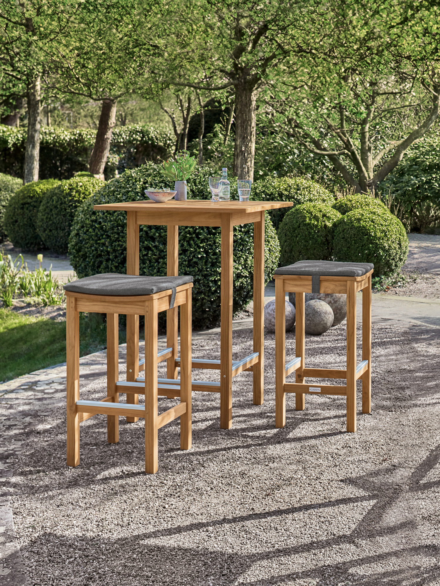 The pared-down design reveals genuine craftsmanship – strong plantation teakwood, ergonomically shaped slats, solid joints. Whether a quick snack or happy hour with friends, the ensemble is an invitation to a casual gathering on the terrace or balcony. The teak supports of both table and matching stool are protected by aluminium profiles and provide a stable foothold.