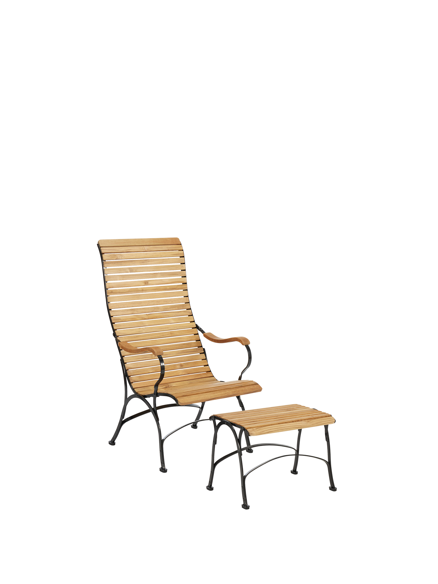The elegantly curved armchair combines classic design with contemporary ergonomics. A stool completes the ensemble.