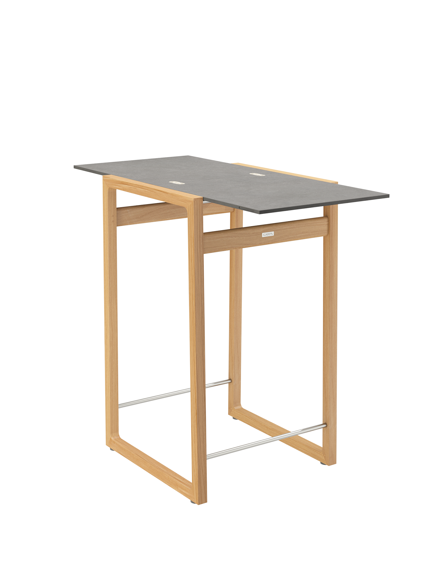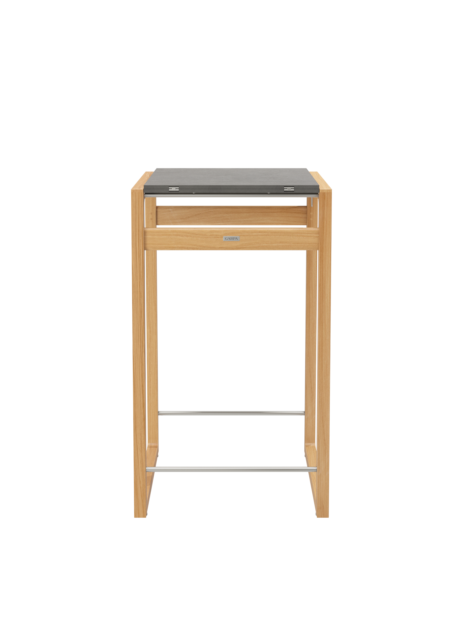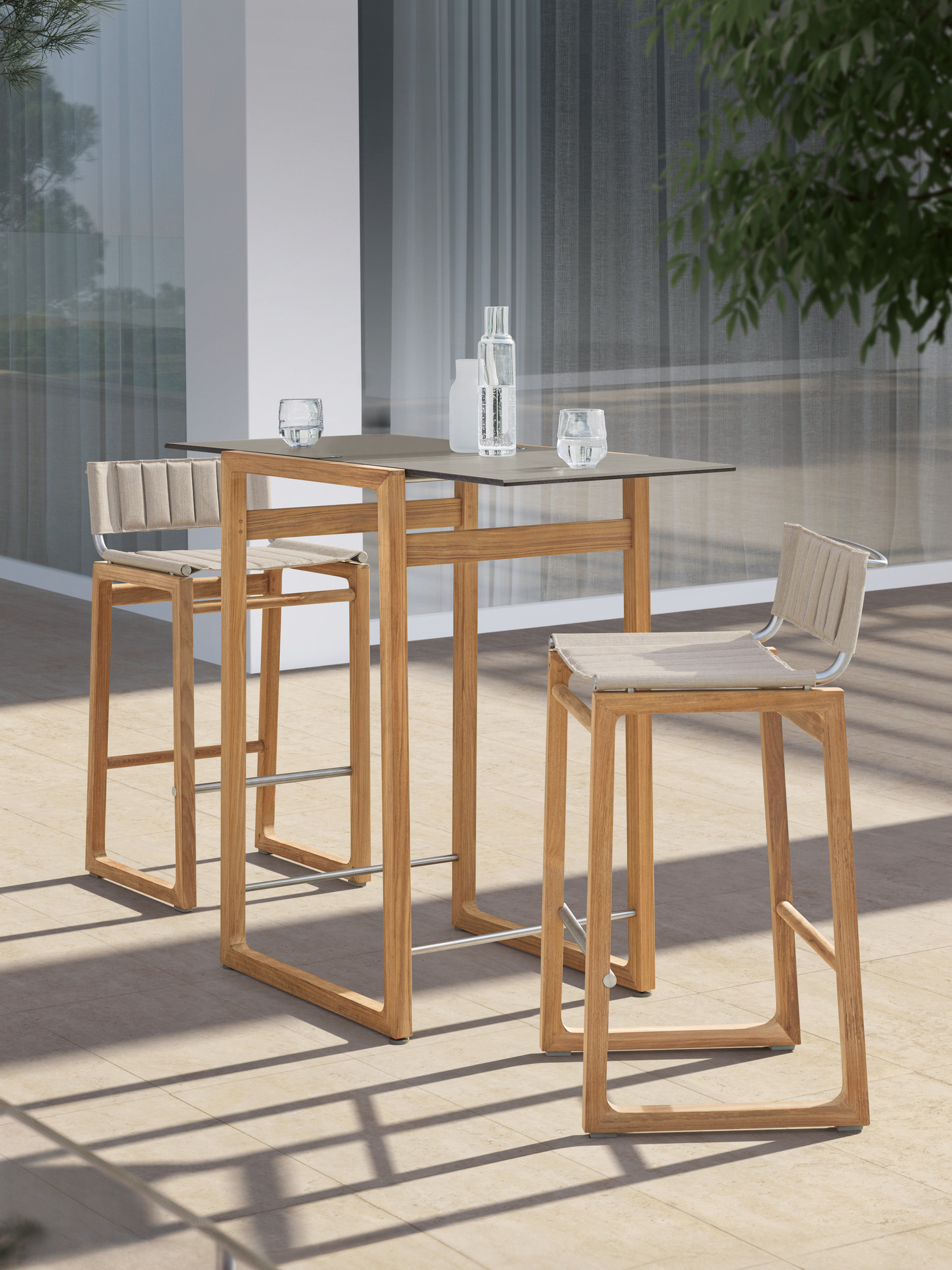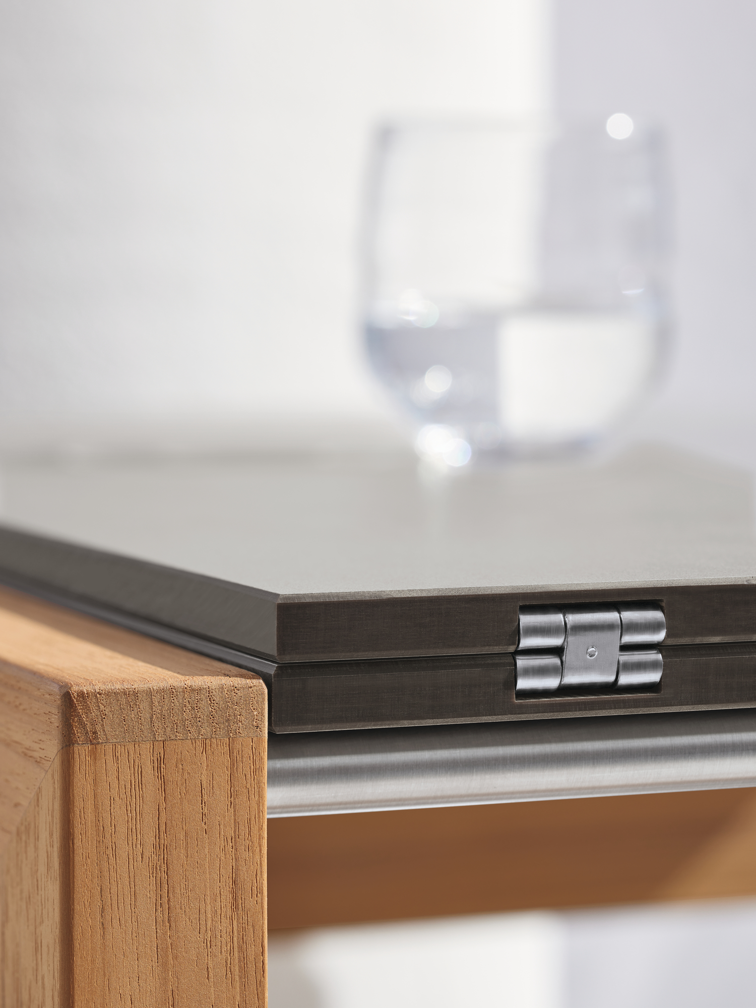 The Benton bar table, which folds out intuitively, offers space for up to four people – standing, or seated on the exceedingly comfortable bar stools of the series. When not folded out, the tabletop – in classic Benton fashion – closes in perfect alignment with the base. The bar table is suitable not only for alfresco drinks, but also for a delicious dinner for two.