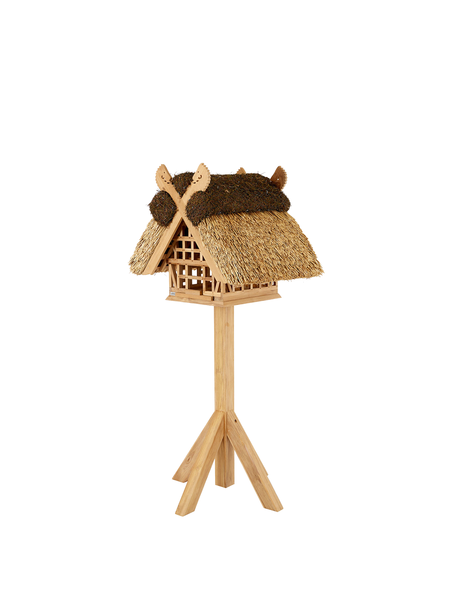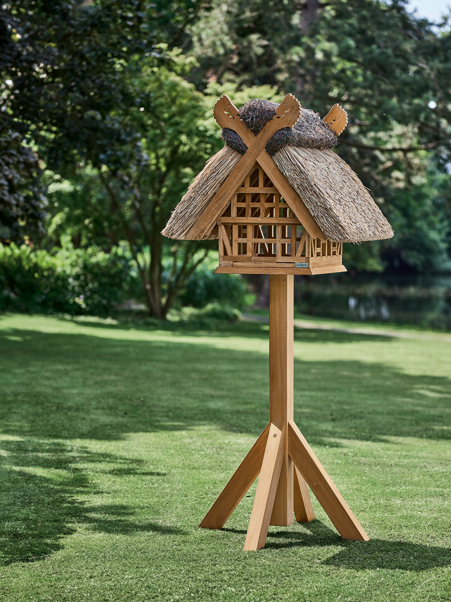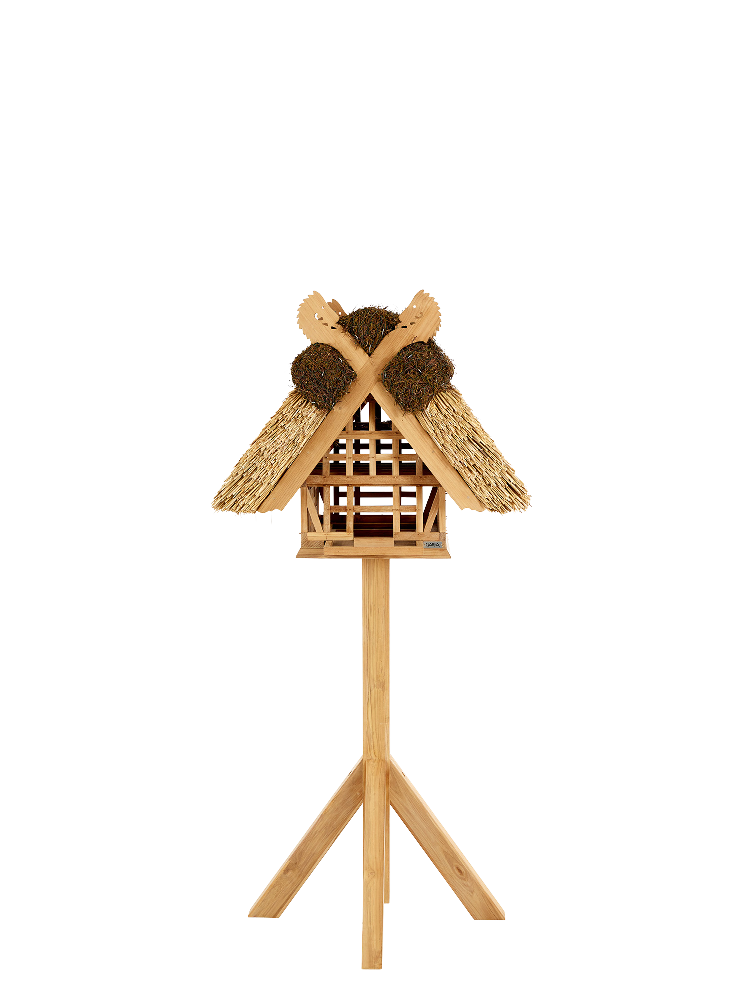 A birdhouse brings life into the garden and pleasure to the observer. The framework is handcrafted, the floor panel can be pulled out like a drawer. The thatched roof is likewise handcrafted and is typically Northern German - right down to the crossed horse heads.