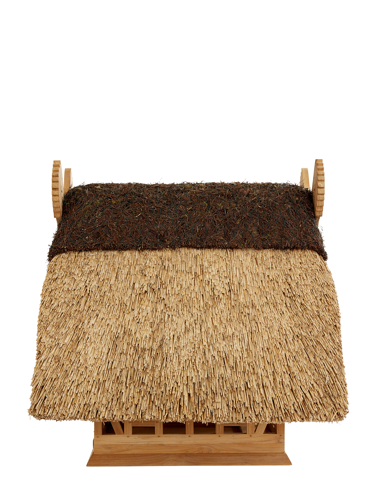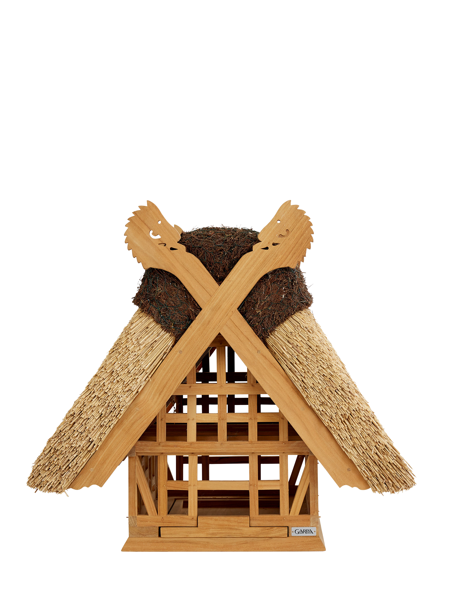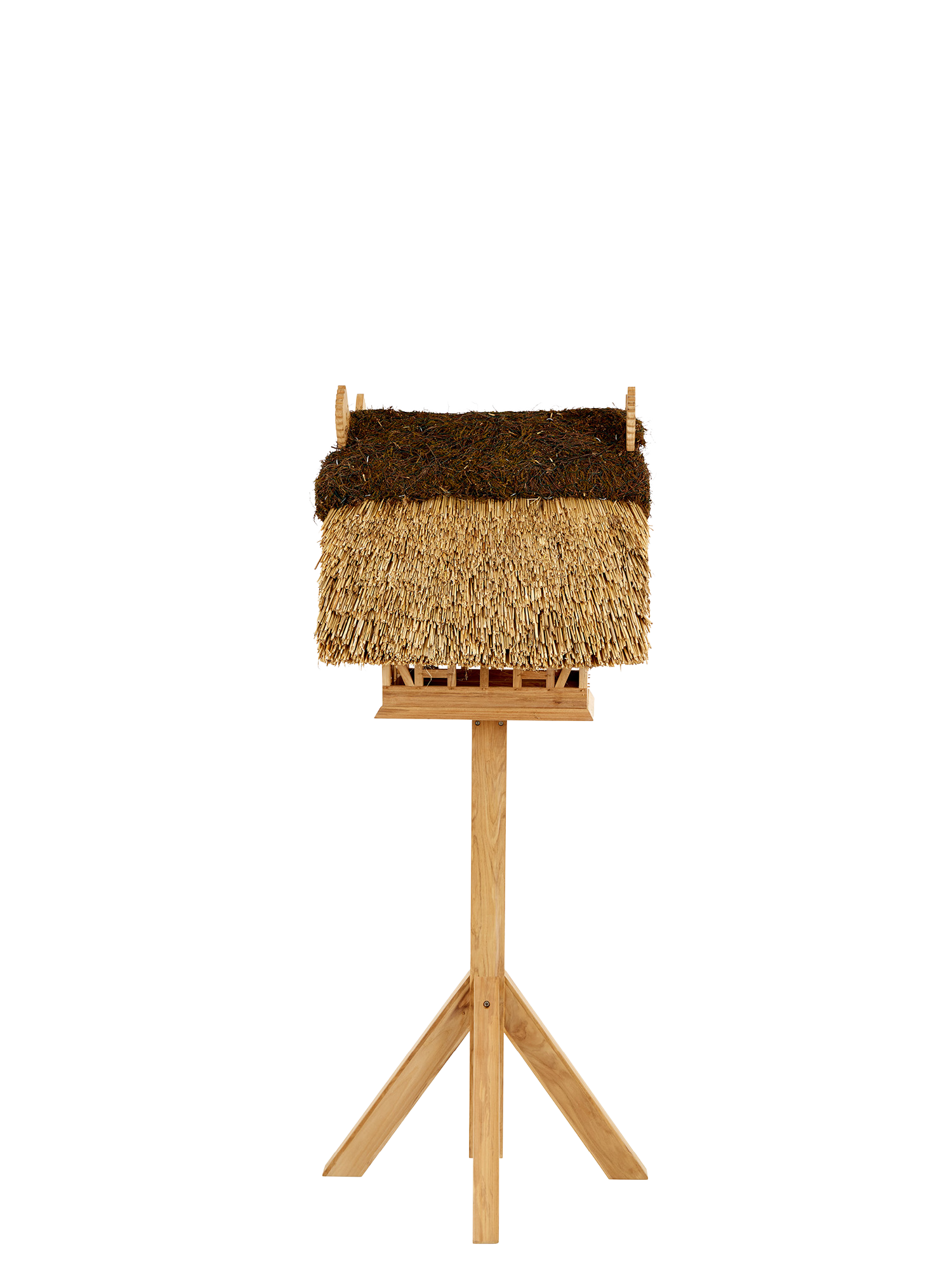 A birdhouse brings life into the garden and pleasure to the observer. The framework is handcrafted, the floor panel can be pulled out like a drawer. The thatched roof is likewise handcrafted and is typically Northern German - right down to the crossed horse heads.