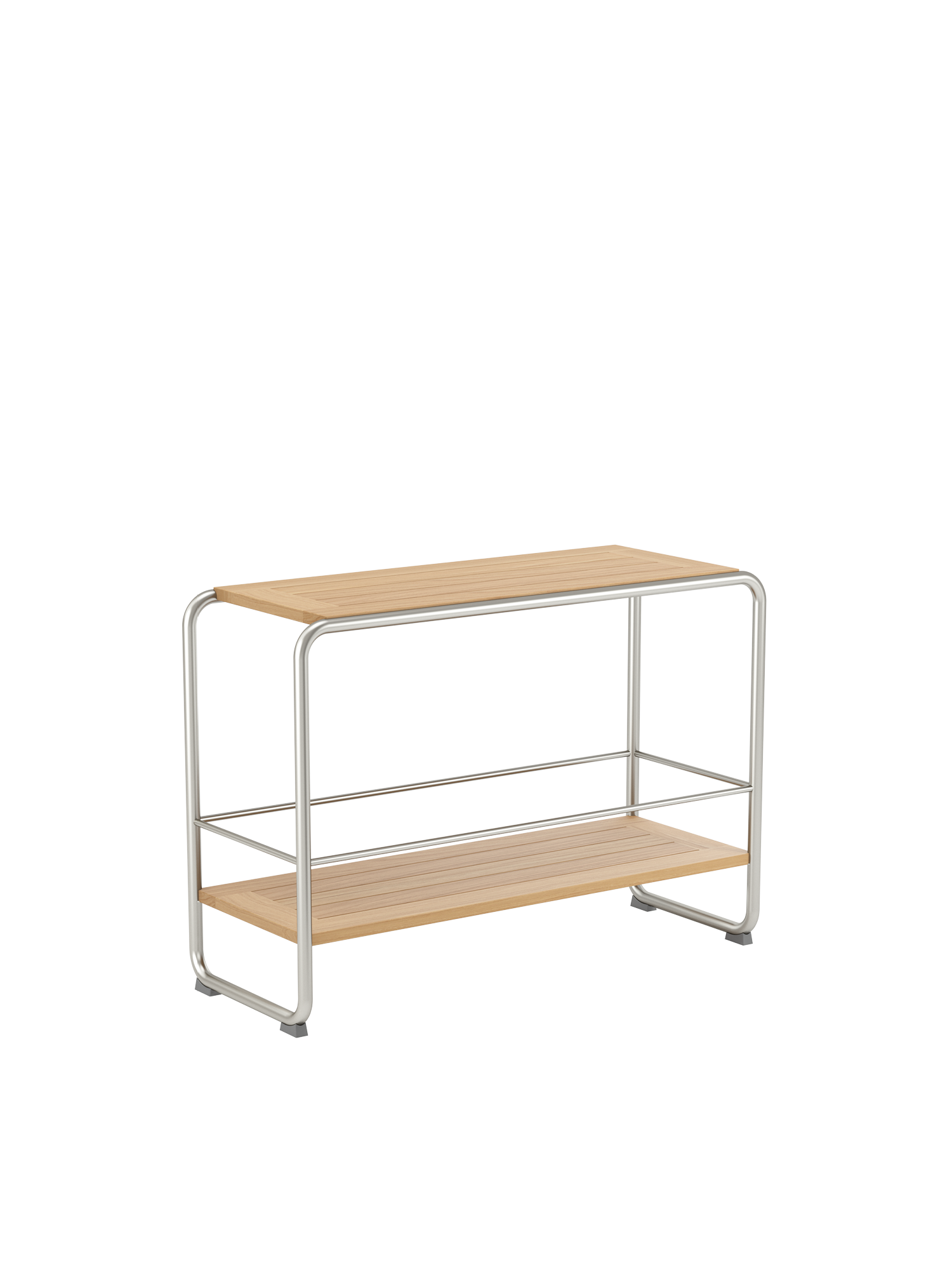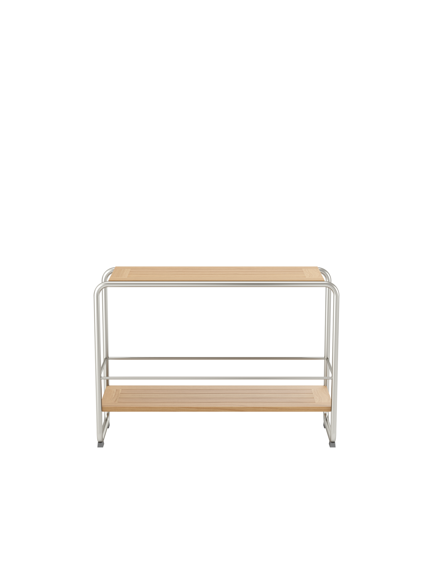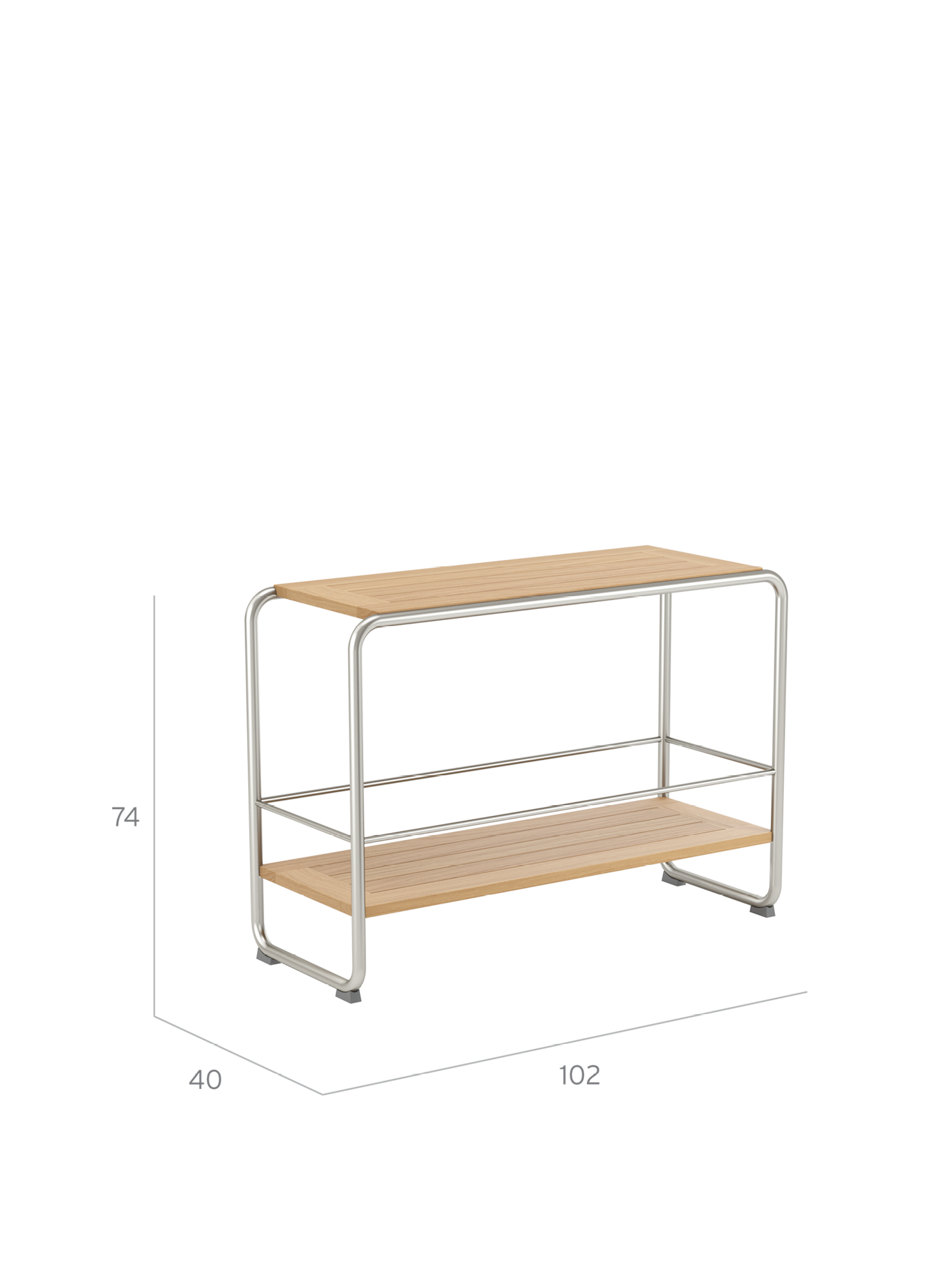 The pedigree is unmistakeable: with the curves of the tubular frame made of satinised stainless steel, the console table perfectly matches the Bauhaus inspired aesthetics of the Bolero furniture collection. Two teak slatted surfaces offer convenient space on two levels for tableware or drinks.