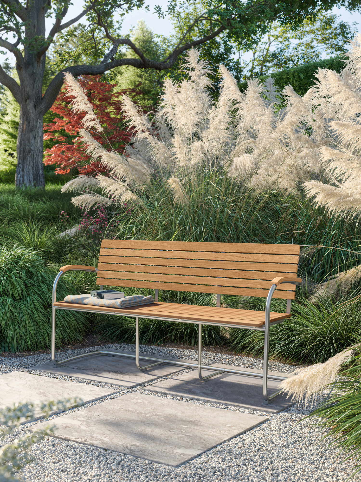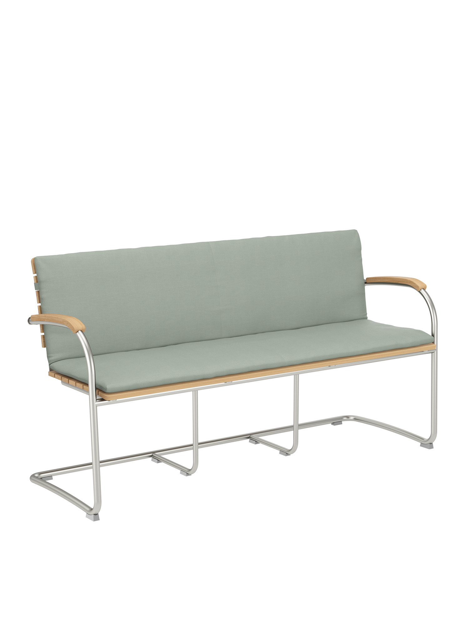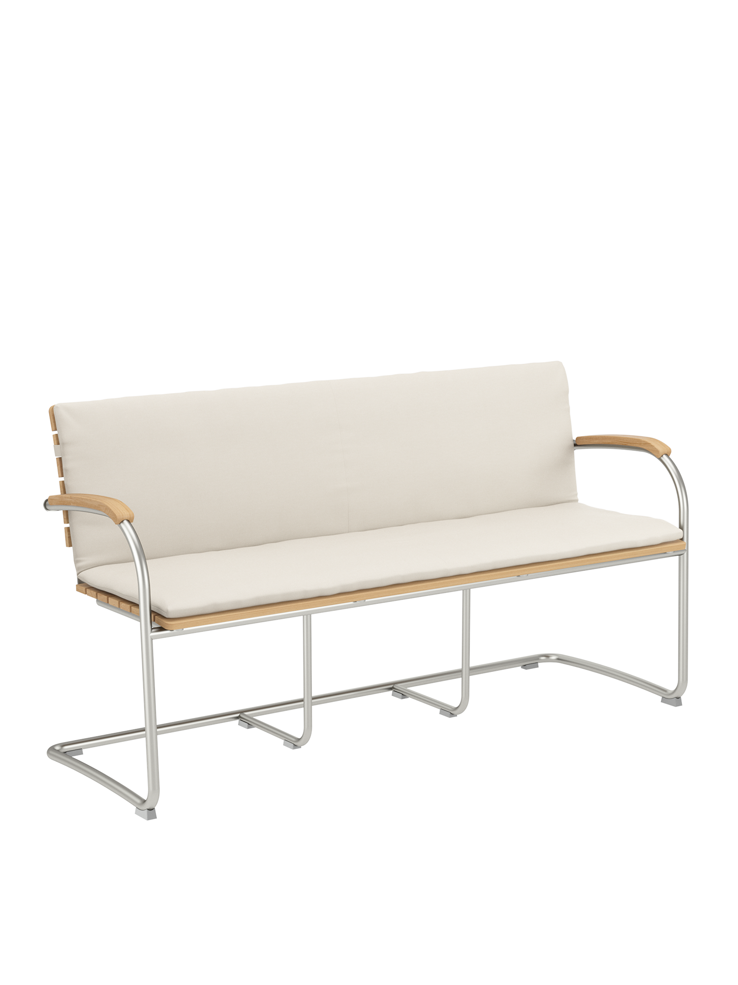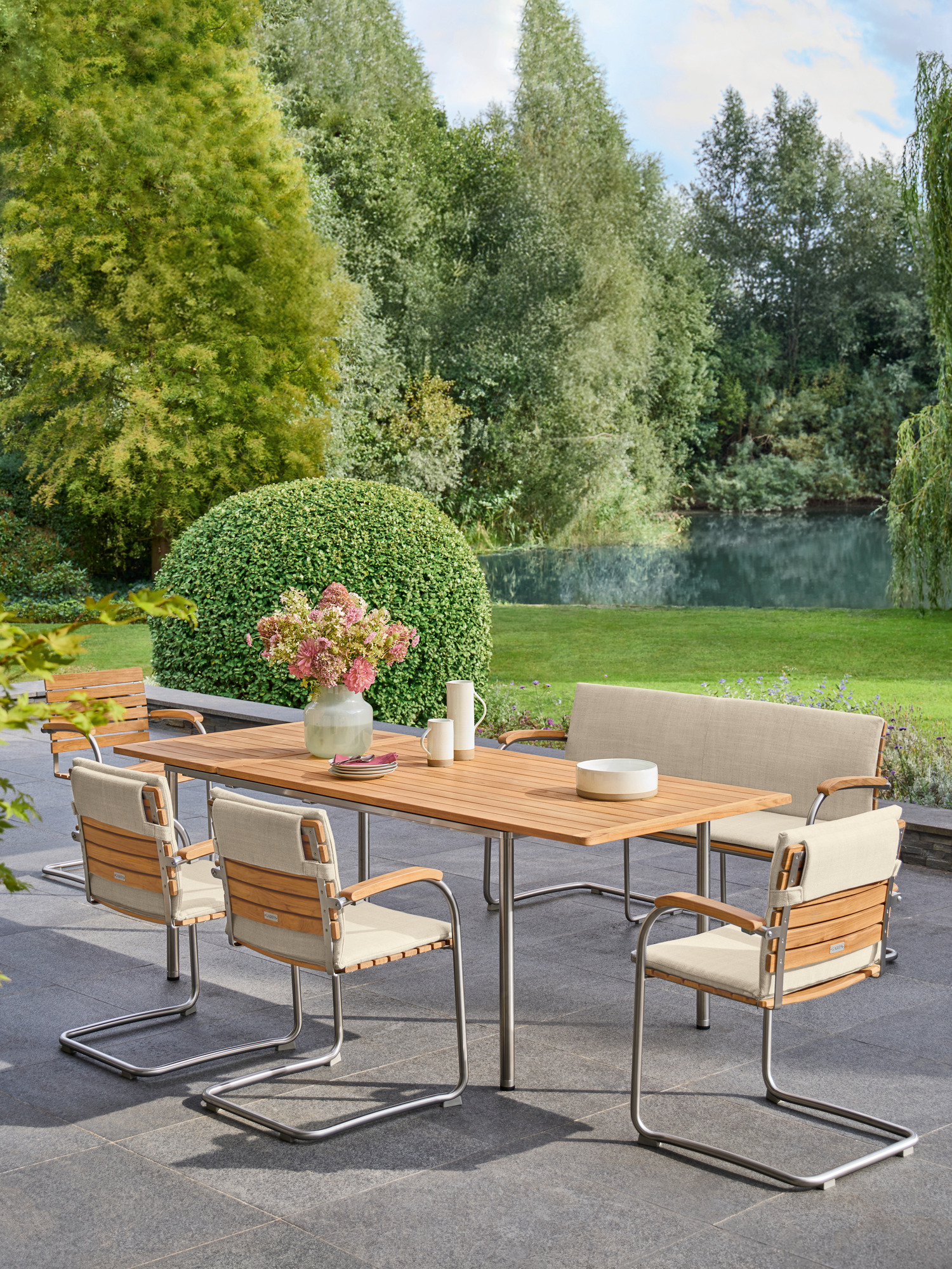 In the Bauhaus inspired furniture series Bolero, elegant metal and warm teak ideally complement each other. The seat and backrest of the teak bench are ergonomically shaped and ensure the highest comfort. The tubular frame is of satinised stainless steel, and is absolutely weatherproof. The curved armrests of teak correspond to its profile and are pleasant to the touch. Cushions in various colours increase the comfort of the furniture and set fine accents.