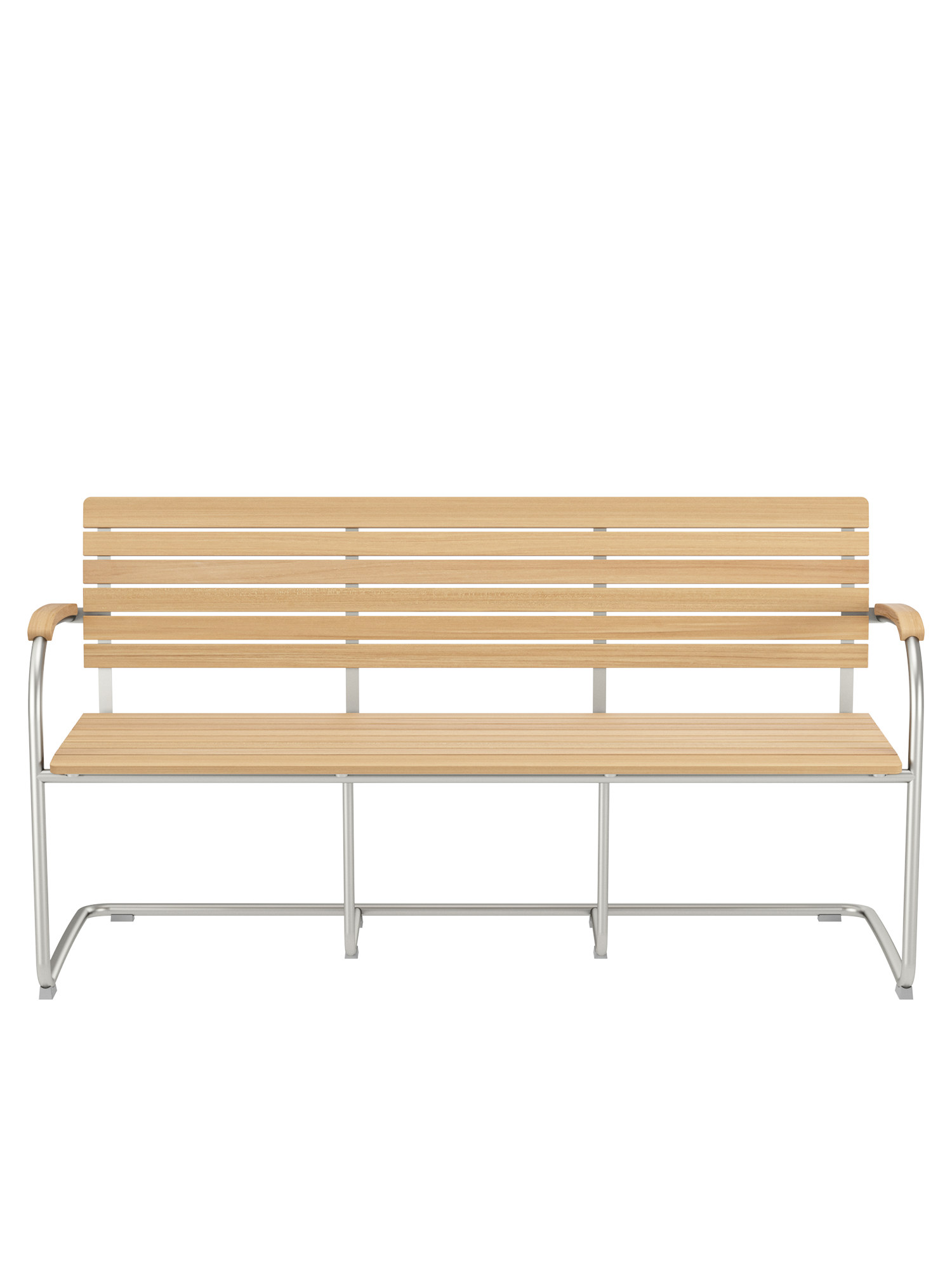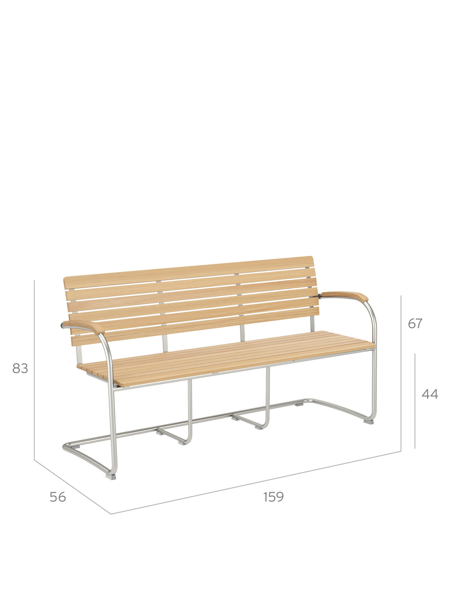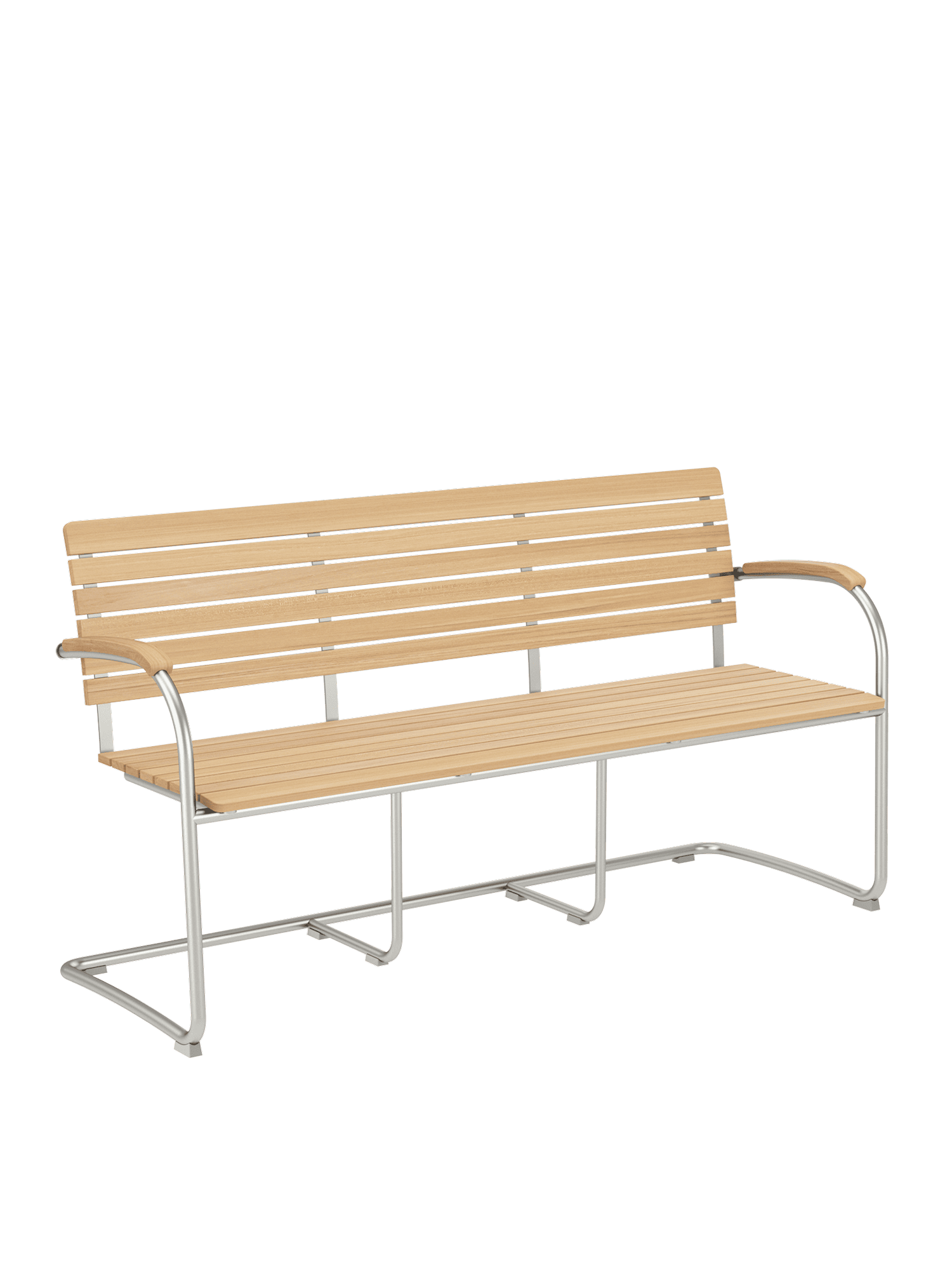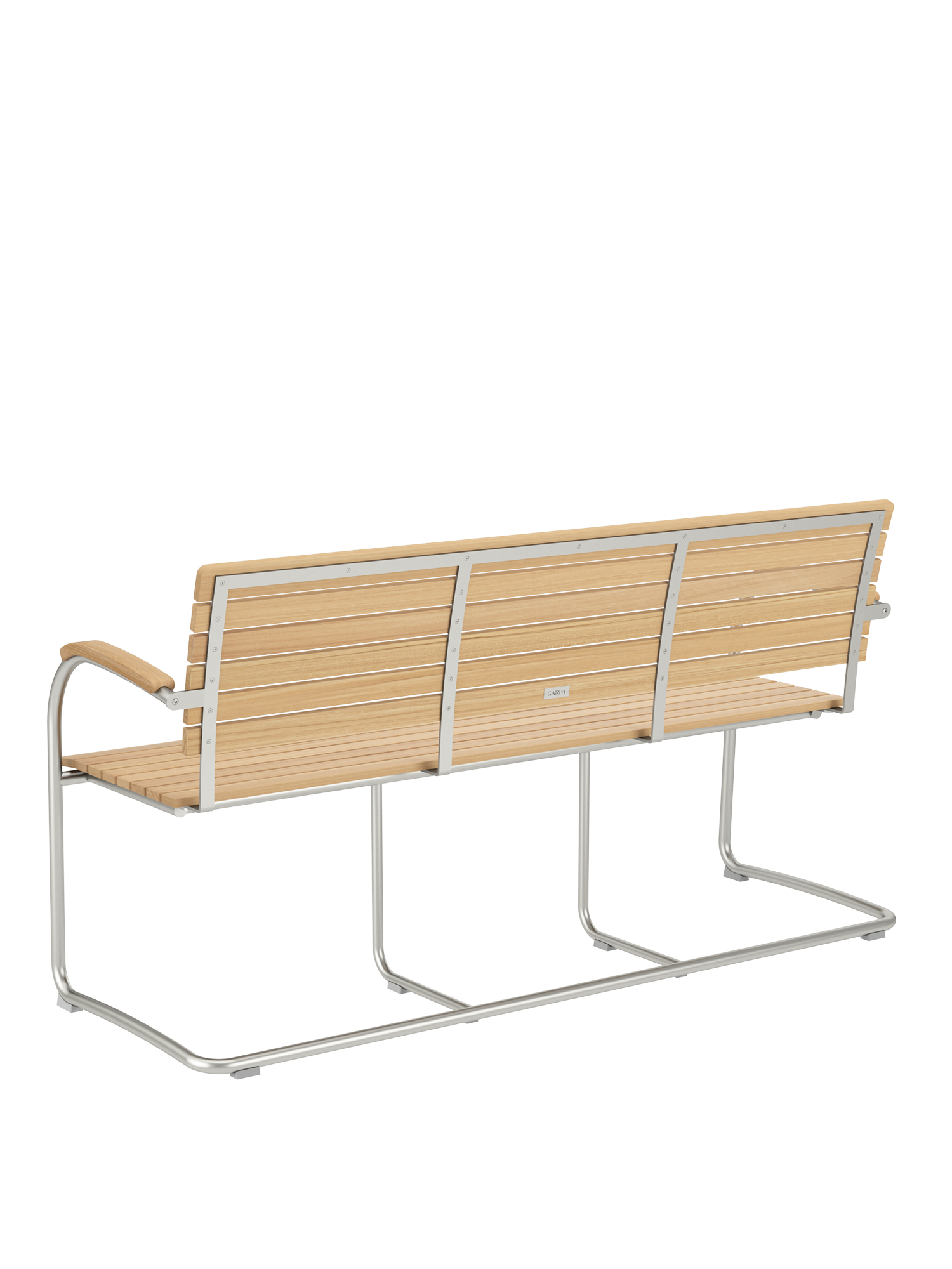 In the Bauhaus inspired furniture series Bolero, elegant metal and warm teak ideally complement each other. The seat and backrest of the teak bench are ergonomically shaped and ensure the highest comfort. The tubular frame is of satinised stainless steel, and is absolutely weatherproof. The curved armrests of teak correspond to its profile and are pleasant to the touch. Cushions in various colours increase the comfort of the furniture and set fine accents.
