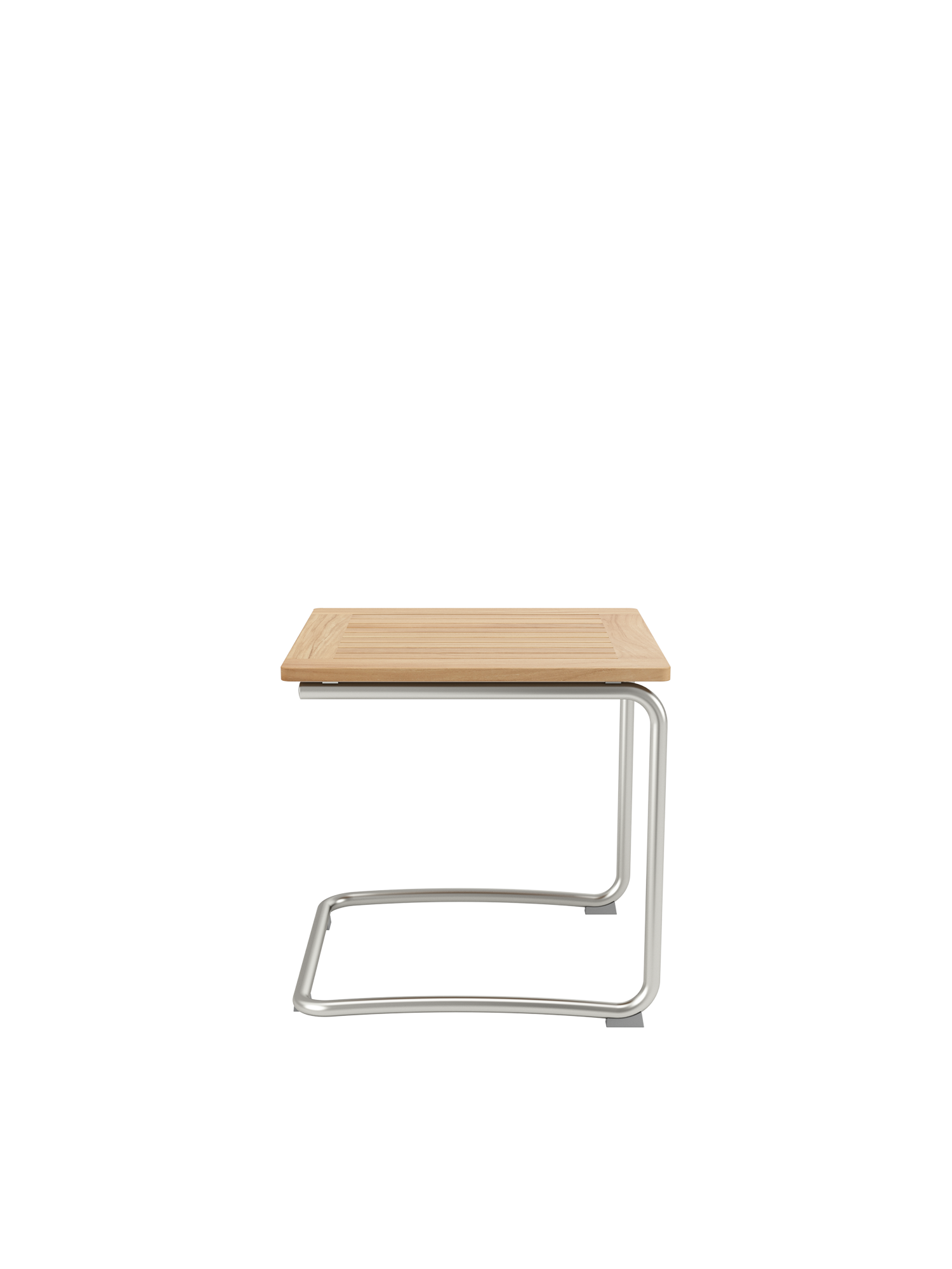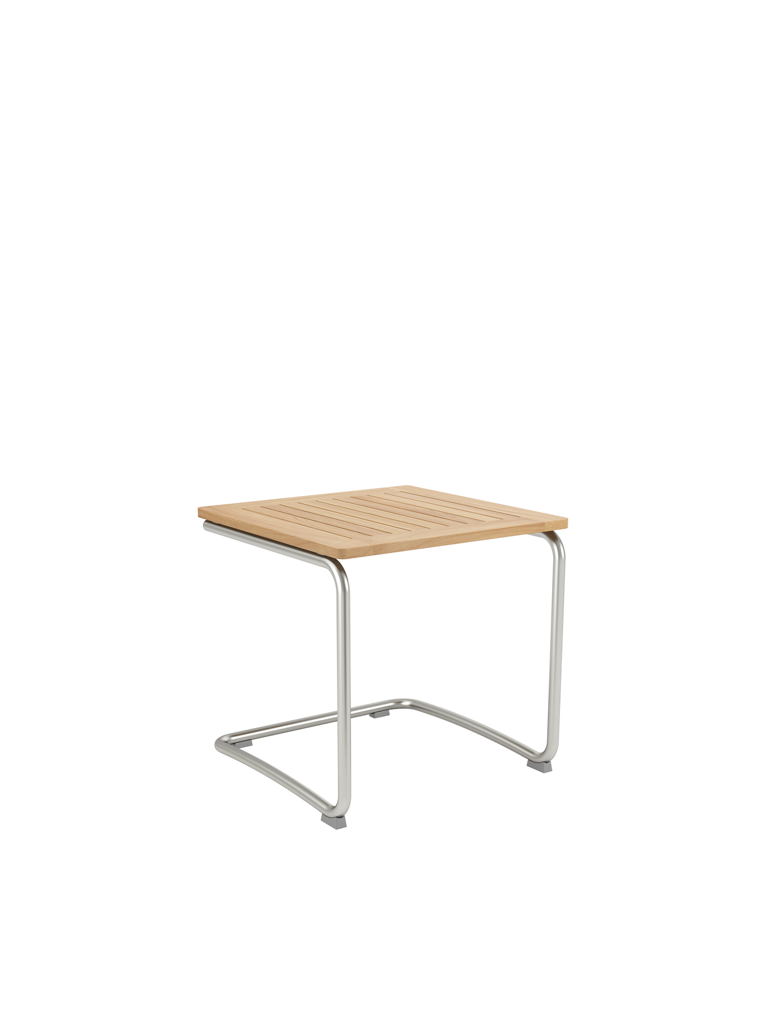 Drawn close, its tabletop extends like a tray over the seating or reclining area of the Bolero furniture. The surface of the practical side table is made of teak. The tubular frame is made of satinised stainless steel, and is absolutely weatherproof. Renewable gliders of synthetic material are fixed under the frame to protect sensitive flooring.