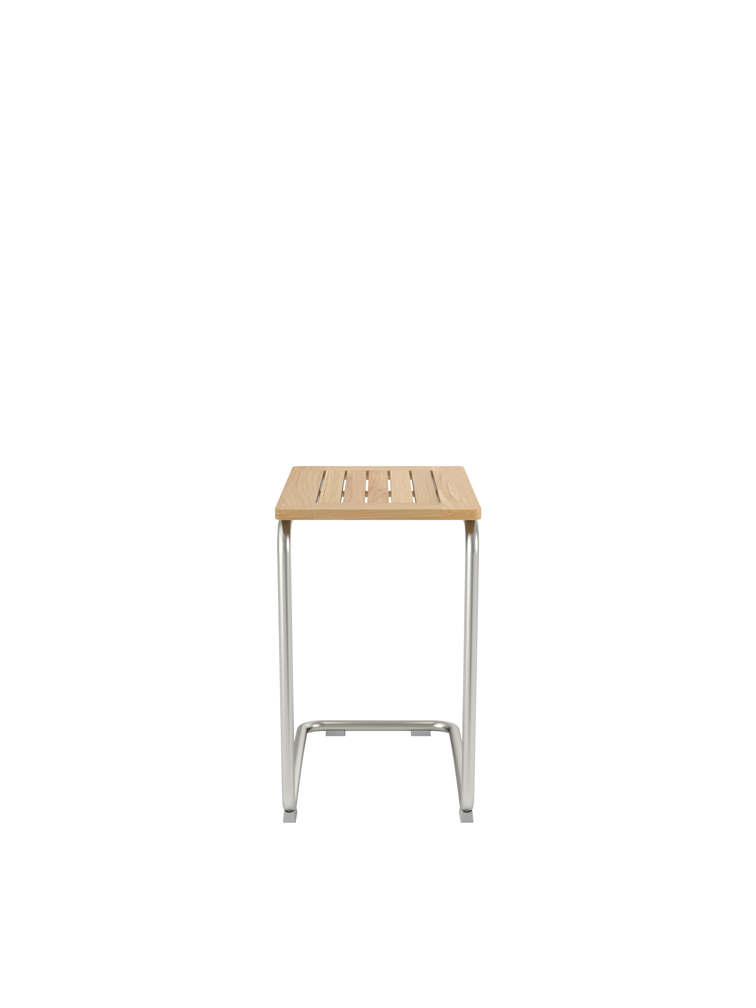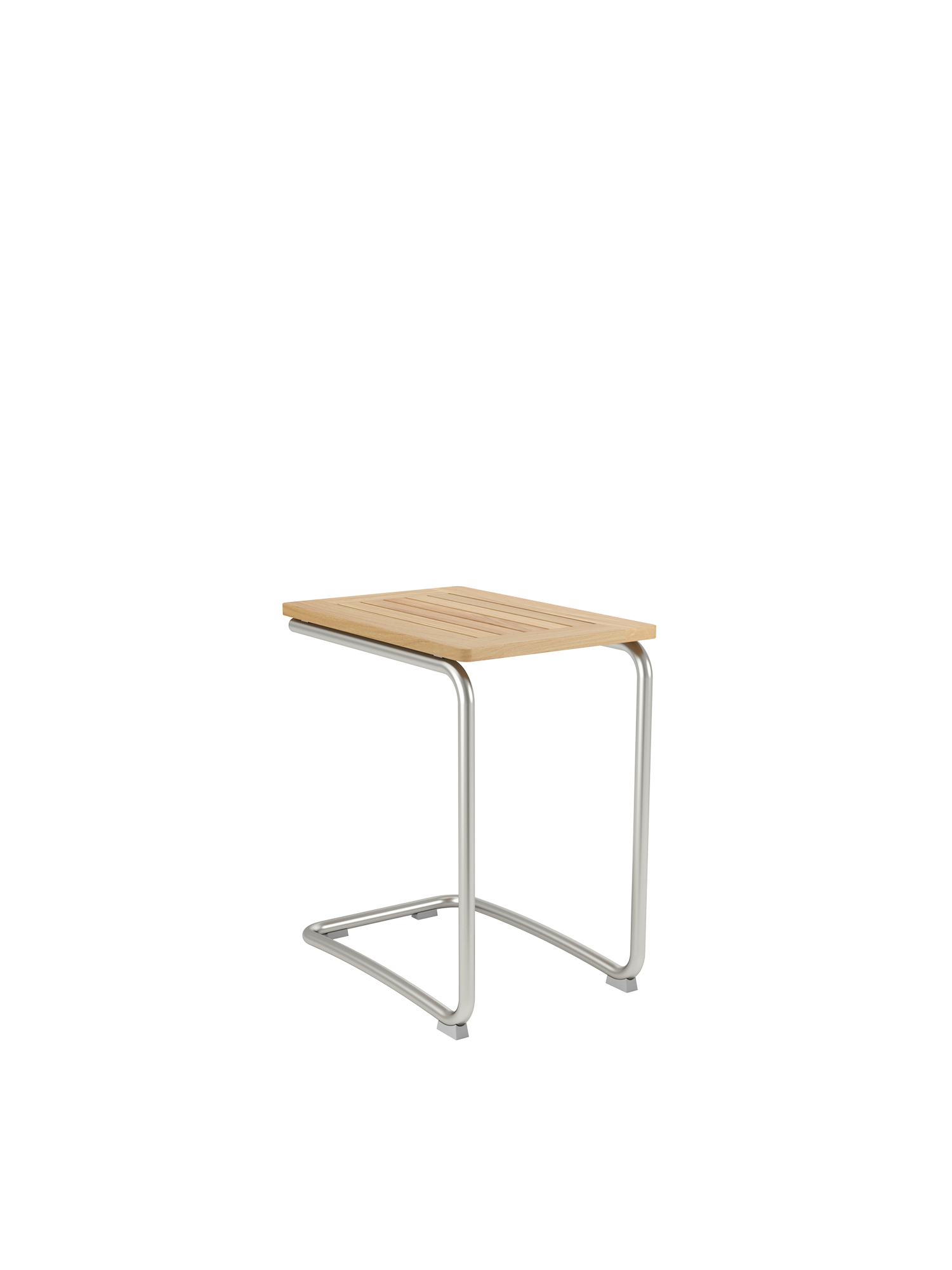 Drawn close, its tabletop extends like a tray over the seating or reclining area of the Bolero furniture.The surface of the practical side table is made of teak. The tubular frame is of satinised stainless steel, and is absolutely weatherproof. Renewable gliders of synthetic material are fixed under the frame to protect sensitive flooring.