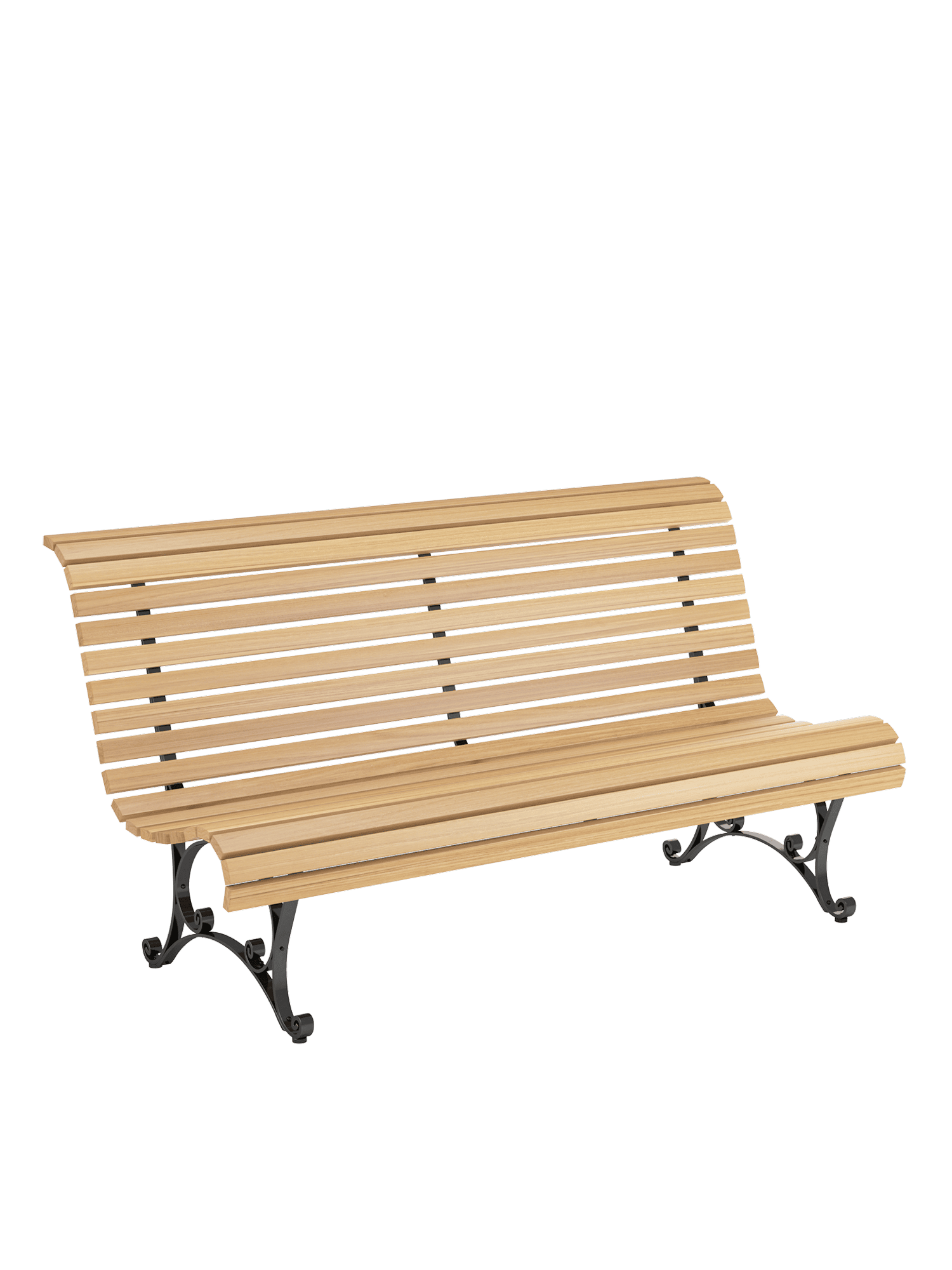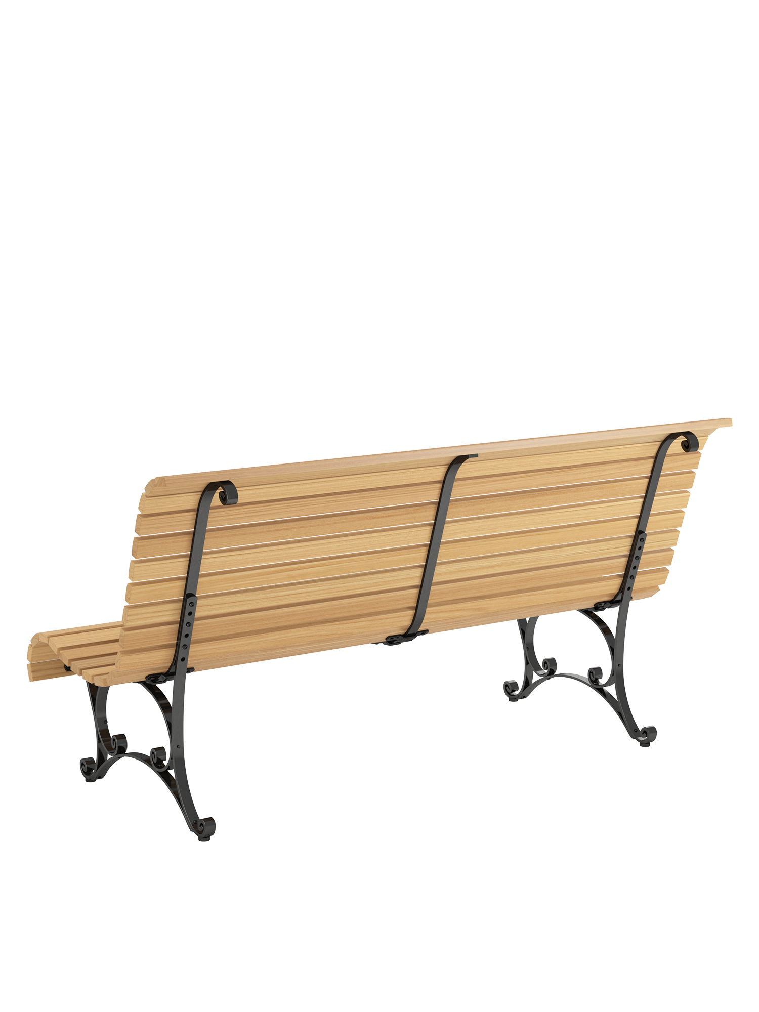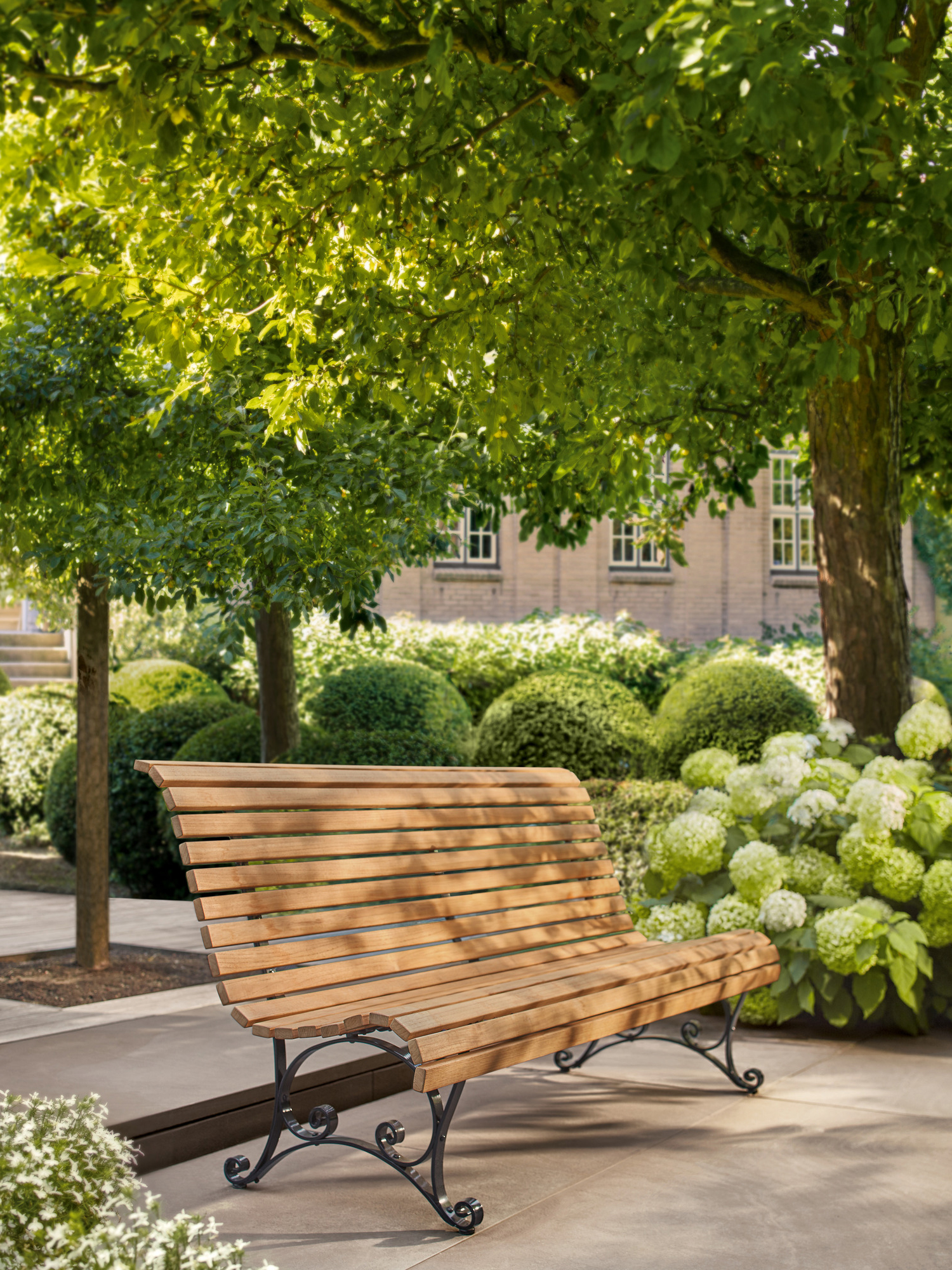 Boulogne with French charm: the elegantly curved bench of teak has a frame of galvanised steel.