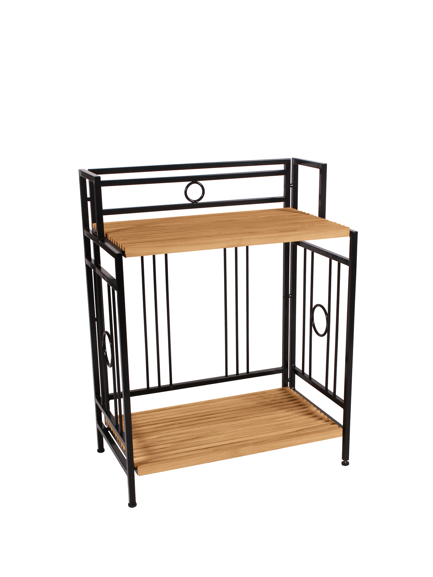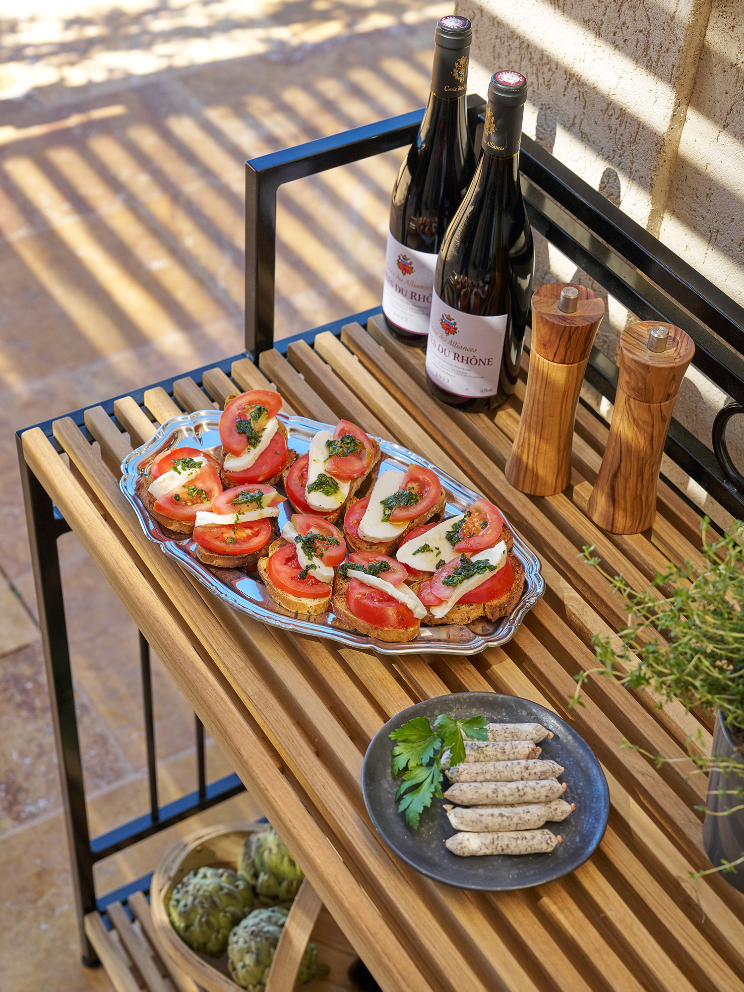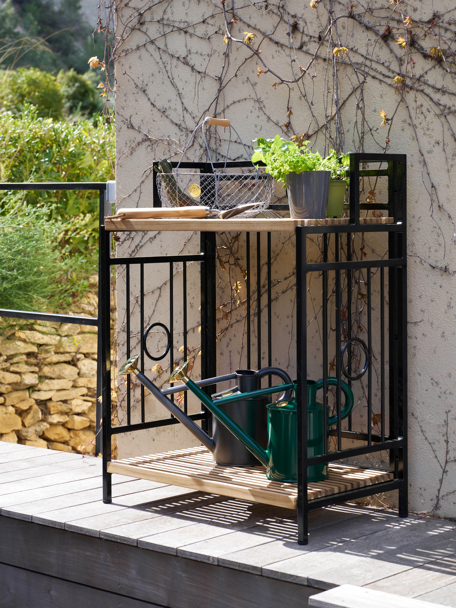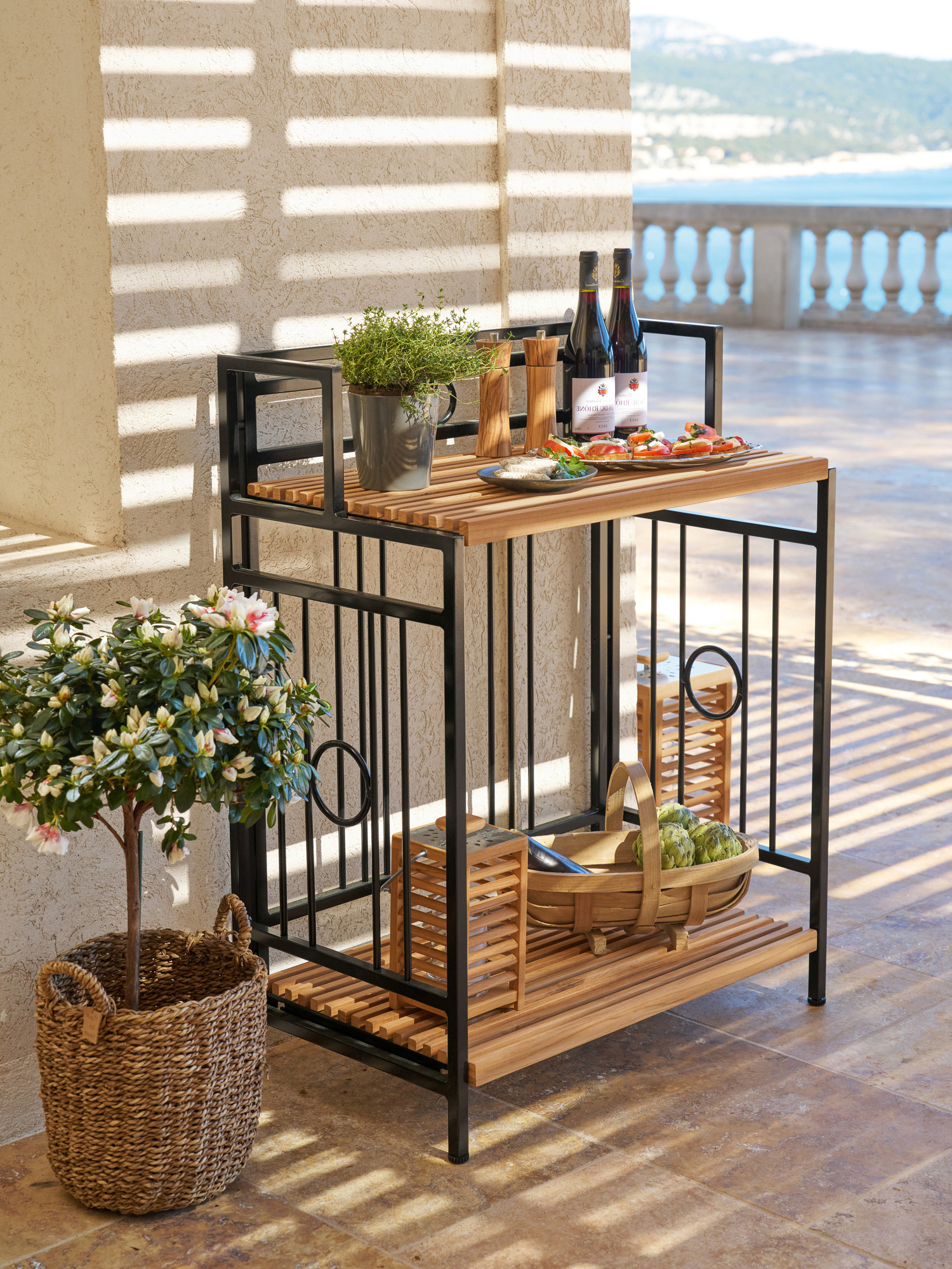 The frame of the console is made of black powder-coated aluminium with shelves in weather-resistant teak slats. The height adjustable legs ensure stability.