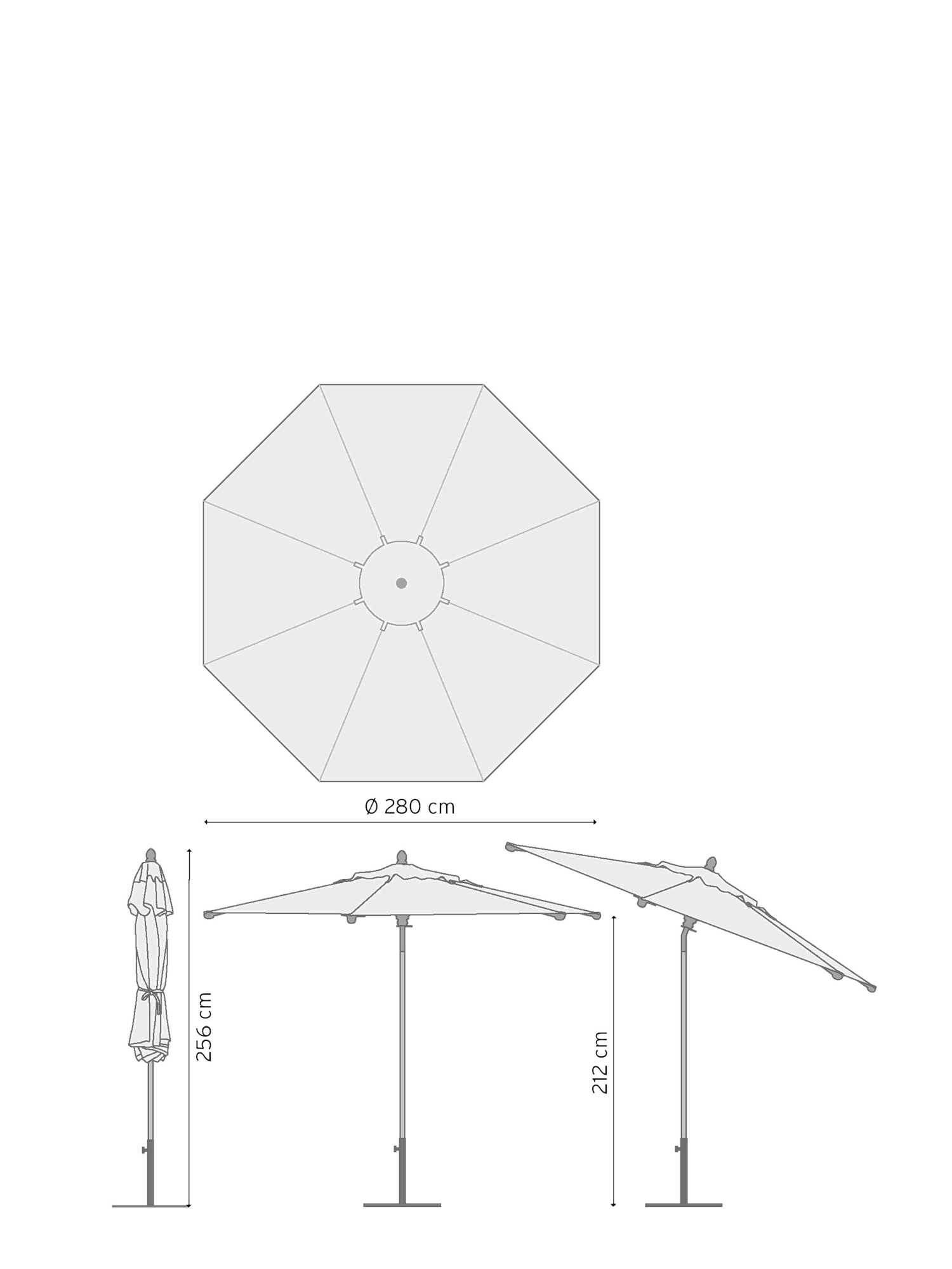 The round parasol has a diameter of 2,80 m and is specially suitable for smaller seating groups.