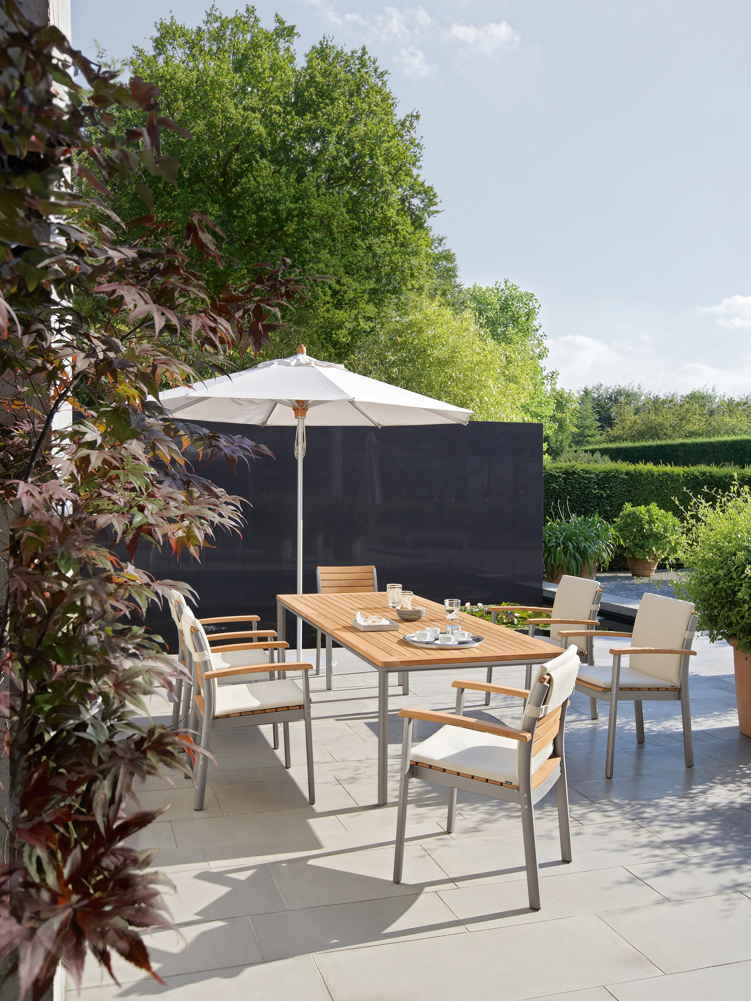 With its swivel joint the modern parasol can incline to the position of the sun and so pleasantly regulate the heat of the day.