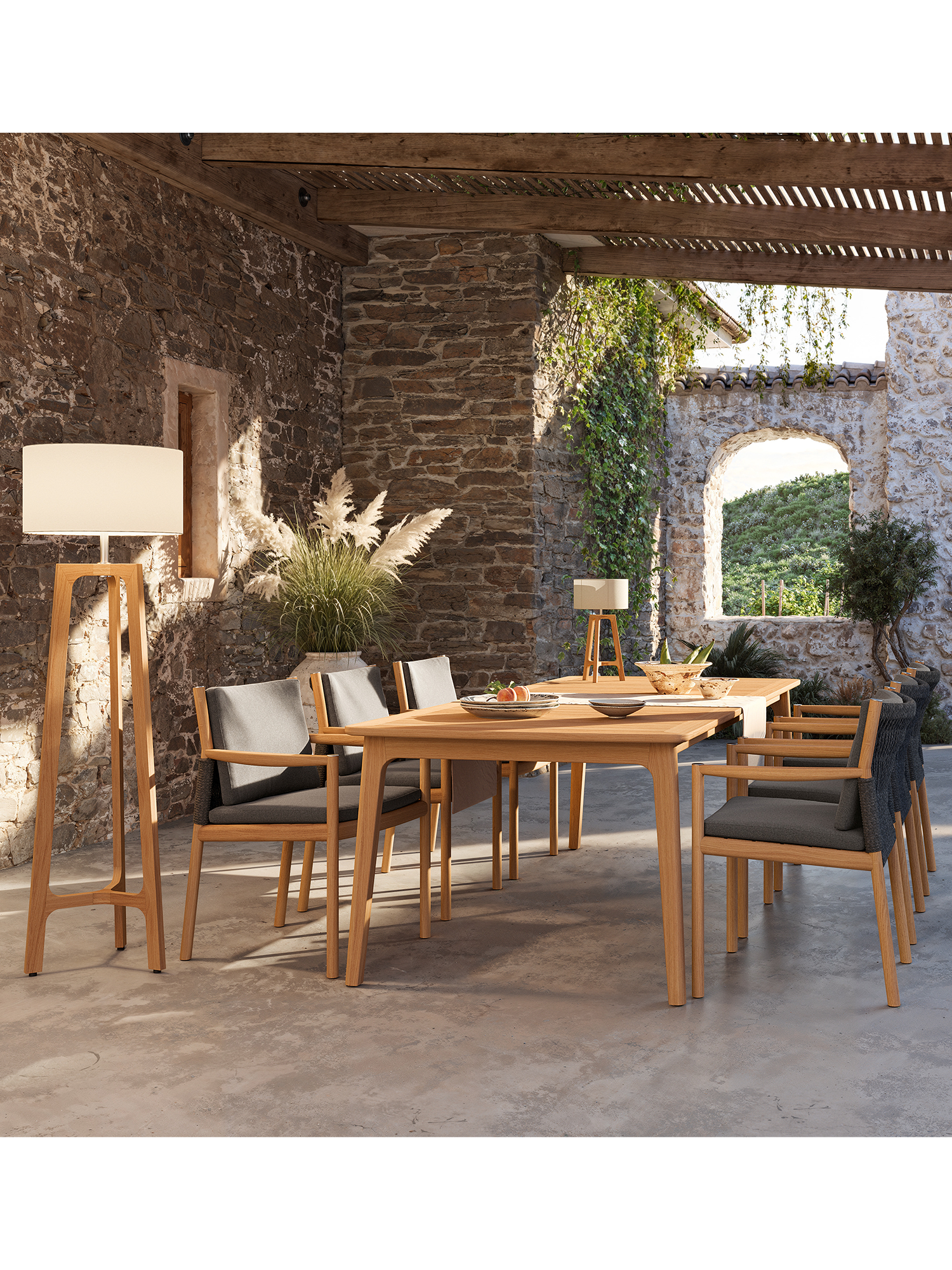 The combination of Cavo armchairs with the timeless Preston tables of the Garpa Collection, sustains the interplay of fine contrasts. The grey ceramic tabletops have a finely marbled grain and are set in teak frames. After dining, the Cavo armchairs can simply be pushed under the tabletops. The tables are available in two sizes, the larger of which can seat up to 8 persons.