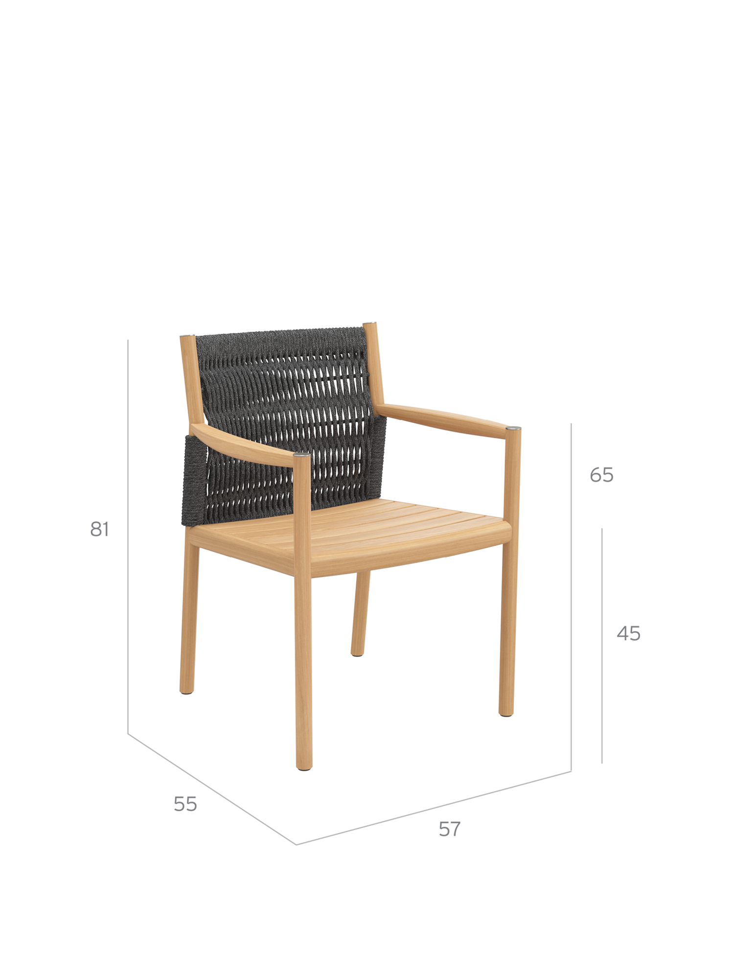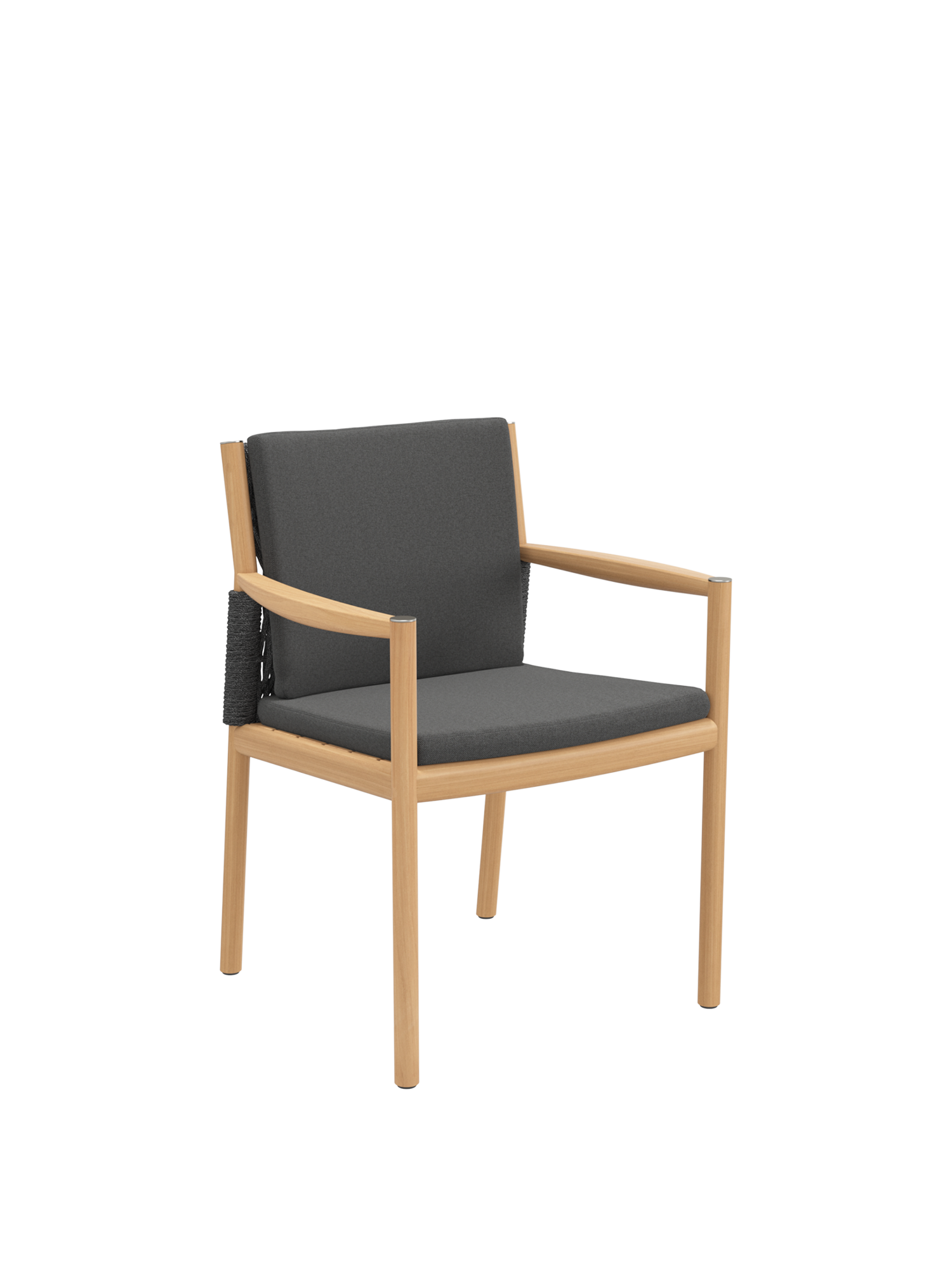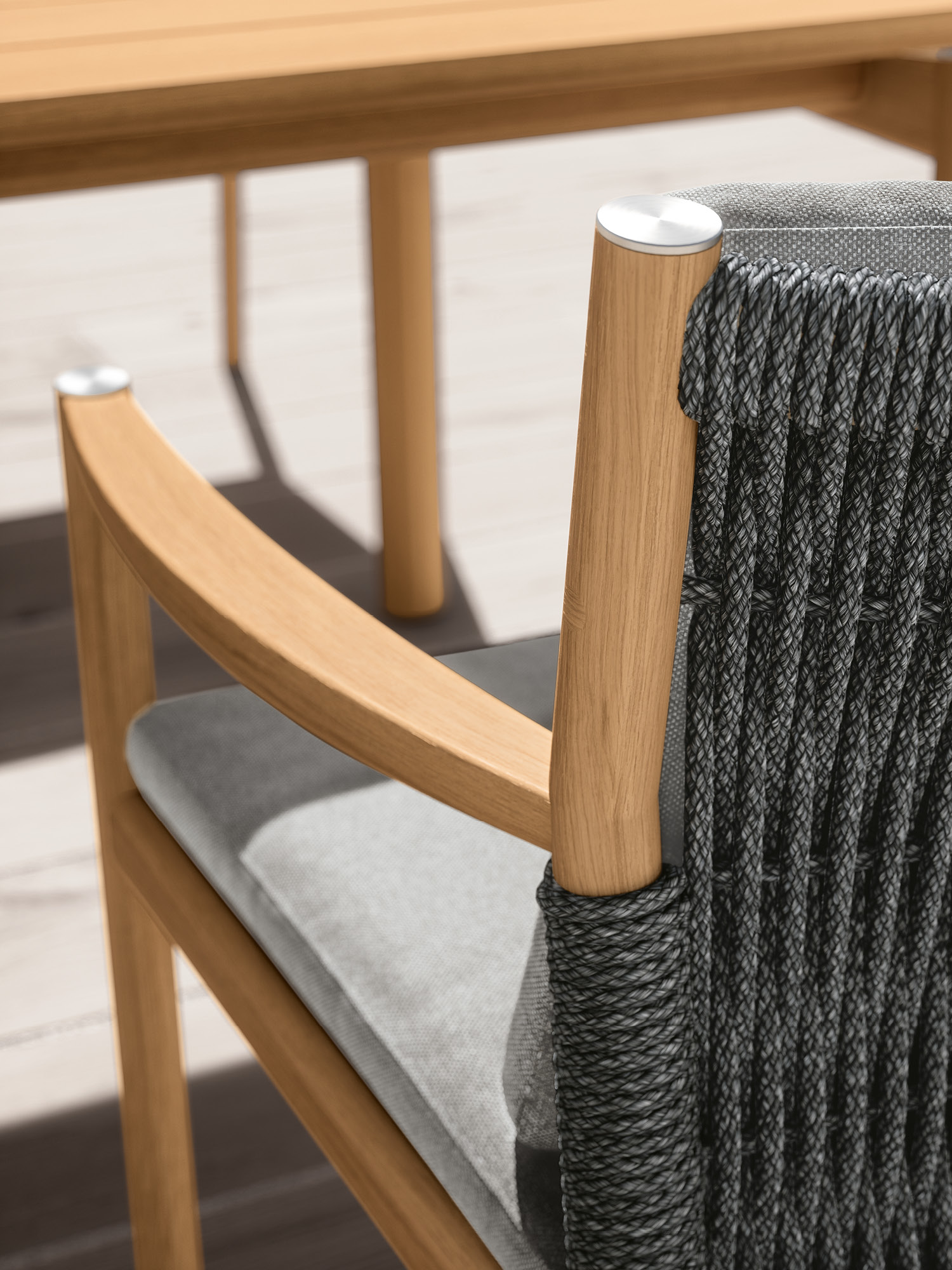 In the unmistakable design of the gorgeous Cavo collection, comfortable armchairs invite you to the table. Turned plantation teak forms the elegant base for an ergonomically shaped seat and gently rounded armrests. The high backrest of the dining chair made of supple woven cord in the colour Anthracite, provides a sense of security at both longer tables or in small groups. Fine stainless steel details set warmly gleaming accents. Optional cushions in various designs, beautifully enhance relaxation.