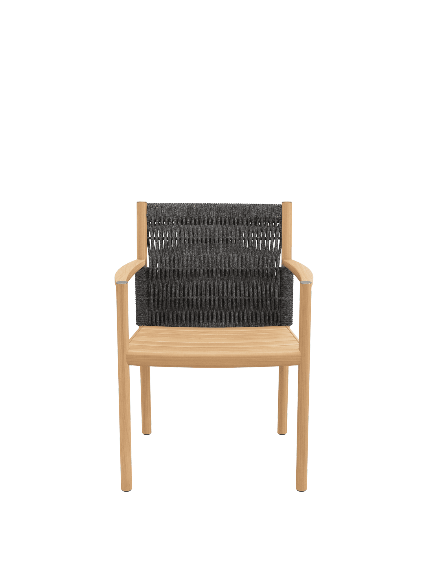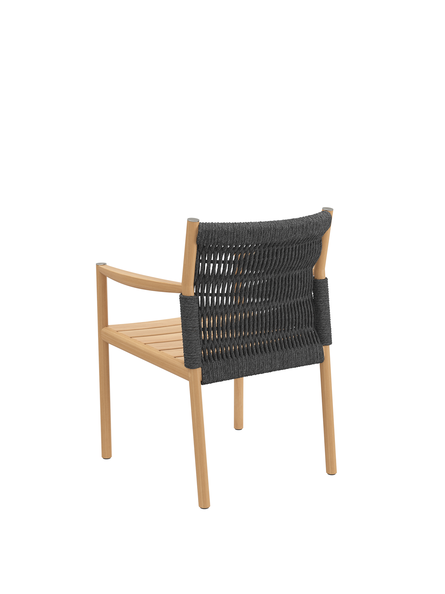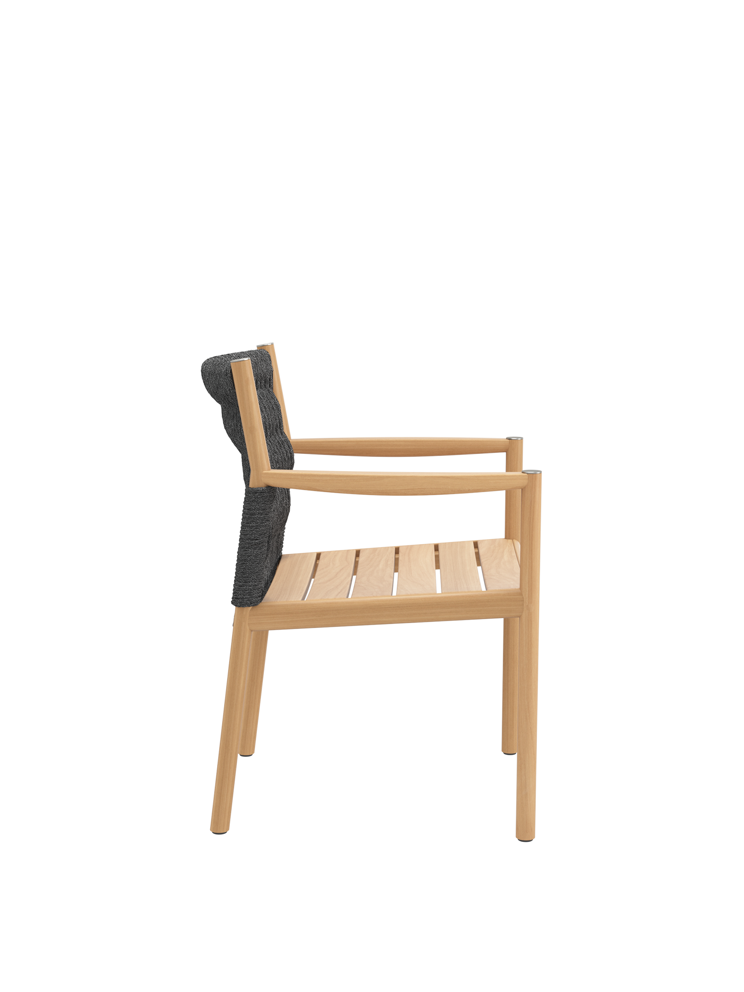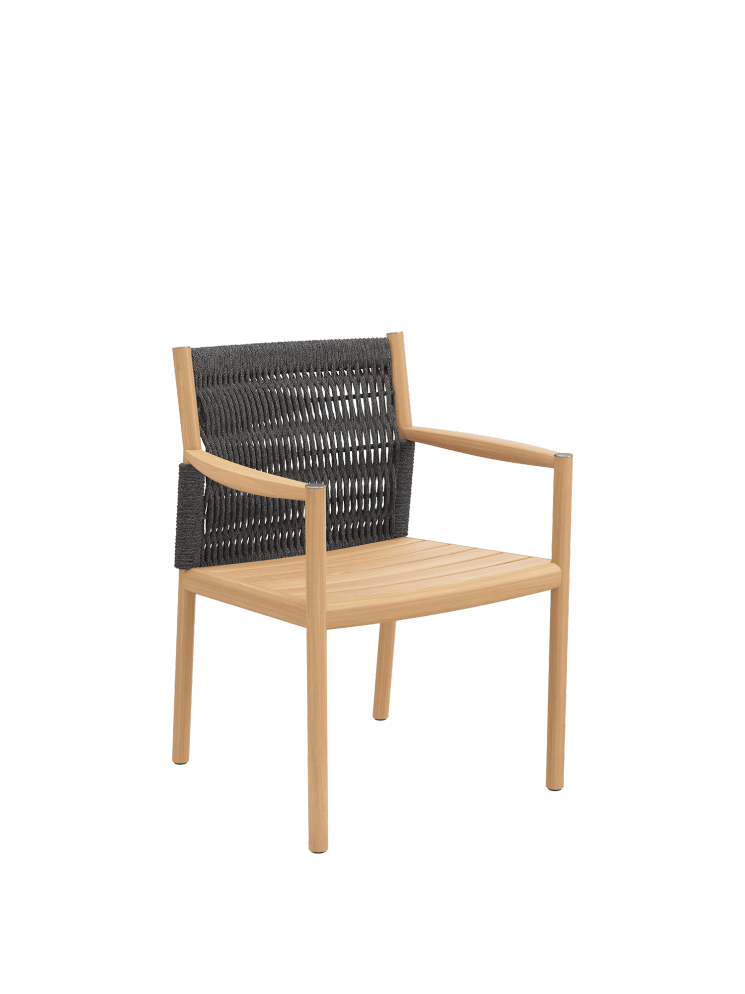 In the unmistakable design of the gorgeous Cavo collection, comfortable armchairs invite you to the table. Turned plantation teak forms the elegant base for an ergonomically shaped seat and gently rounded armrests. The high backrest of the dining chair made of supple woven cord in the colour Anthracite, provides a sense of security at both longer tables or in small groups. Fine stainless steel details set warmly gleaming accents. Optional cushions in various designs, beautifully enhance relaxation.