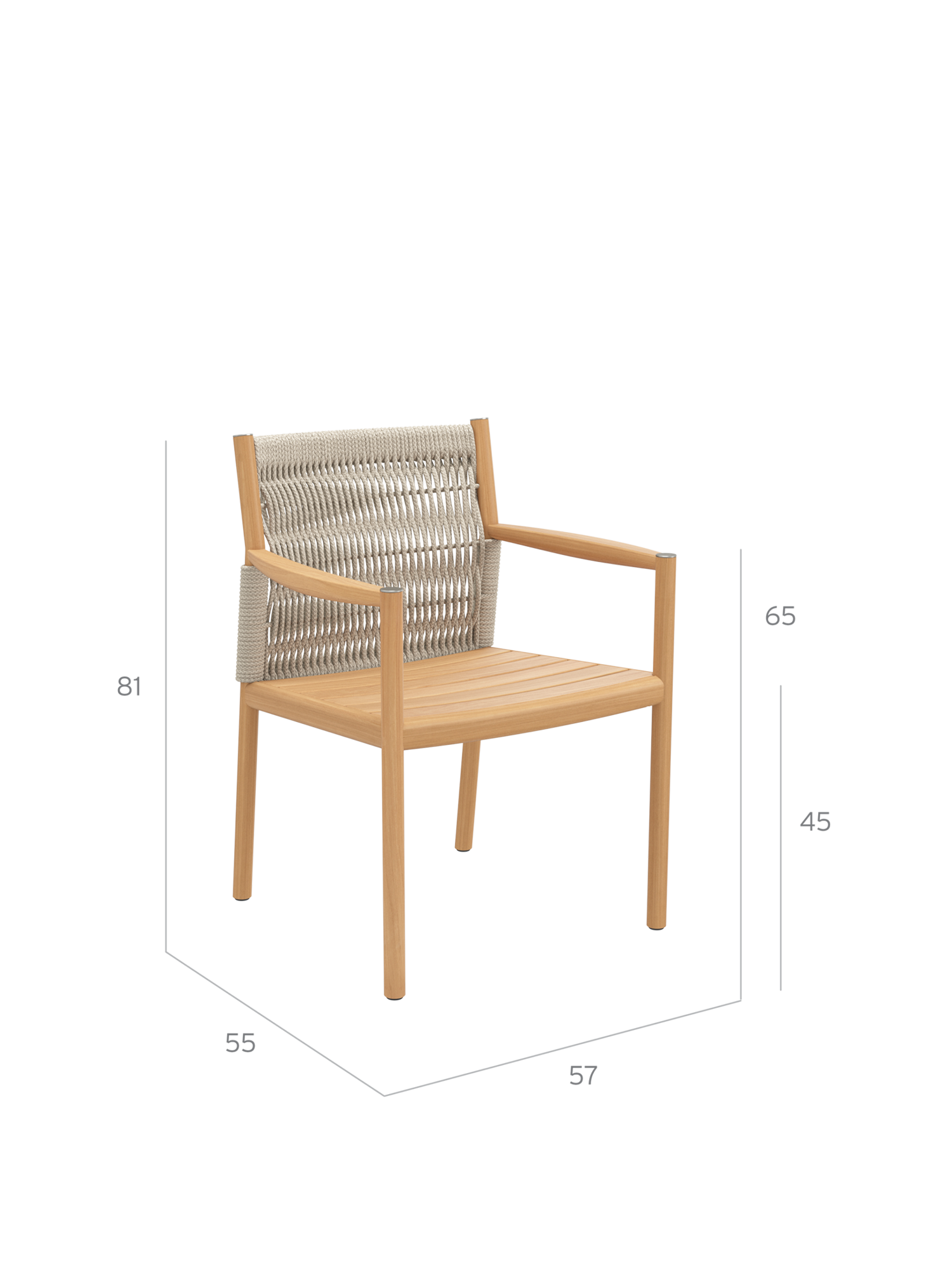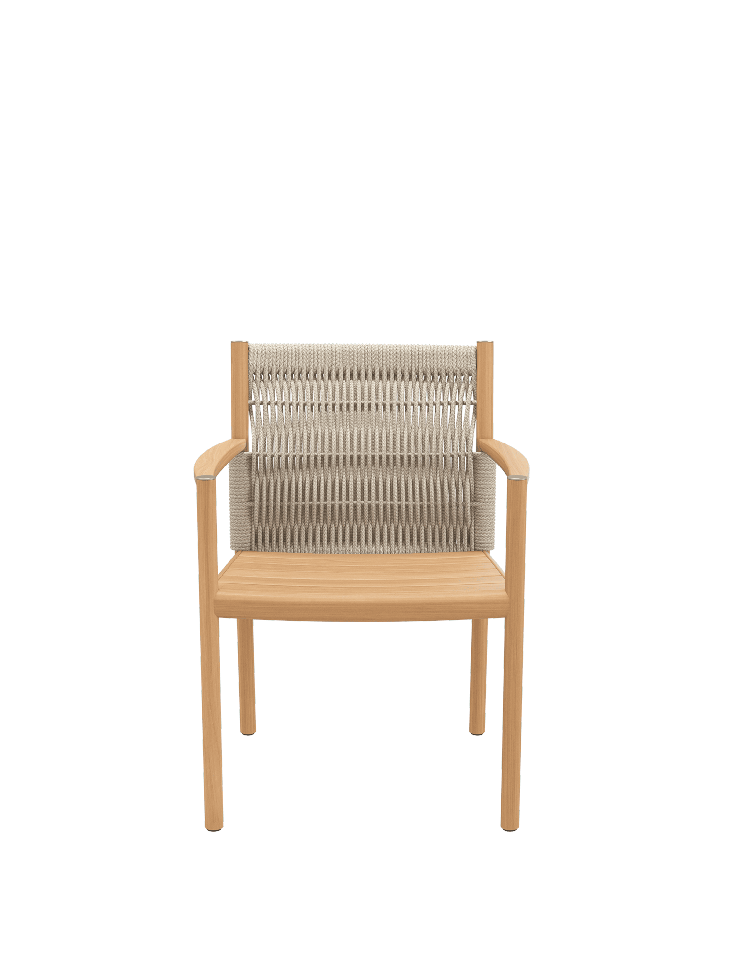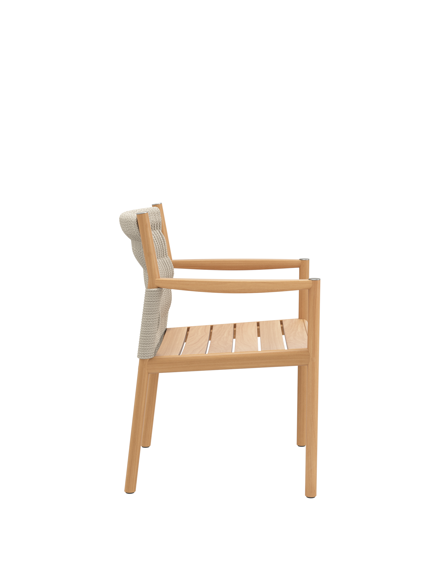In the unmistakable design of the gorgeous Cavo collection, comfortable armchairs invite you to the table. Turned plantation teak forms the elegant base for an ergonomically shaped seat and gently rounded armrests. The high backrest of the dining chair made of supple woven cord in the colour Beige, provides a sense of security at both longer tables or in small groups. Fine stainless steel details set warmly gleaming accents. Optional cushions in various designs, beautifully enhance relaxation.