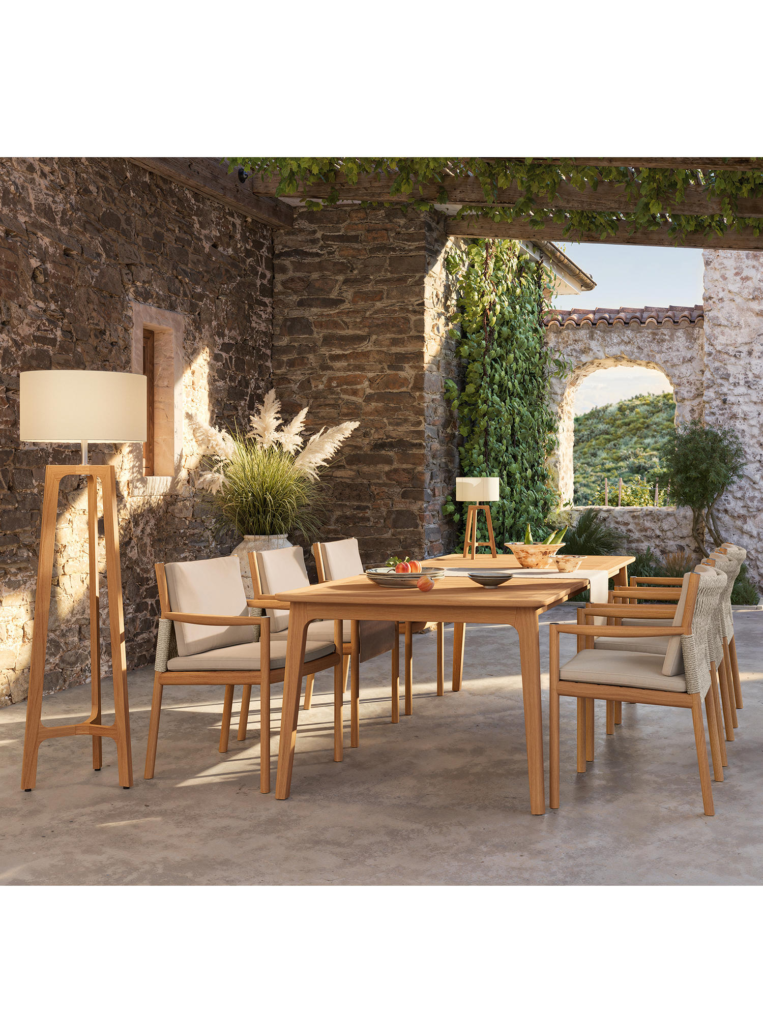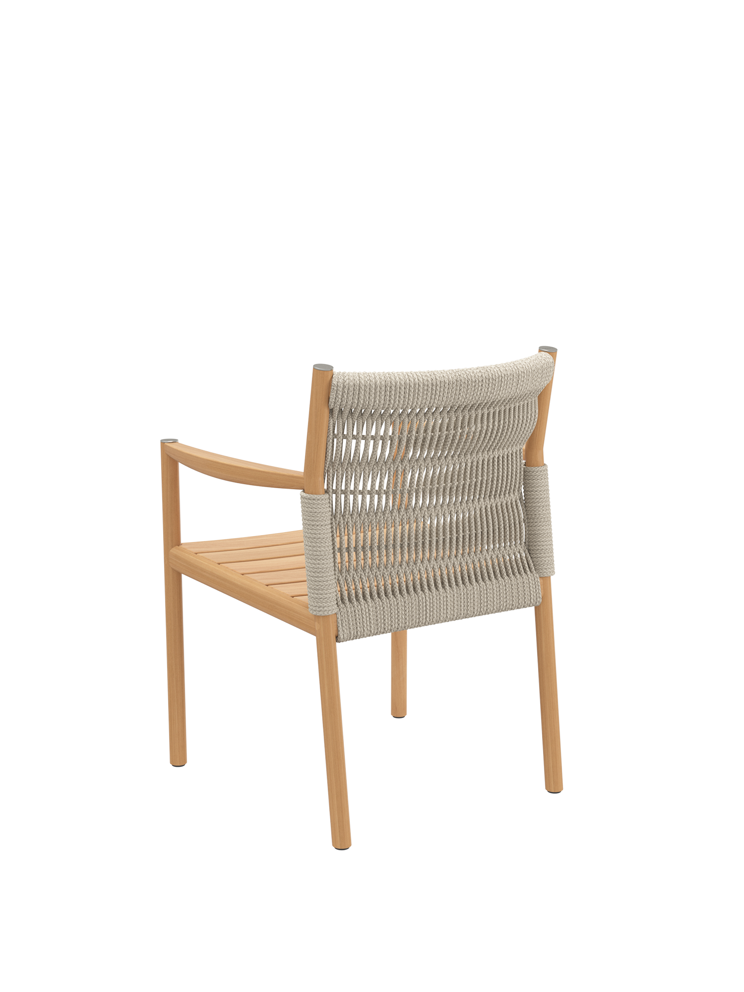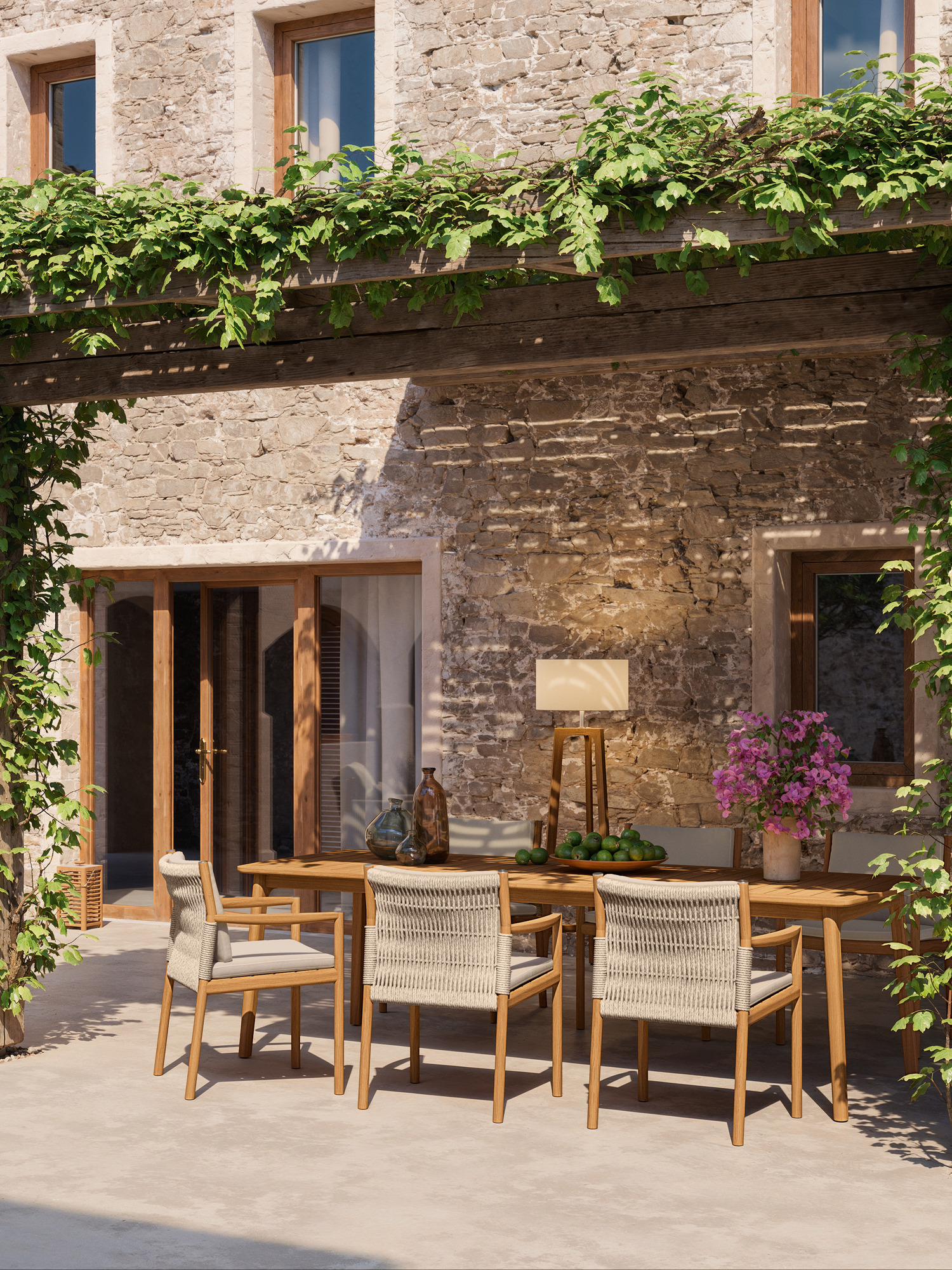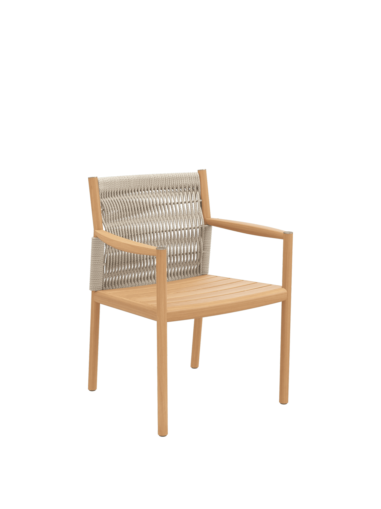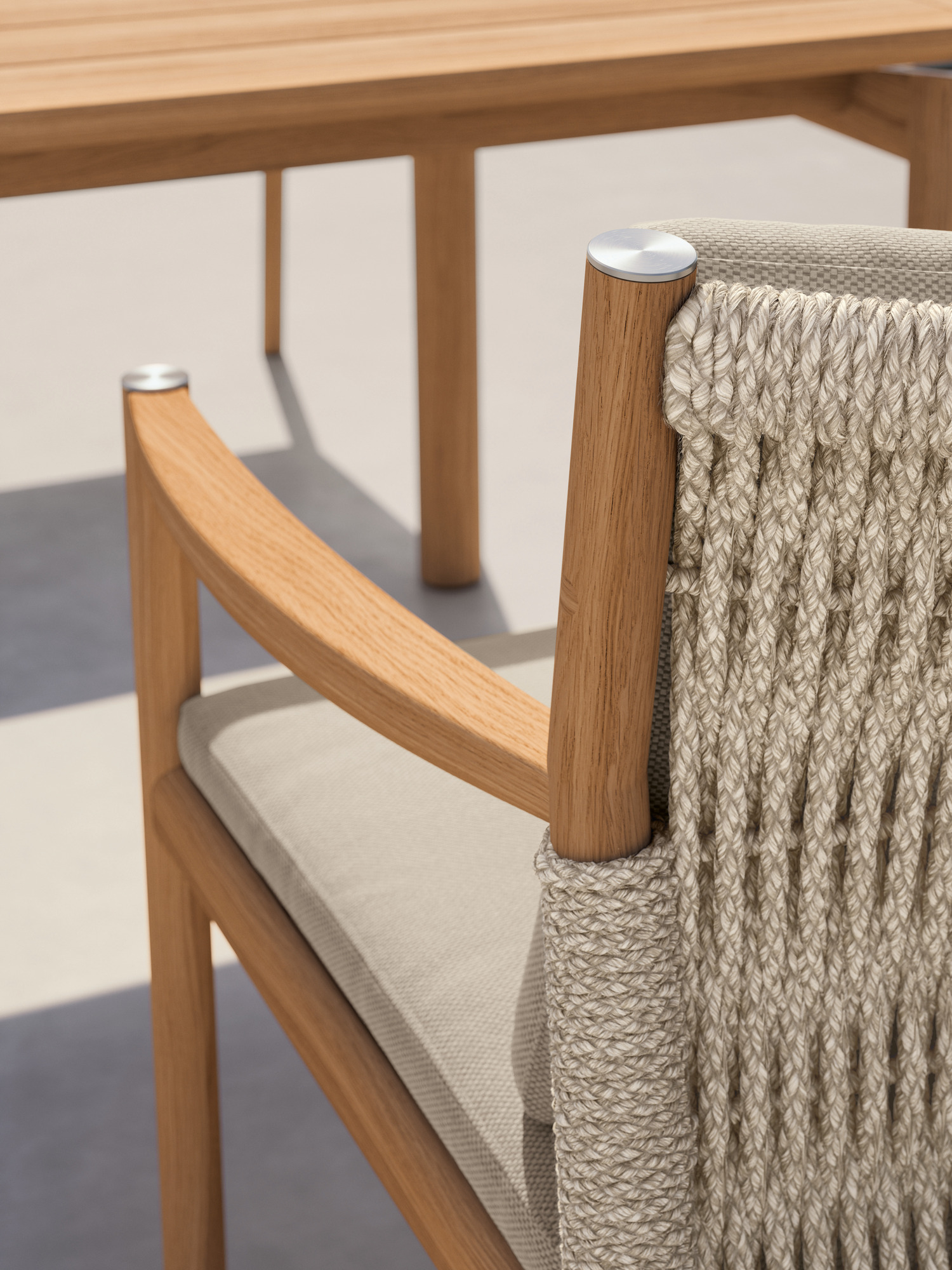 The combination of Cavo armchairs with the timeless Preston tables of the Garpa Collection, sustains the interplay of fine contrasts. The grey ceramic tabletops have a finely marbled grain and are set in teak frames. After dining, the Cavo armchairs can simply be pushed under the tabletops. The tables are available in two sizes, the larger of which can seat up to 8 persons.