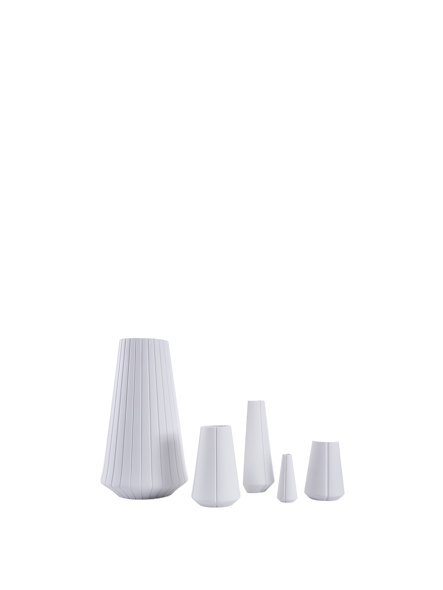 The round vases come from the same manufactory. The surfaces of all vases are decorated with a fine striped relief.