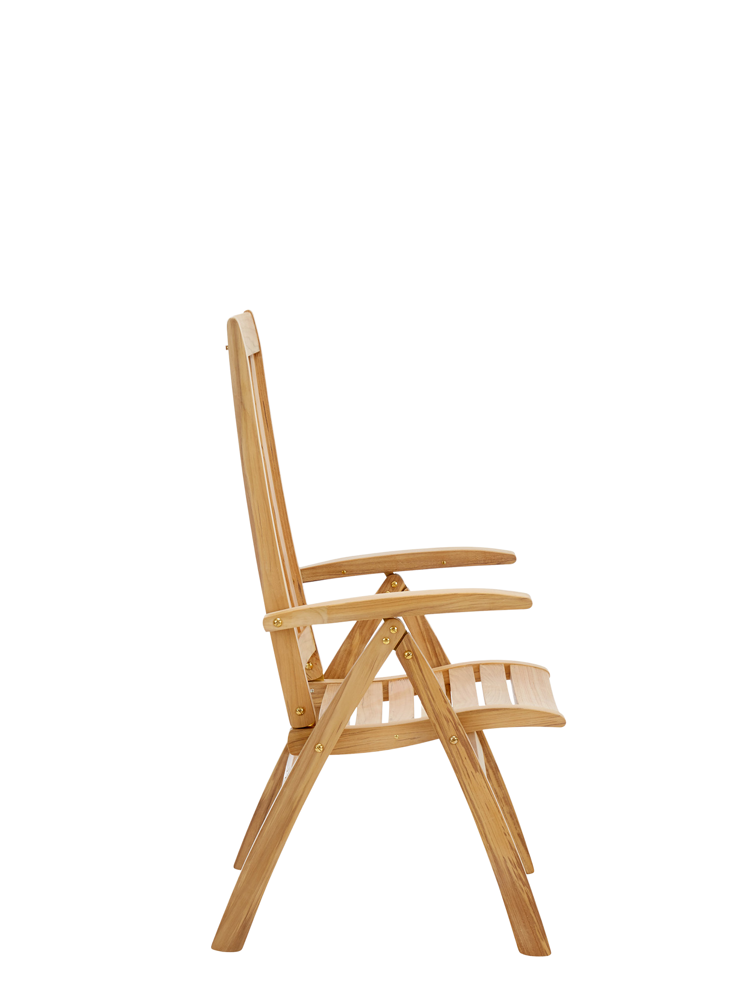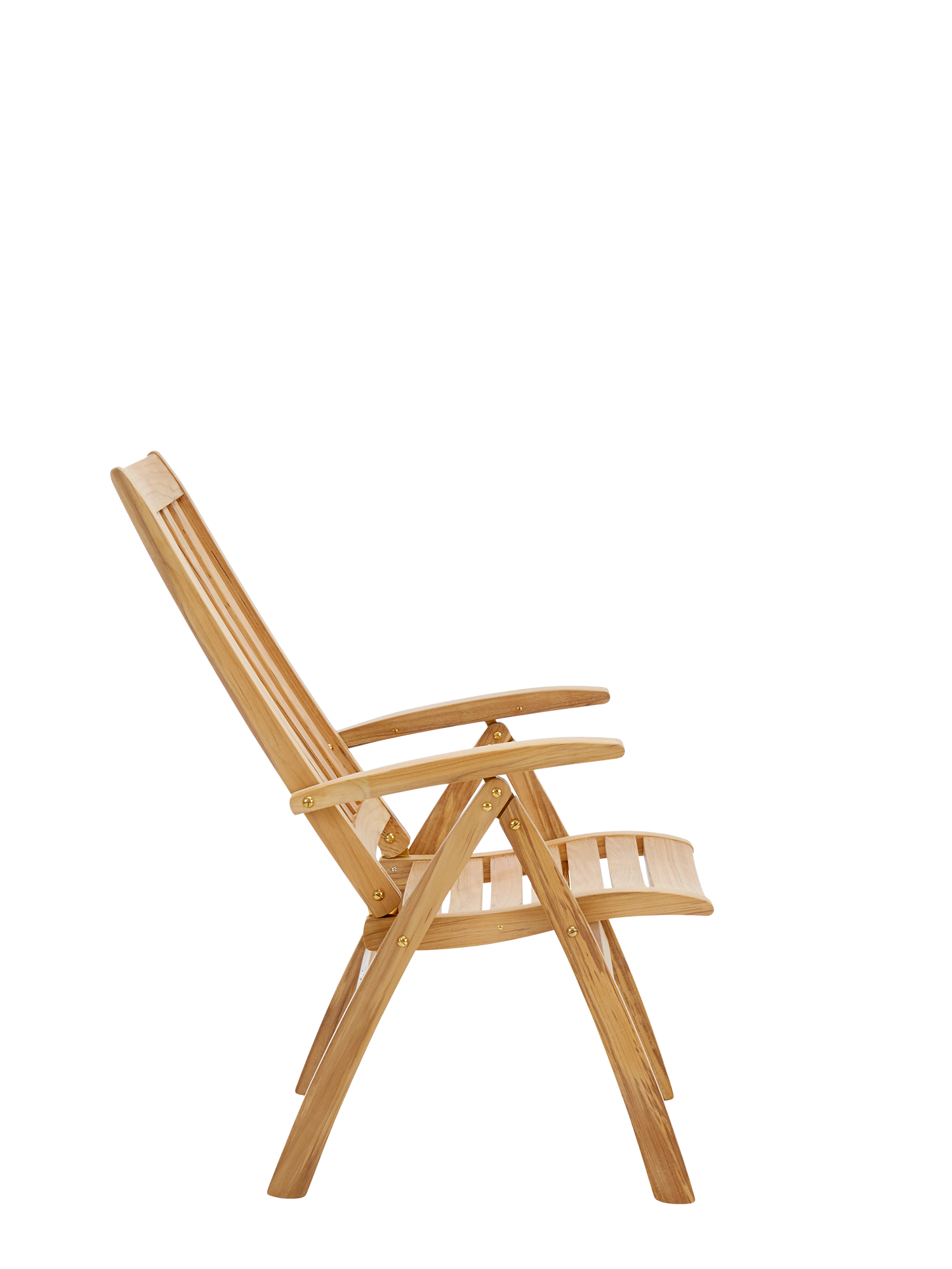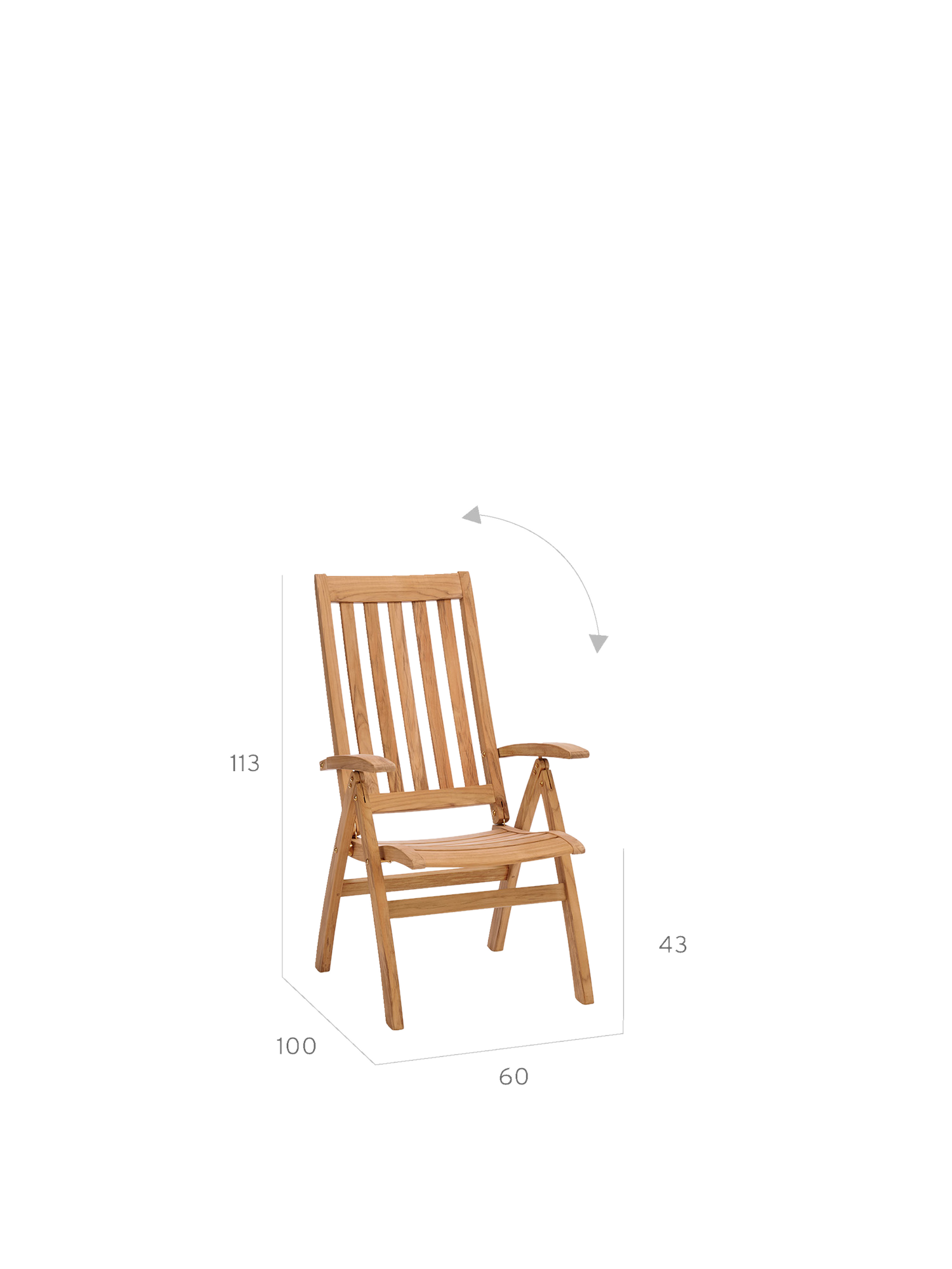 The seat of the elegant recliner of weatherproof teak follows the lines of the body, is curved and slopes slightly backwards, which pleasantly relaxes the muscles.