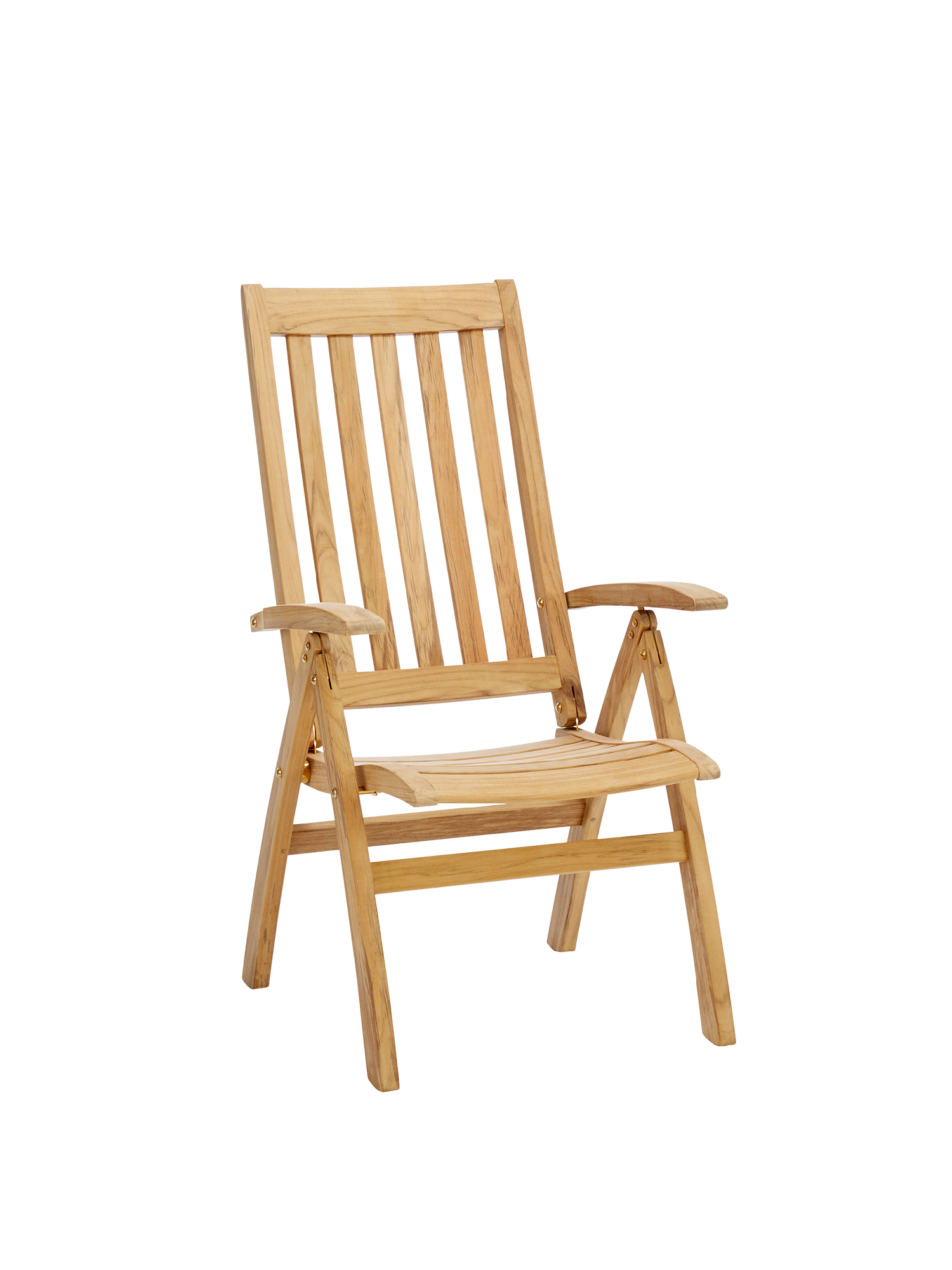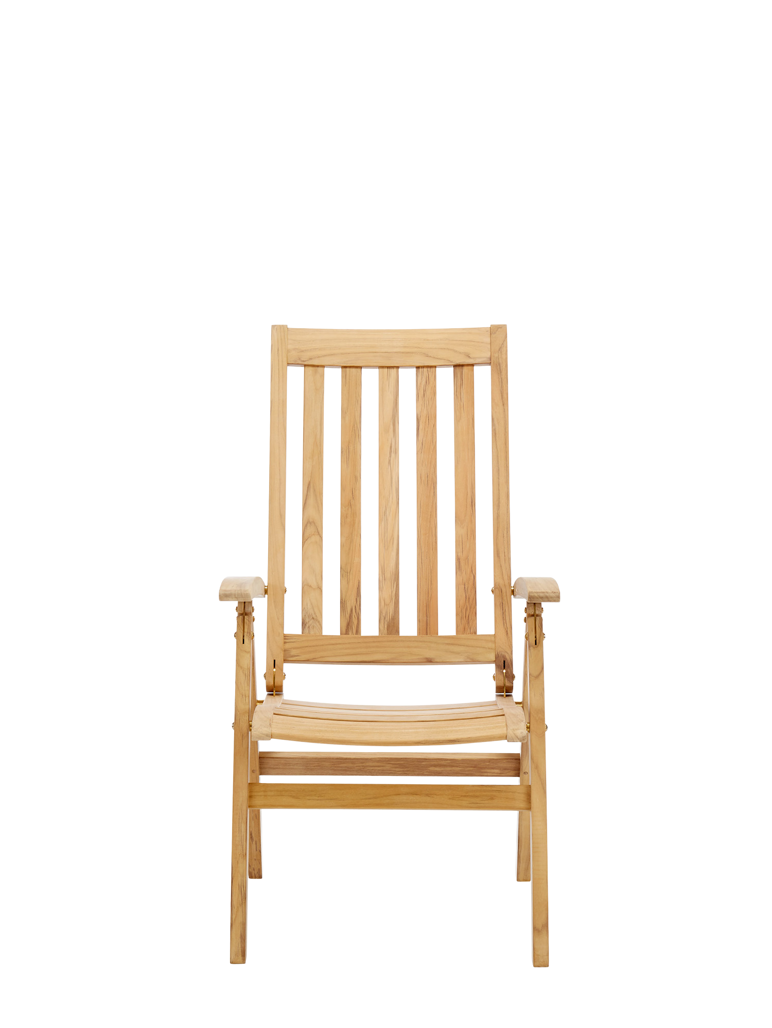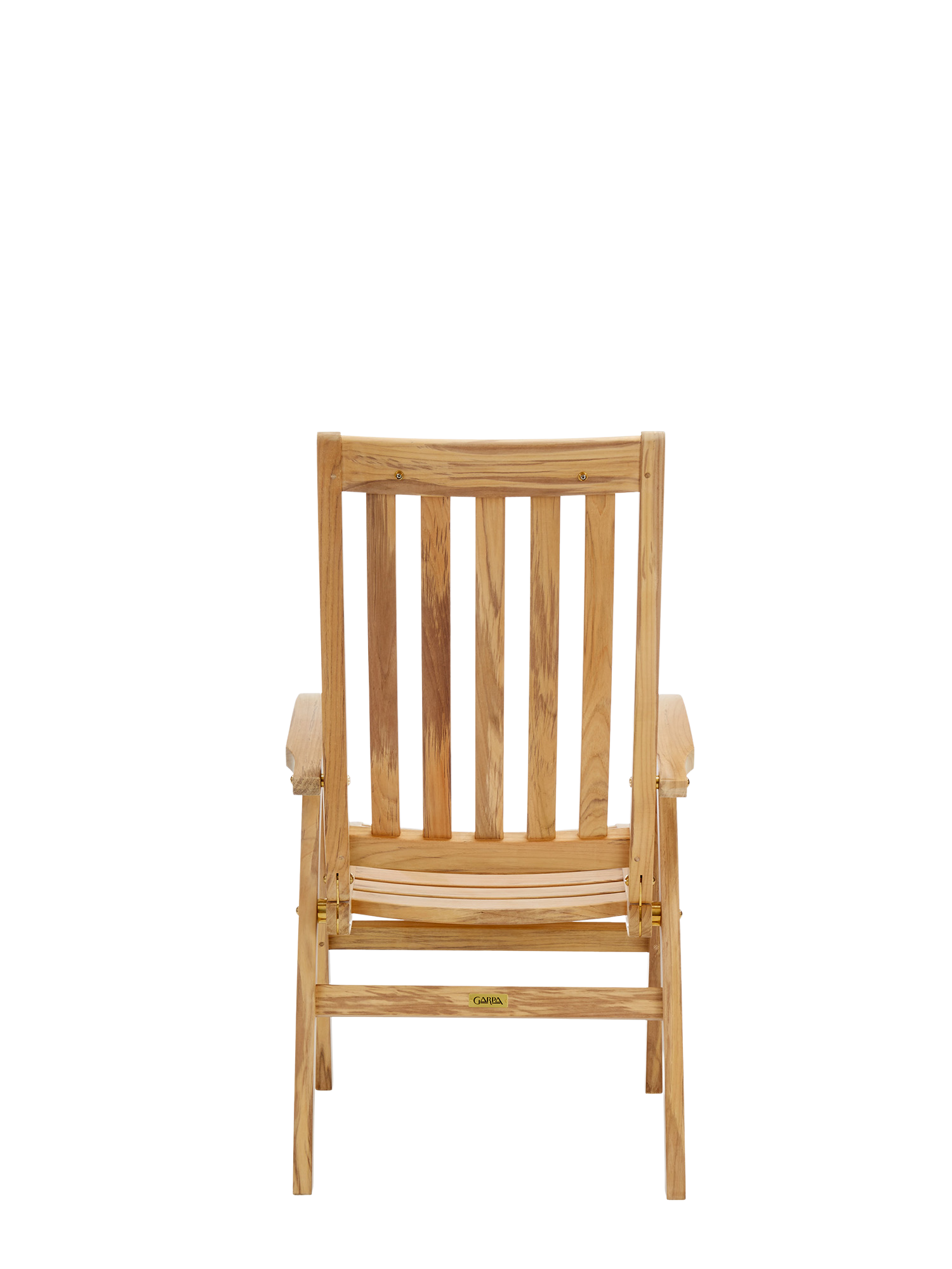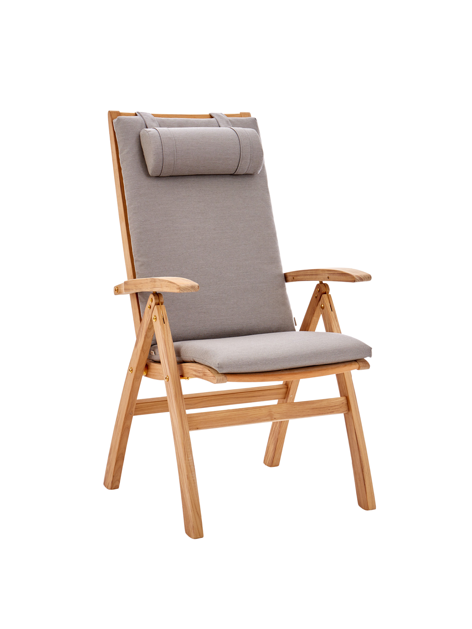 The seat of the elegant recliner of weatherproof teak follows the lines of the body, is curved and slopes slightly backwards, which pleasantly relaxes the muscles.