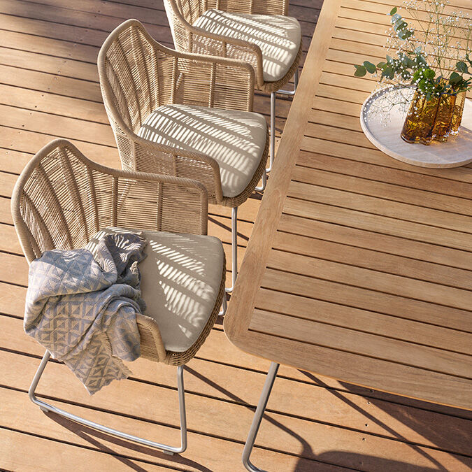 The elevated armrests trace gentle curves and offer plenty of space for extended dining. Their dimensions are precisely designed to allow the chairs to be easily slid under the table top after festivities. Light filters softly through the linear woven pattern, the vertical struts of the double-sided backrest follow the inclination of the body and promise immediate tangible comfort. Dining tables in two sizes have been specifically designed for Amari. The slim table tops made of weatherproof teak or synthetic resin are supported by stainless steel runners that have the same shape as those of the armchairs.