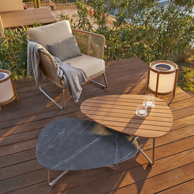 Lounge tables with teak surfaces in combination with ceramics make an attractive set of two.