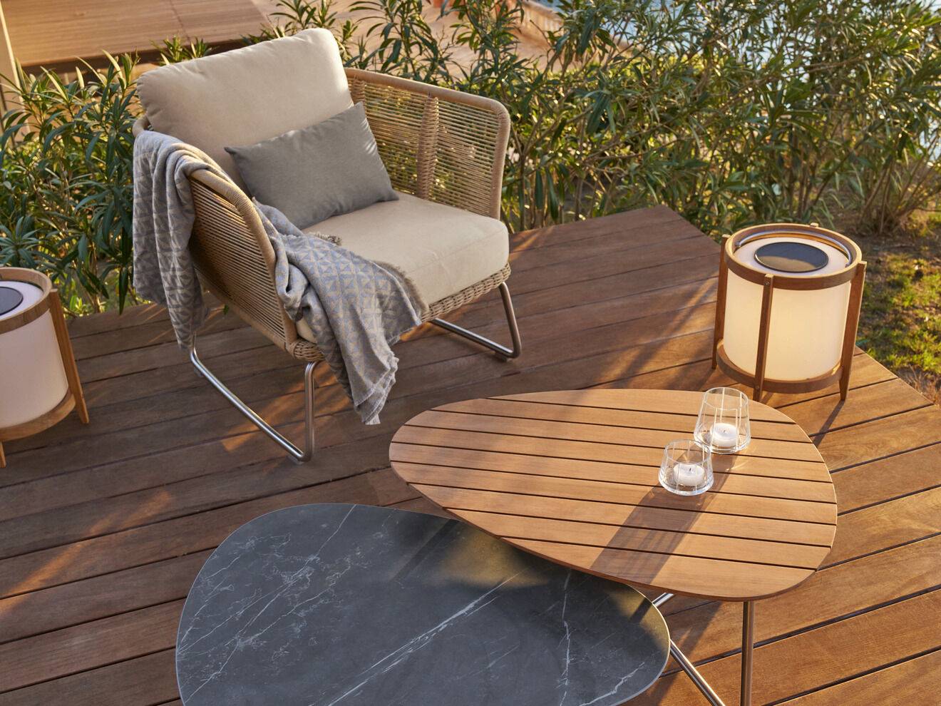 When the sofa and armchairs have long since taken up their airy places, lounge tables quietly provide diversity. The set of two combines a higher table with teak surface and a lower one with ceramic. Both tops are the same size. Their asymmetrically rounded shapes allow for flexible and individual variation. The unconventional tables can be pushed together as desired when their longitudinal runners are parallel to each other. A small, but higher side table completes the genial ensemble.