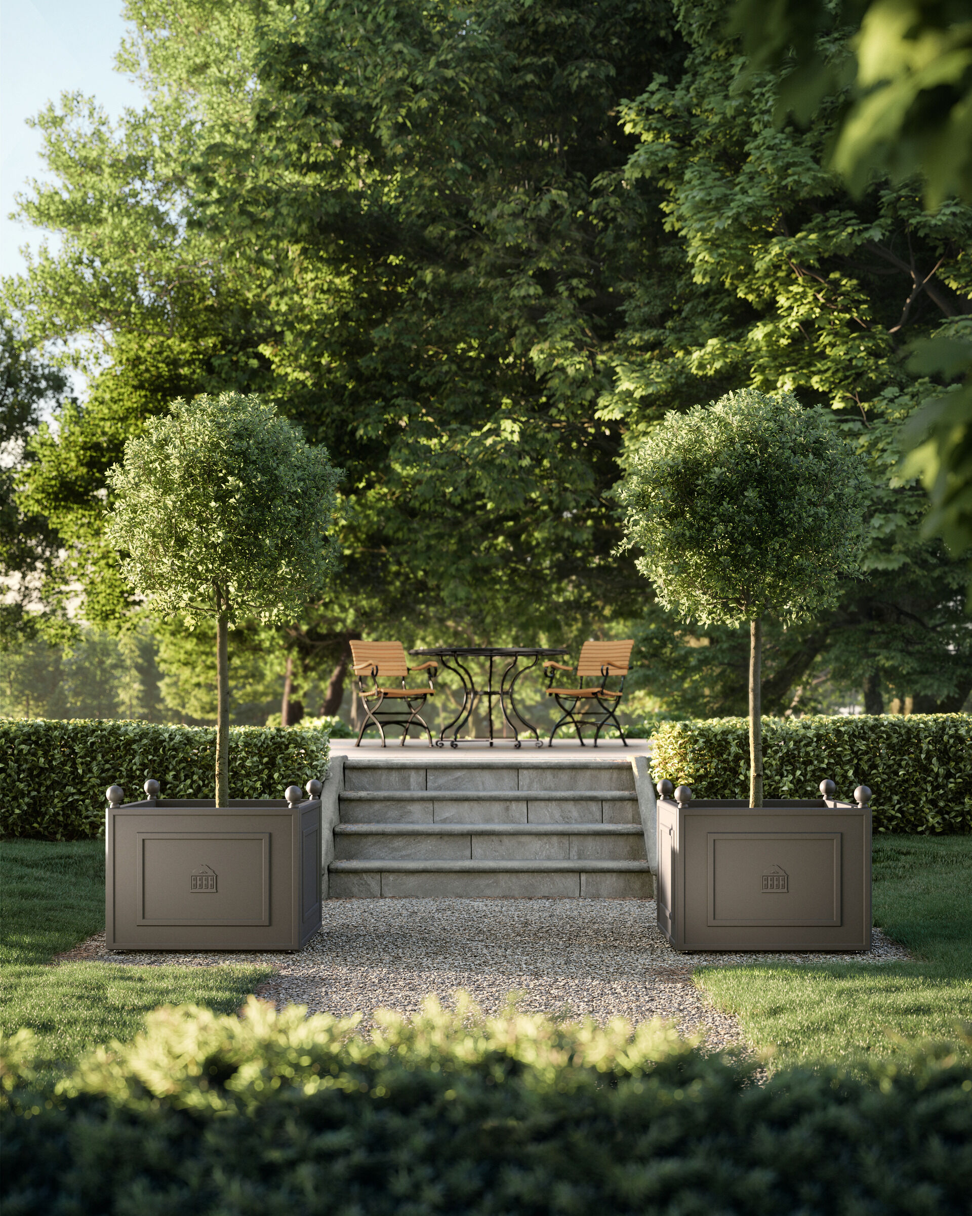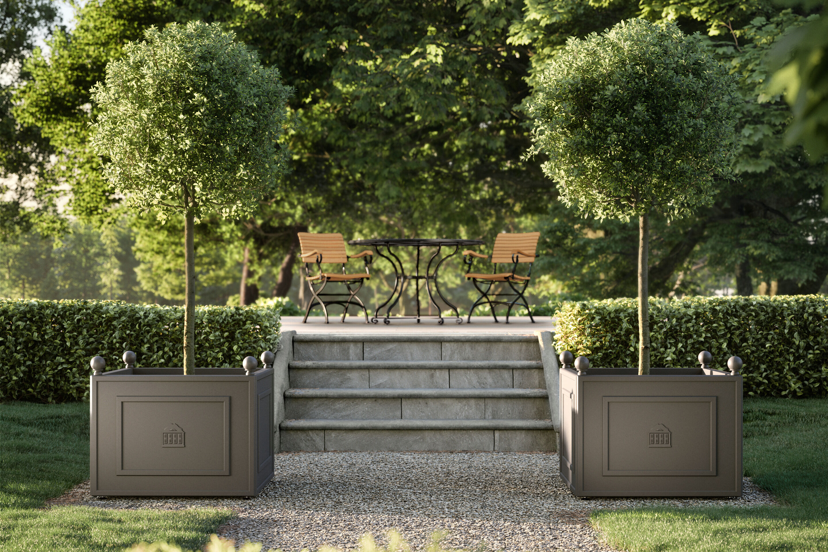 Aristocratic appearance: with grace and harmonious ornamentation, the imposing containers made of powder-coated aluminium set beautiful accents in classically inspired garden settings. The column-like corner elements, crowned by spheres and supported on robust feet, are testimony to reassuring stability. A handsome design in high relief on the front, is the stylised image of the Garpa headquarters in the north of Germany.
