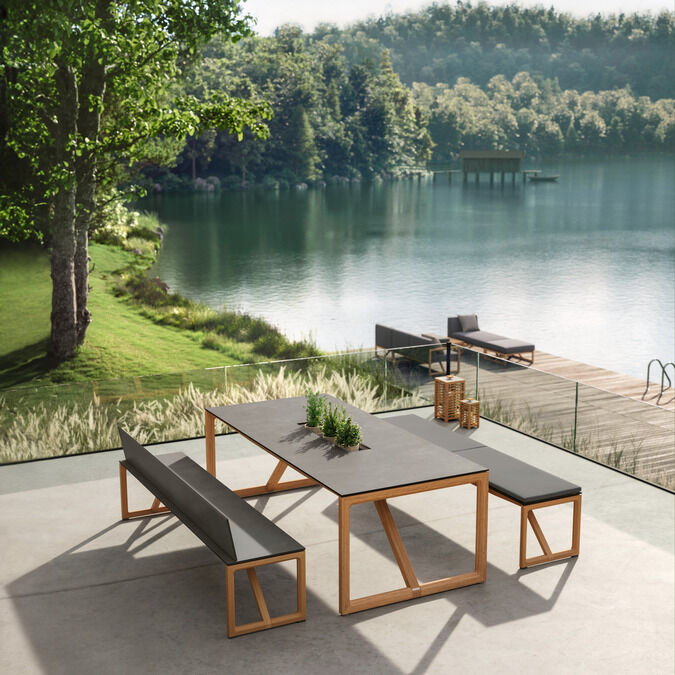 Variable lounge or compact seating group – the open design of struts and sides made of high-quality teak is the same. The table and benches offer space for dining and socialising, as well as for a play corner or home office. Discover the dining furniture of the Trey collection.