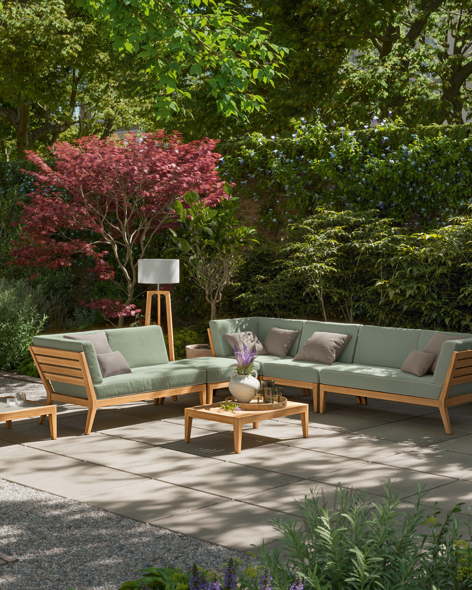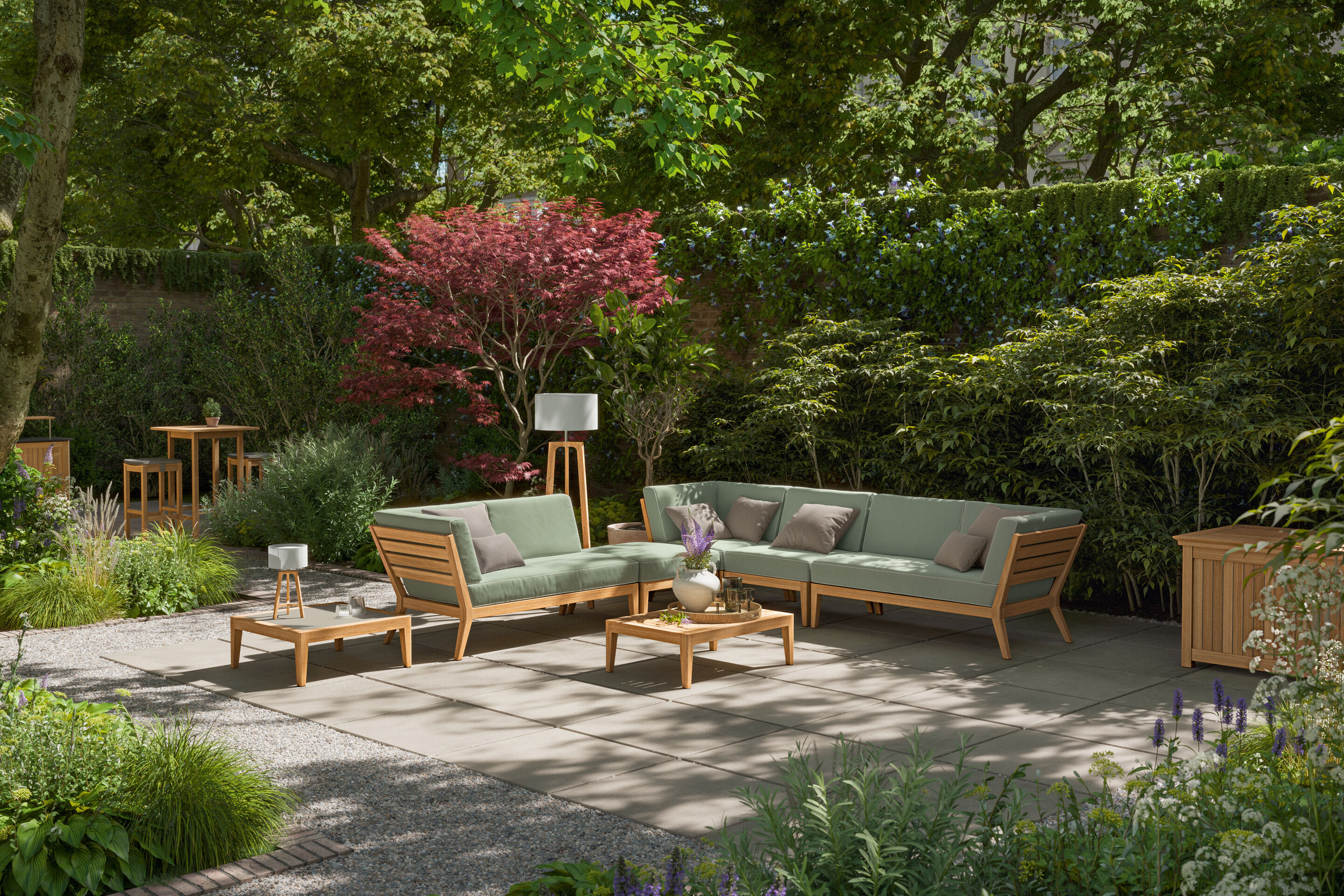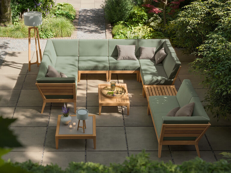 Soft cushions tempt you to moments of idleness during the day and keep you in good spirits when an evening with friends promises to be long. The ensemble follows a clear concept, both in design and in the possibilities for combination: extra wide and especially deep, chaise longues, middle elements and corner modules made of teak, with angled legs and transverse seat and backrests, offer comfortable space for reclining.