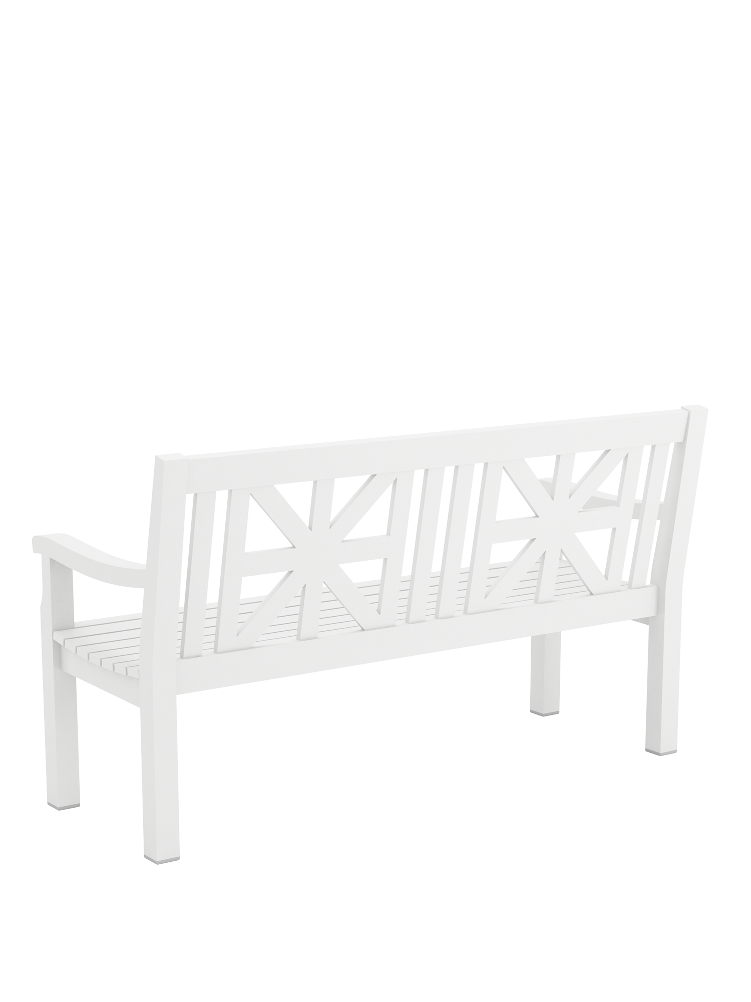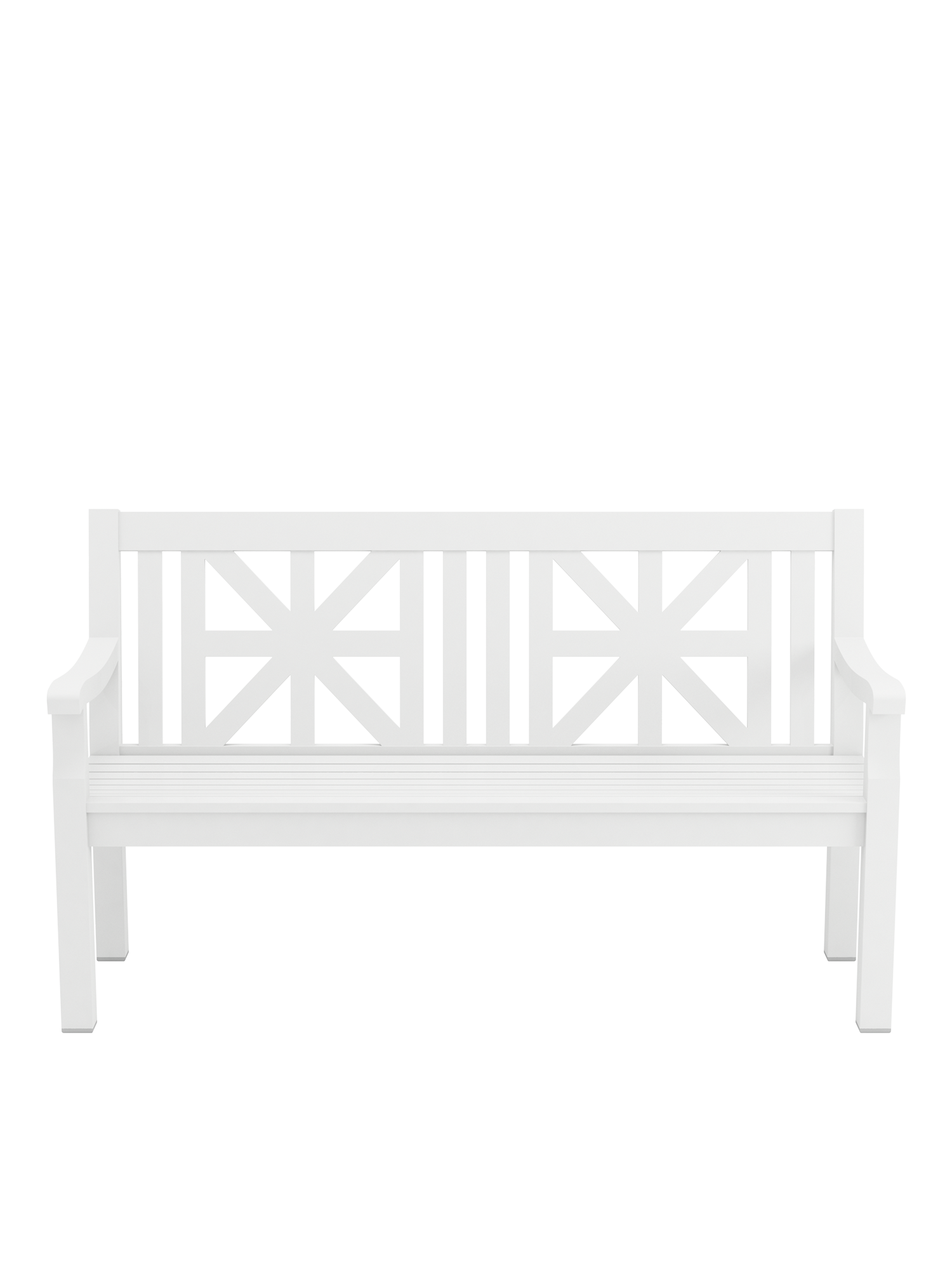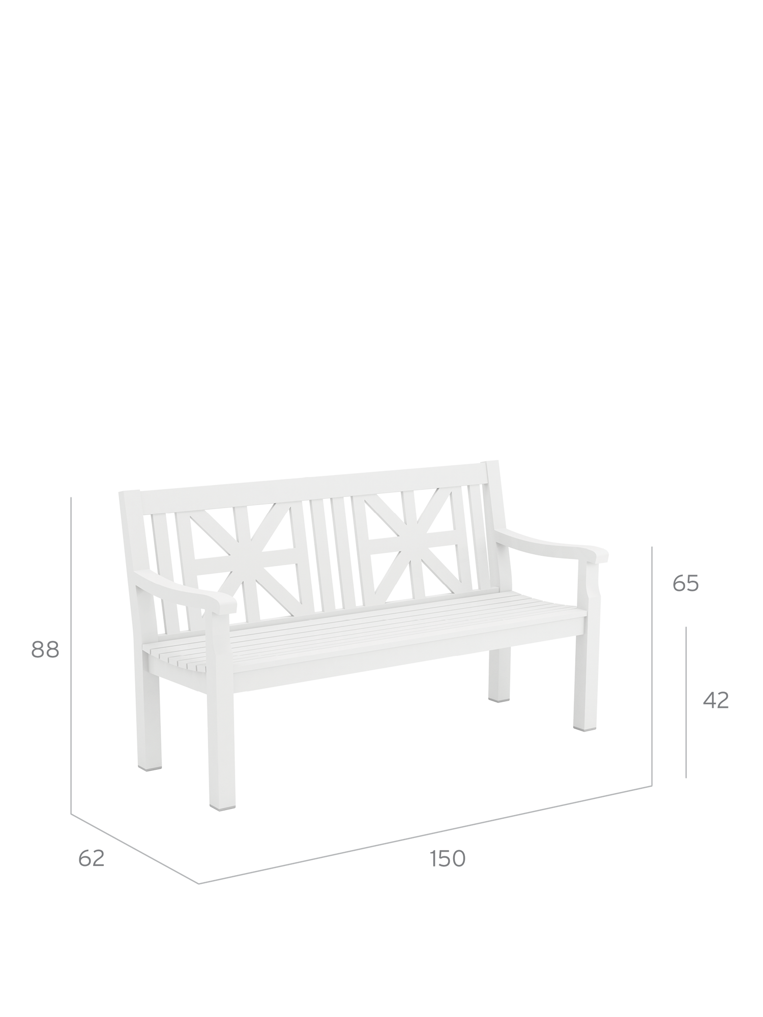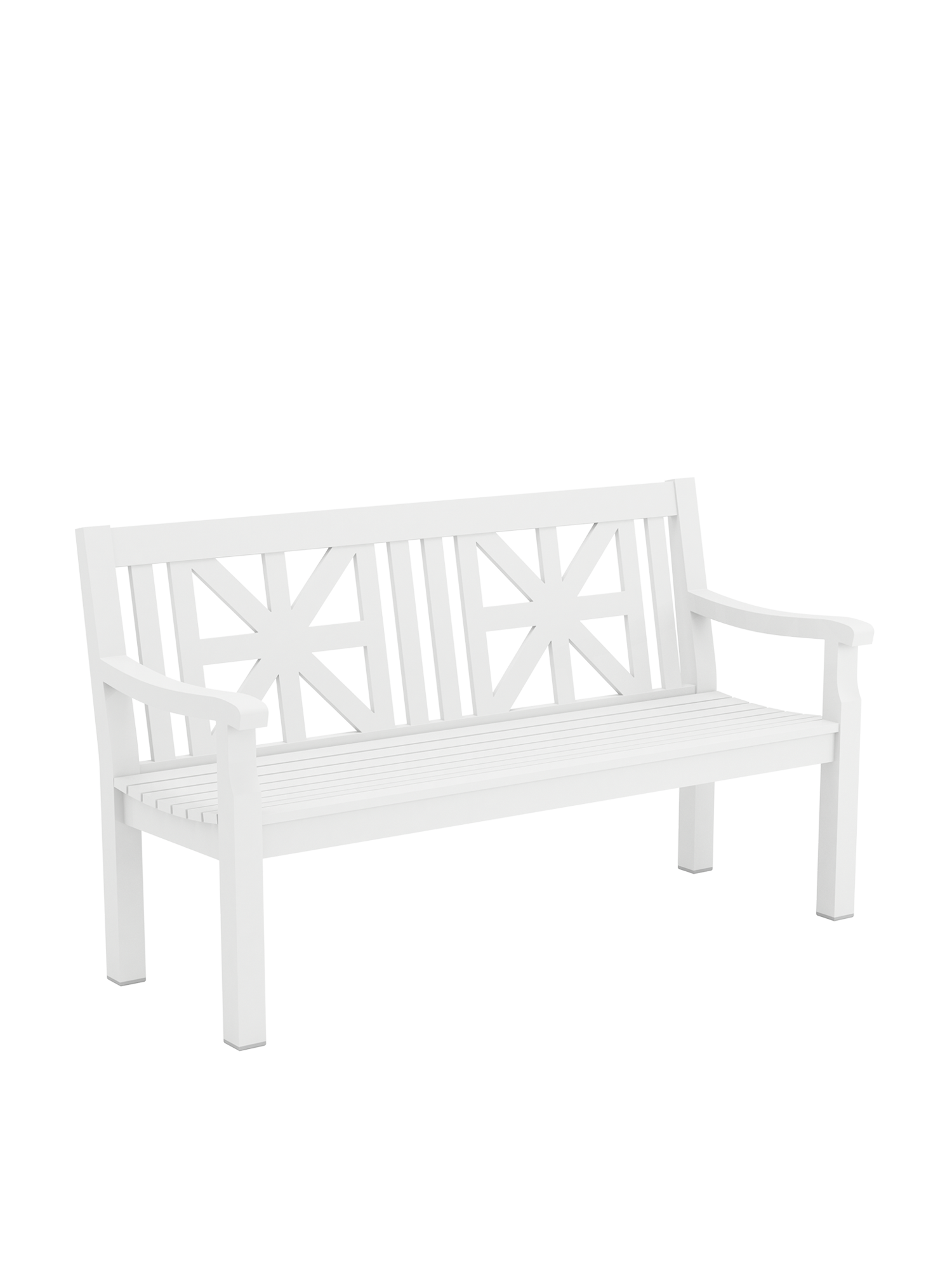 The white aluminium bench creates an idyllic country feeling everywhere. Its handcrafted look is reminiscent of traditional wooden furniture, but so much easier to care for. The star design, profiles and wooden armrests are hand-welded, polished and powder-coated; making each one unique. Height-adjustable floor-gliders of synthetic material protect the beautifully crafted material. A ground fastener is also avaible. Please contact us in this regard.