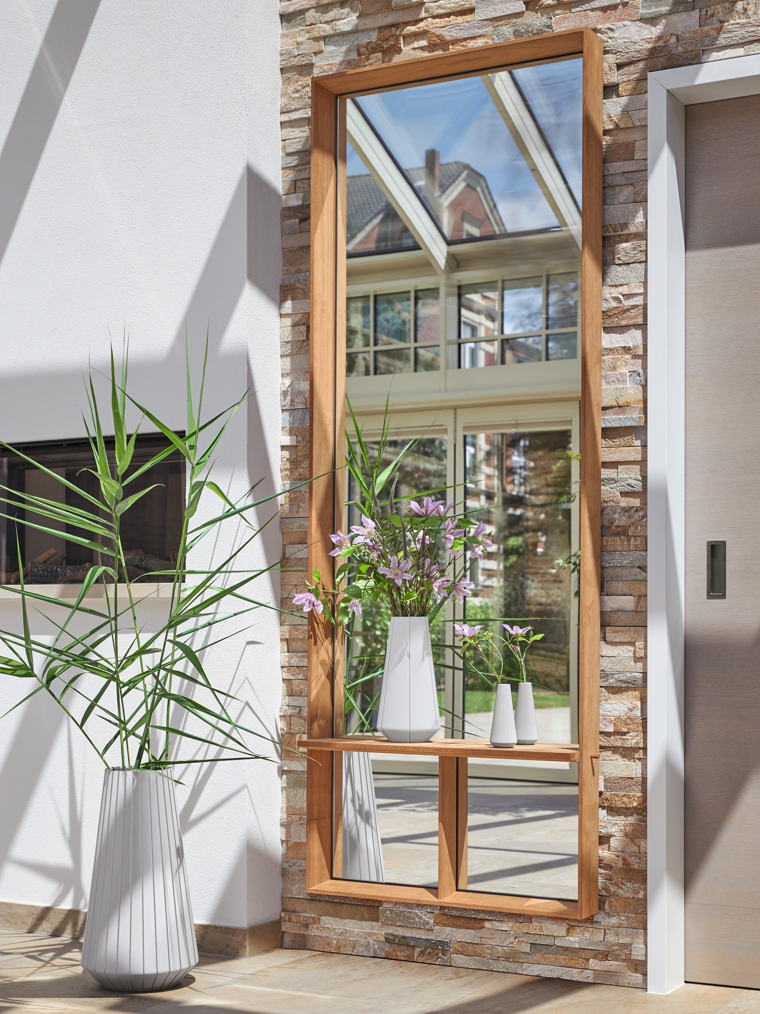 High and narrow, high and wide, narrow and horizontal: the large Fascino mirrors in various sizes and formats and can be hung up indoors or outdoors as desired. Vases and accessories can be decorated particularly impressive on their elegant shelves. The high-quality, weatherproof teak frames are equipped with drip edges. Nevertheless, a dry, protected place on the house wall or under the eaves is recommended for the use.
