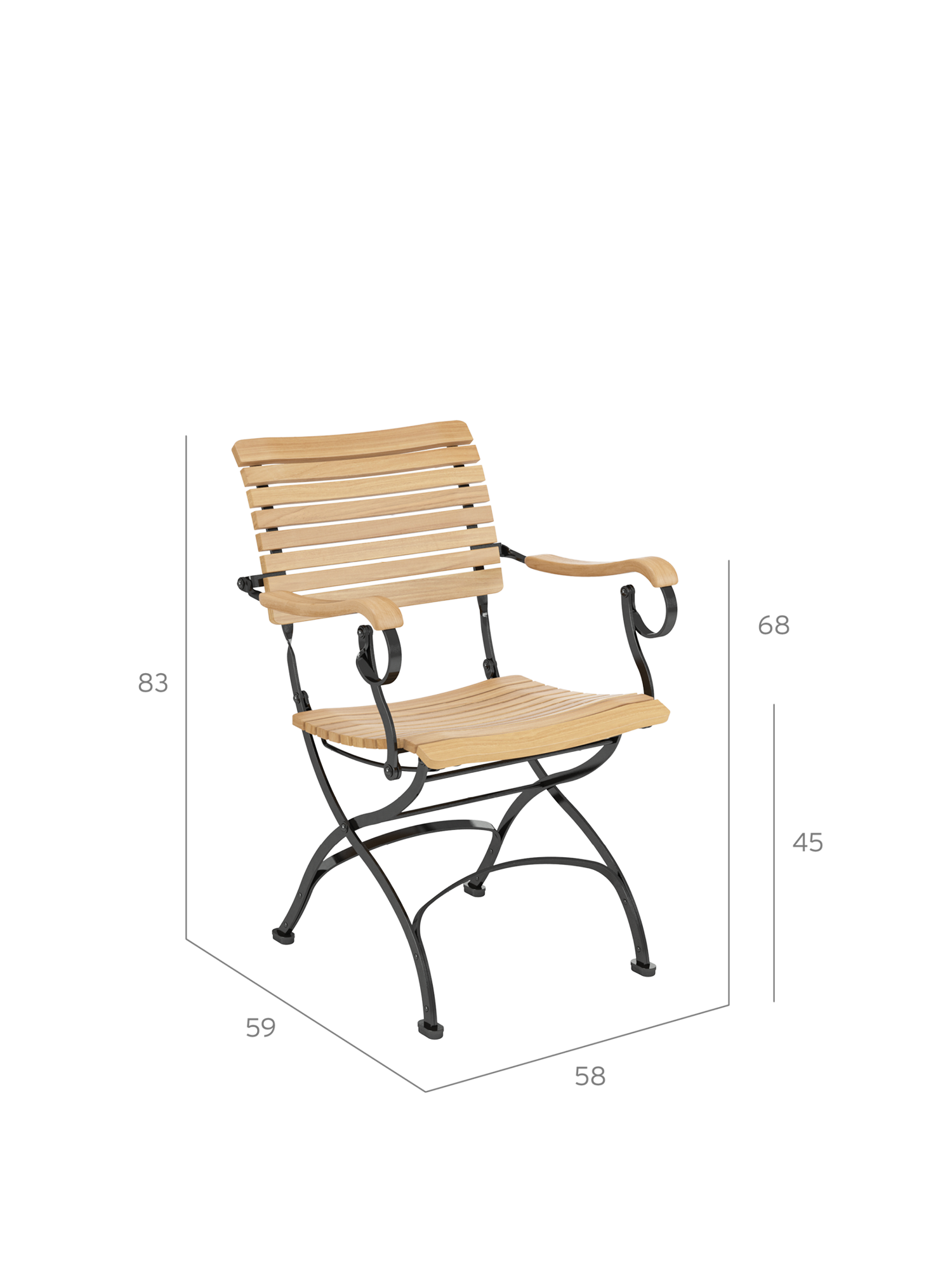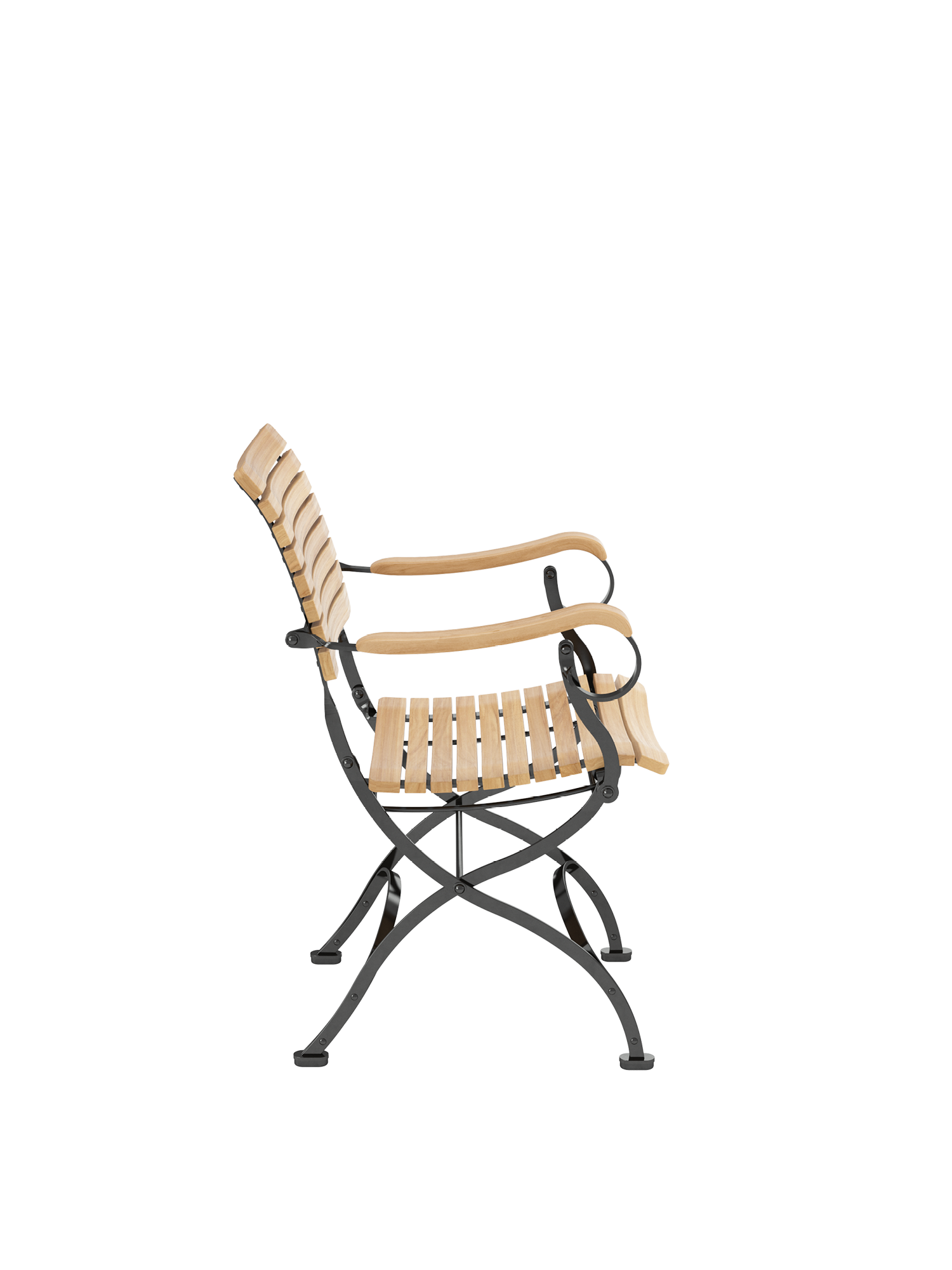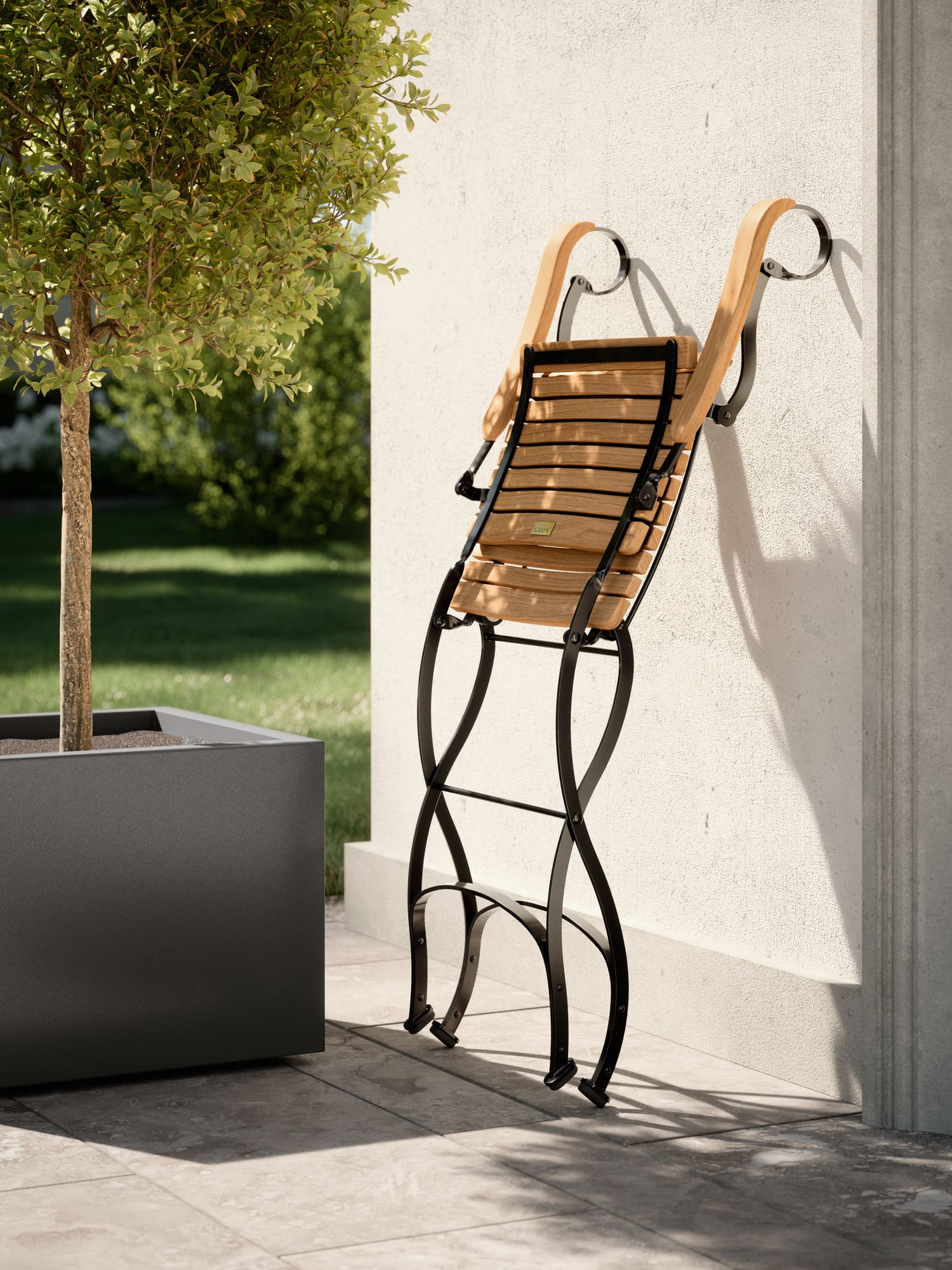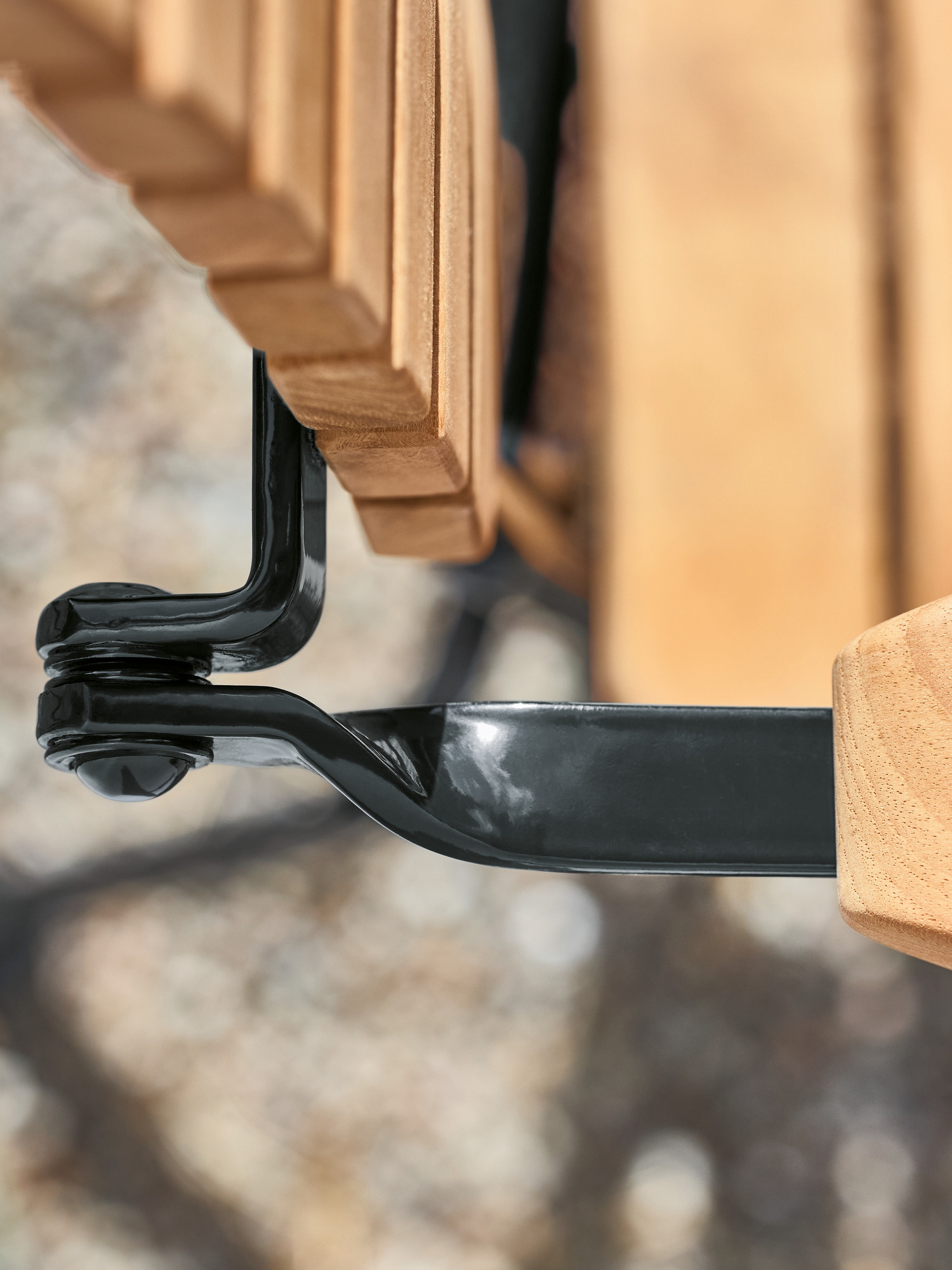 For easy and long-term outdoor use, all bolts of the joints are made of stainless steel, in rust-proof bearings. Polyamide runners under the seat ensure a smooth folding action and protect the powder-coated metal. The frame is made from galvanised, and therefore rust-protected, powder-coated steel. When folded, the armchair is only 15 cm deep. Foot gliders of hard-wearing synthetic material protect valuable flooring from scratches.