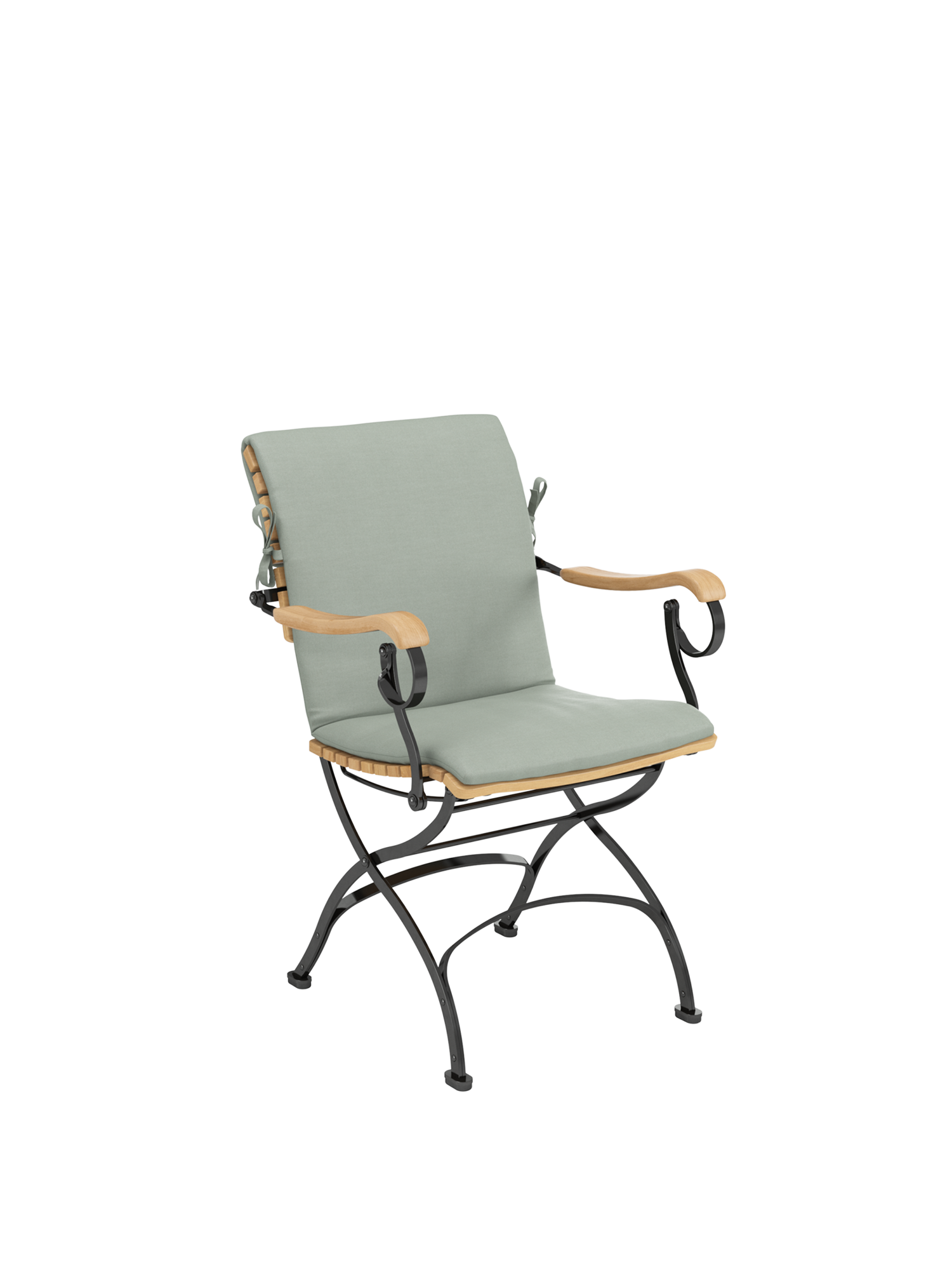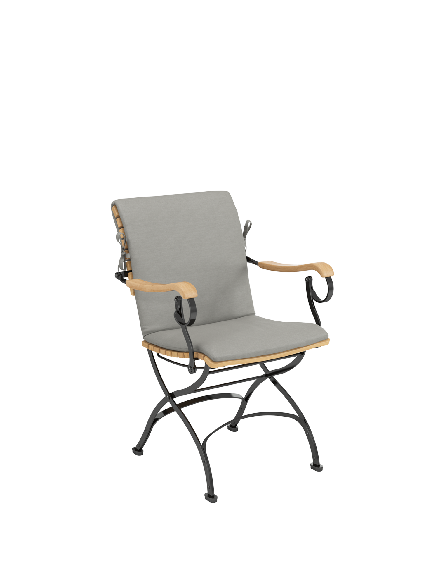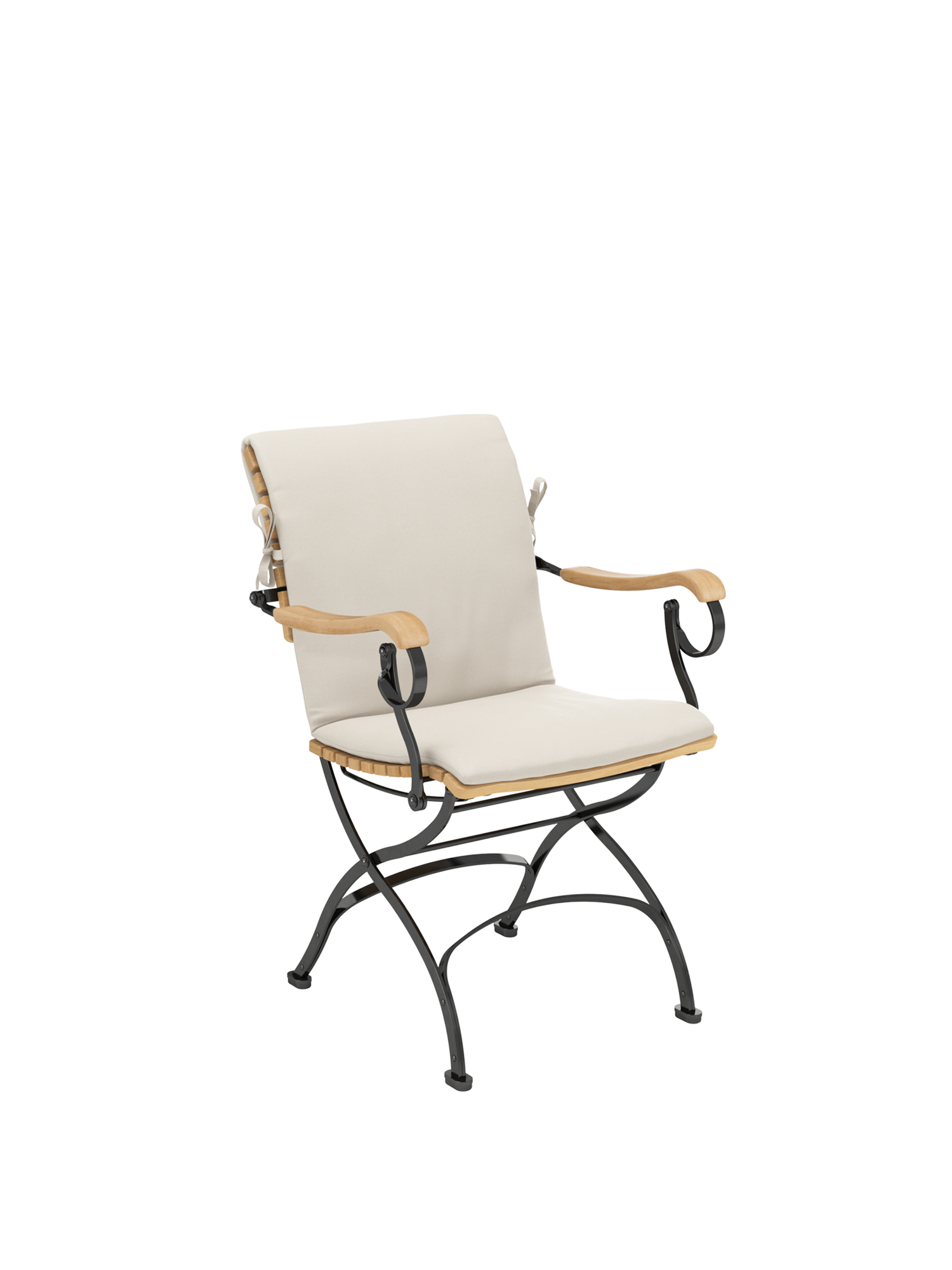 Considered the prototype of the garden chair, it now offers unparalleled comfort. Garpa has perfected the original made of teak and steel to meet the highest standards. The backrest of the Fontenay armchair is made of solid, closely-placed teak slats. Their shape is modelled according to one of the most unusual curvatures, that of the human spine. The armrests made of plantation teak are pleasant to the touch and relax the body. The large seating area of teak is shaped three-dimensionally for it to really fit the body. It is rounded at the front to improve upper leg comfort. Cushions in various colours increase the comfort of the furniture and set fine accents.