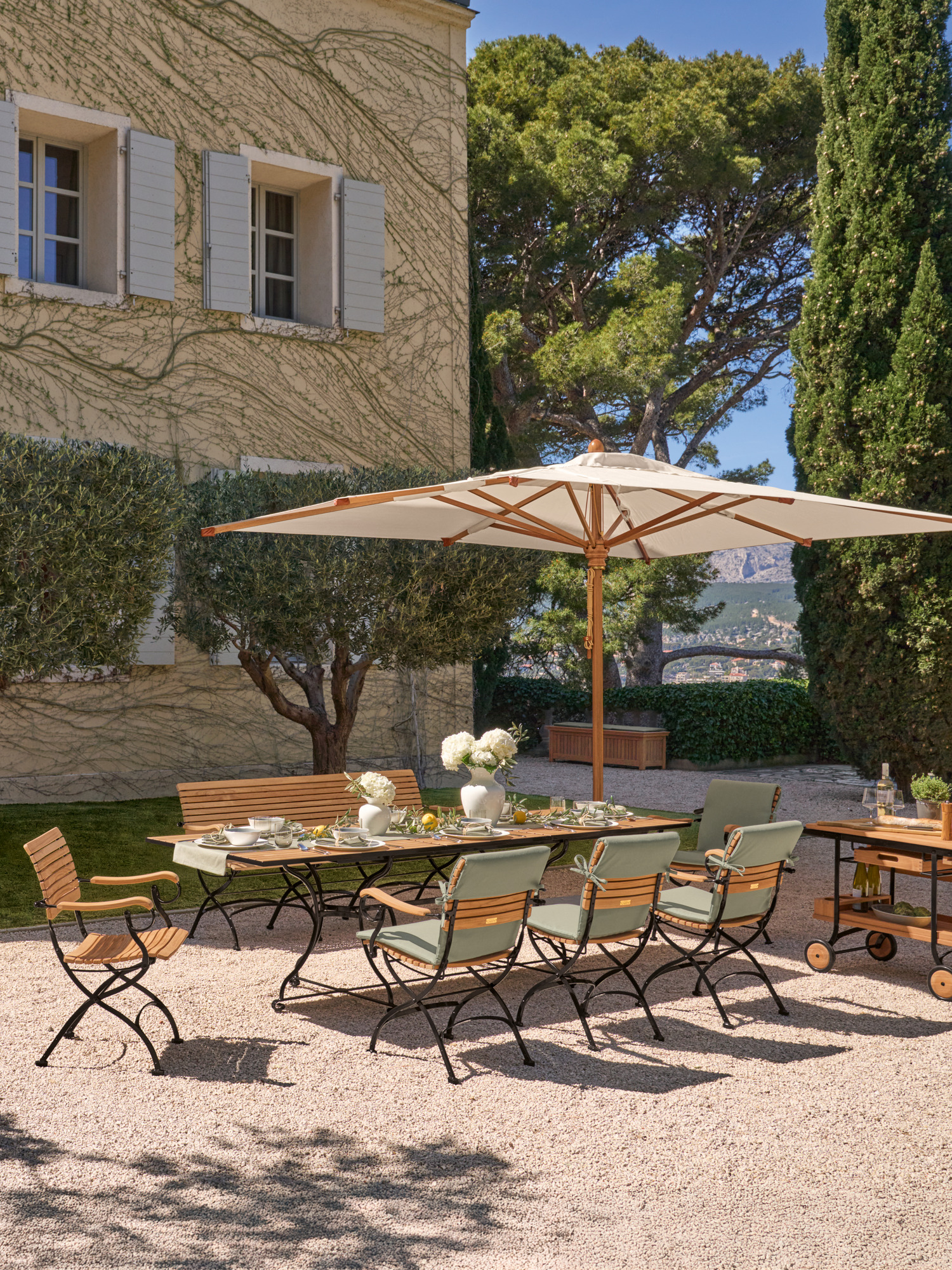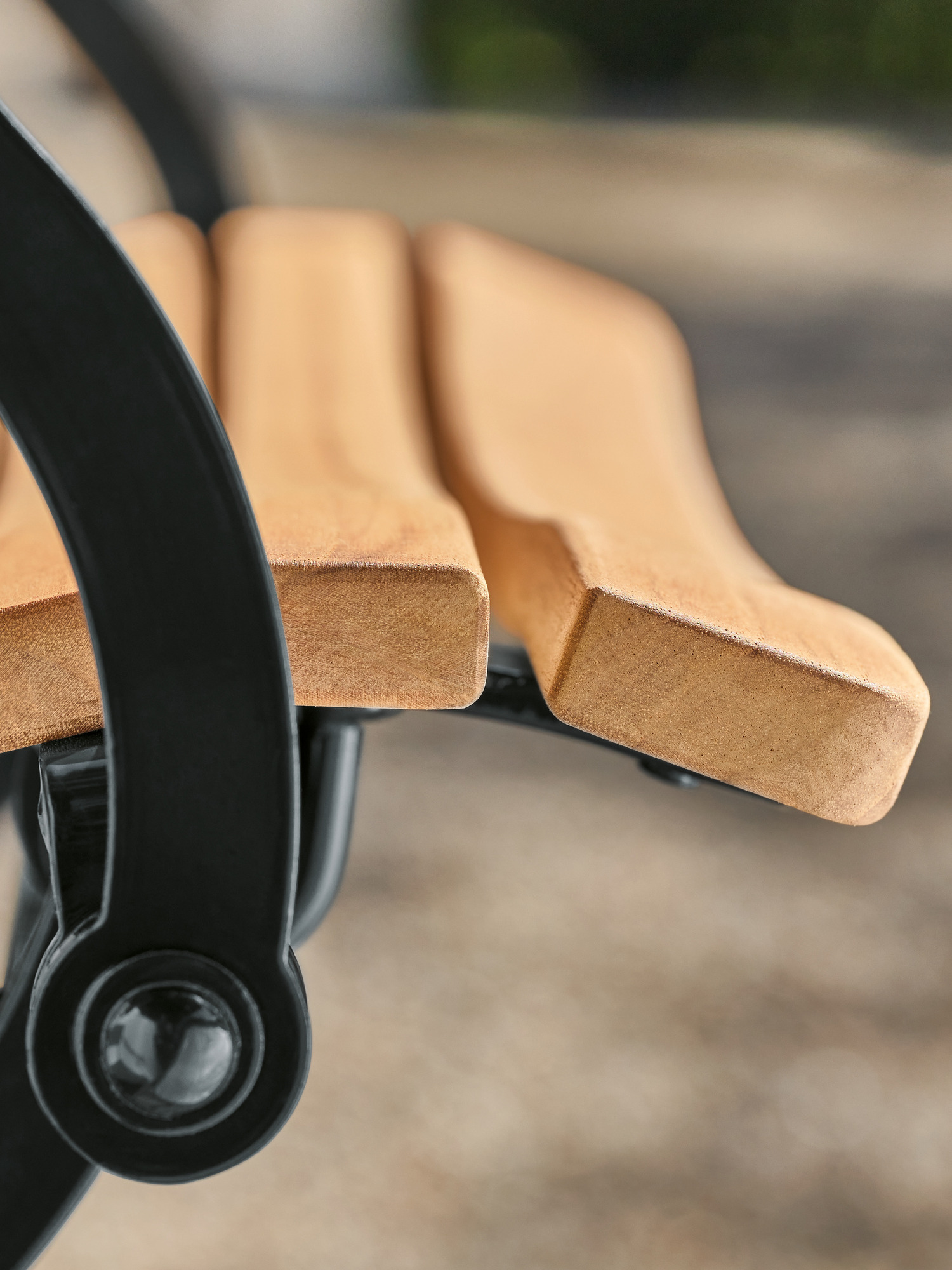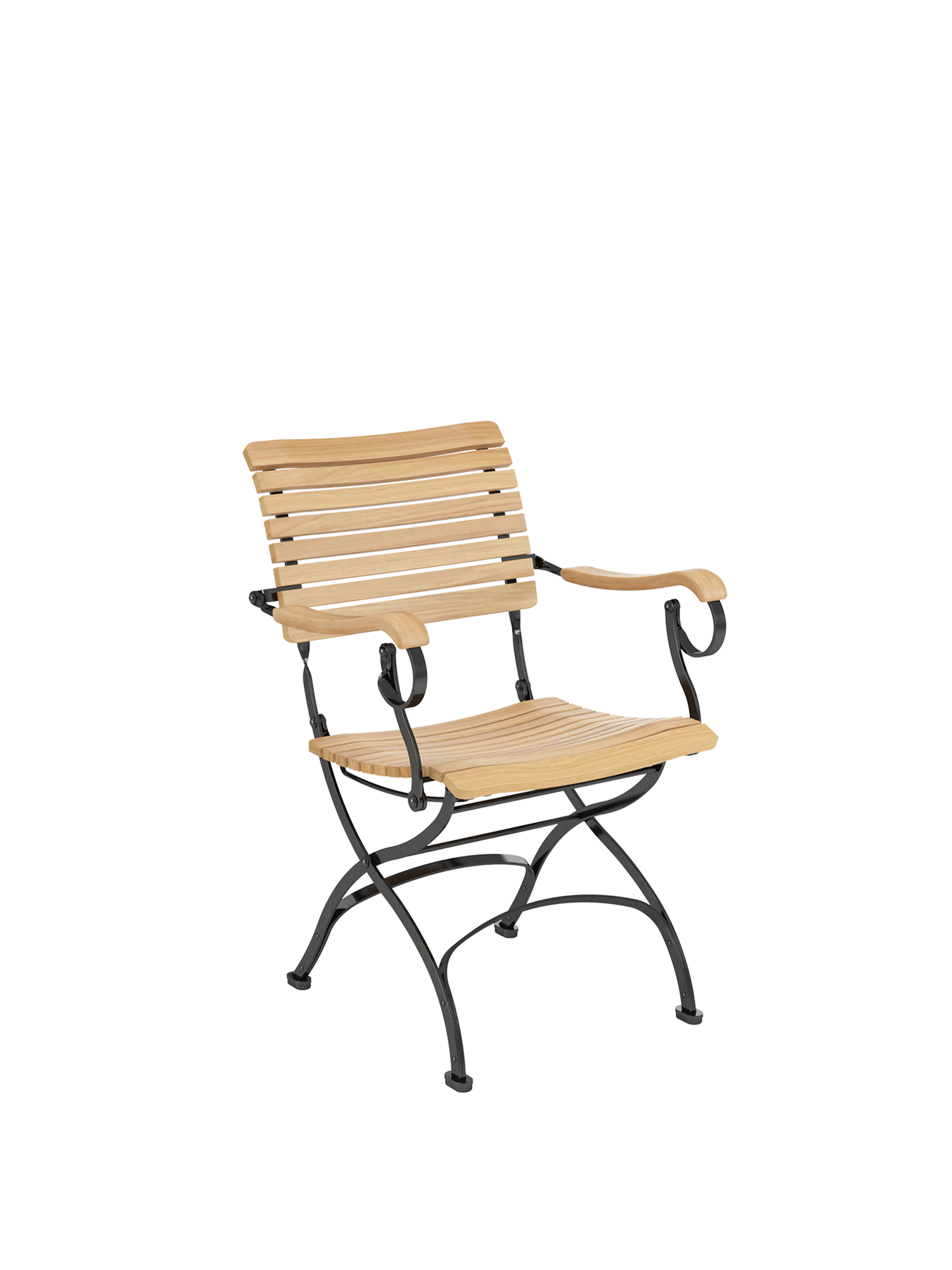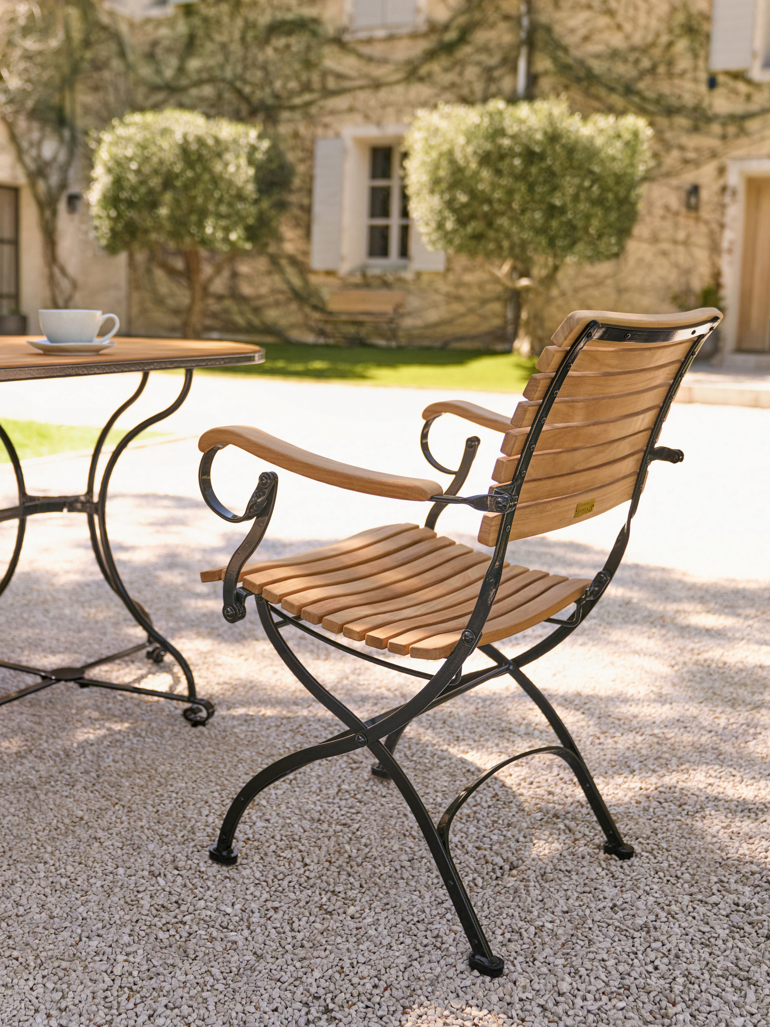 Considered the prototype of the garden chair, it now offers unparalleled comfort. Garpa has perfected the original made of teak and steel to meet the highest standards. The backrest of the Fontenay armchair is made of solid, closely-placed teak slats. Their shape is modelled according to one of the most unusual curvatures, that of the human spine. The armrests made of plantation teak are pleasant to the touch and relax the body. The large seating area of teak is shaped three-dimensionally for it to really fit the body. It is rounded at the front to improve upper leg comfort. Cushions in various colours increase the comfort of the furniture and set fine accents.