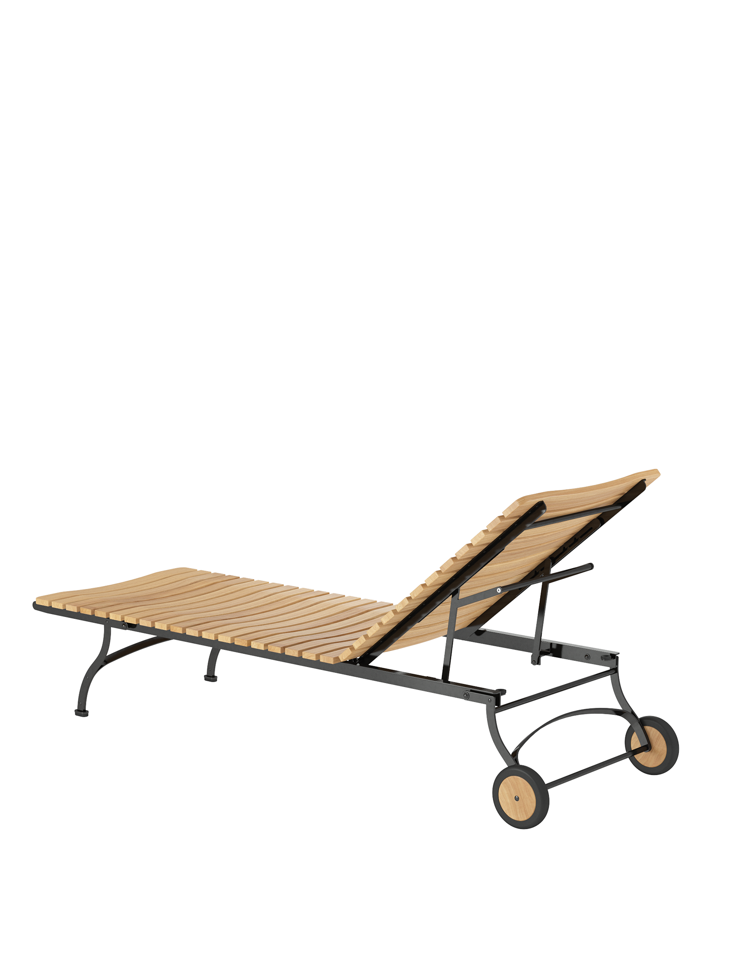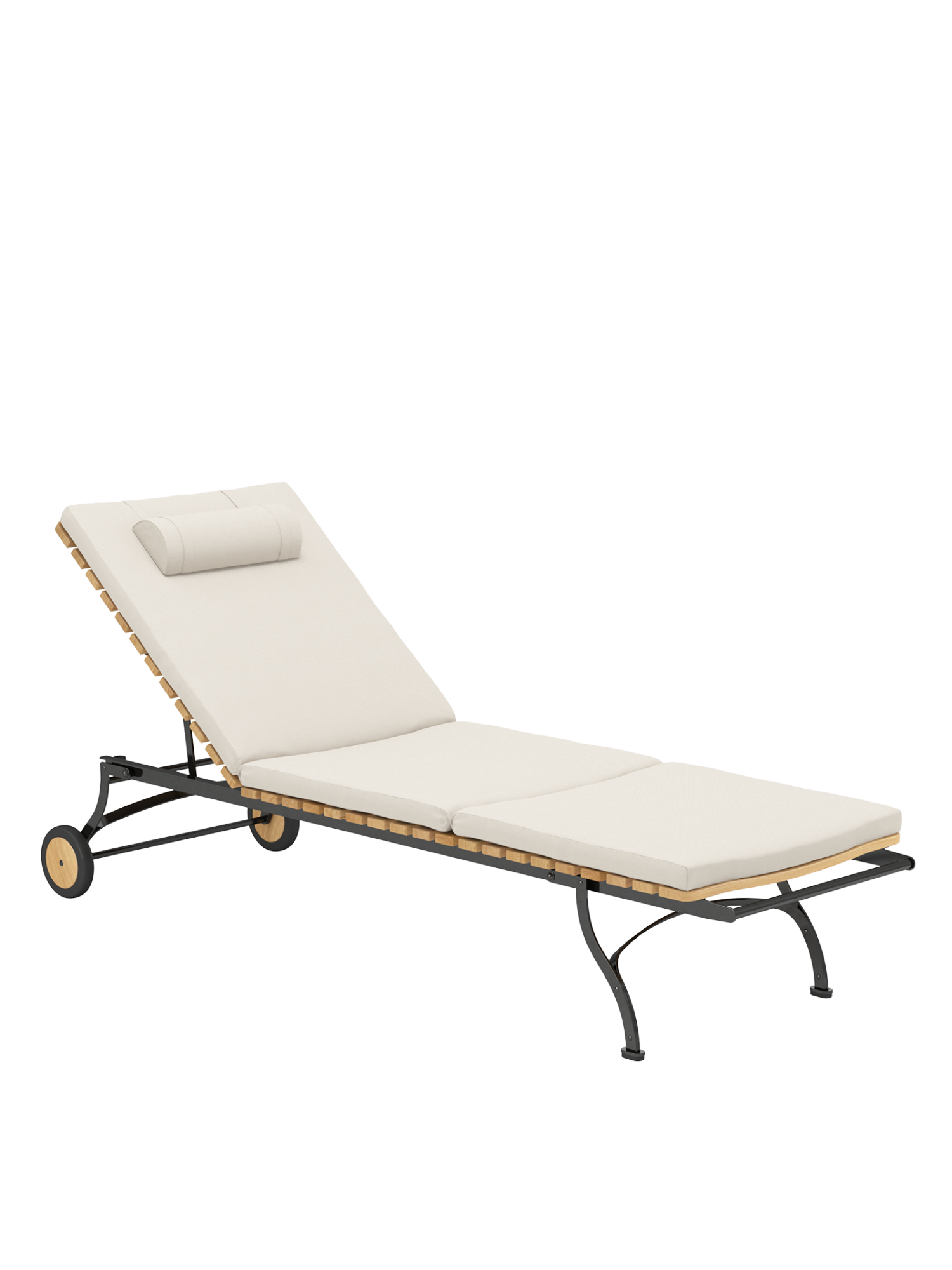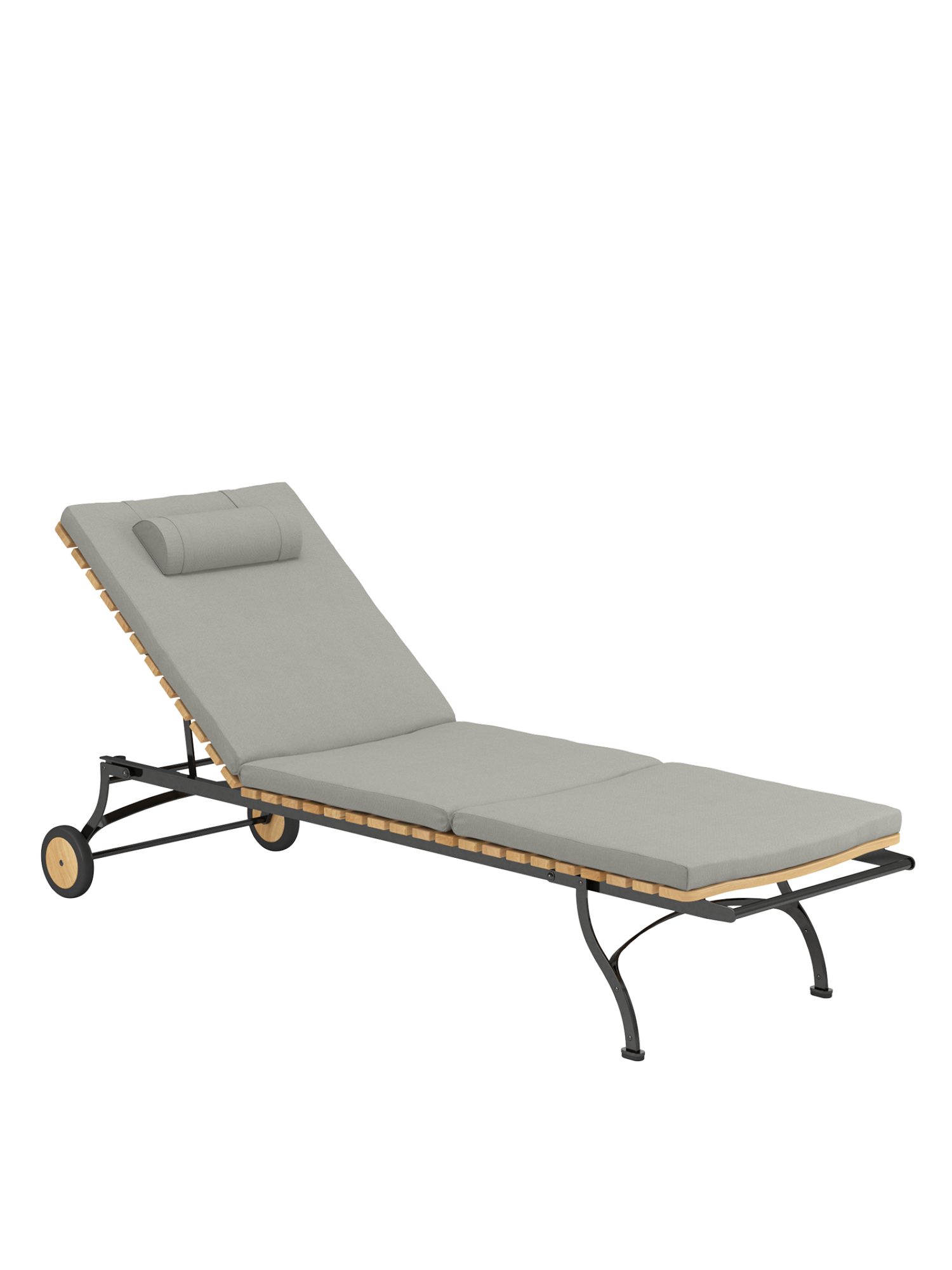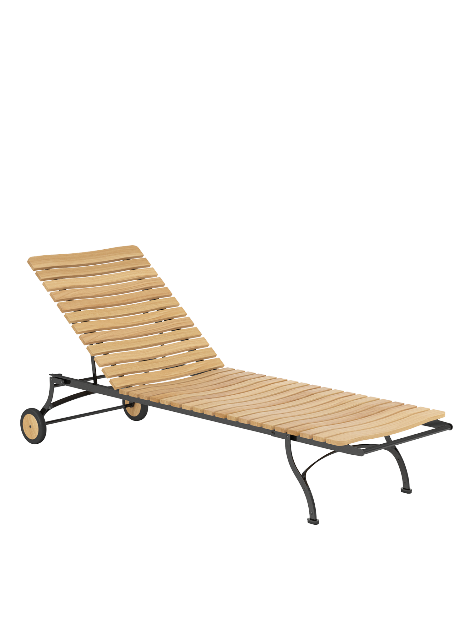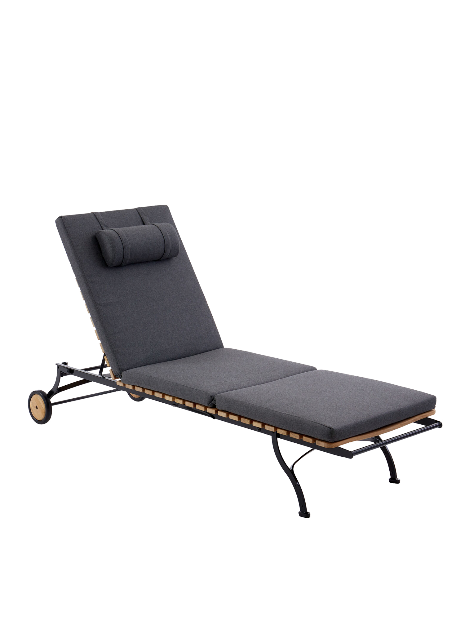 The frame is made of galvanised, rust-protected steel with a graphite black powder coating. Equipped with teak wheels, the lounger can be easily moved around the garden. Abrasion-resistant foot glides protect valuable floors from scratches.