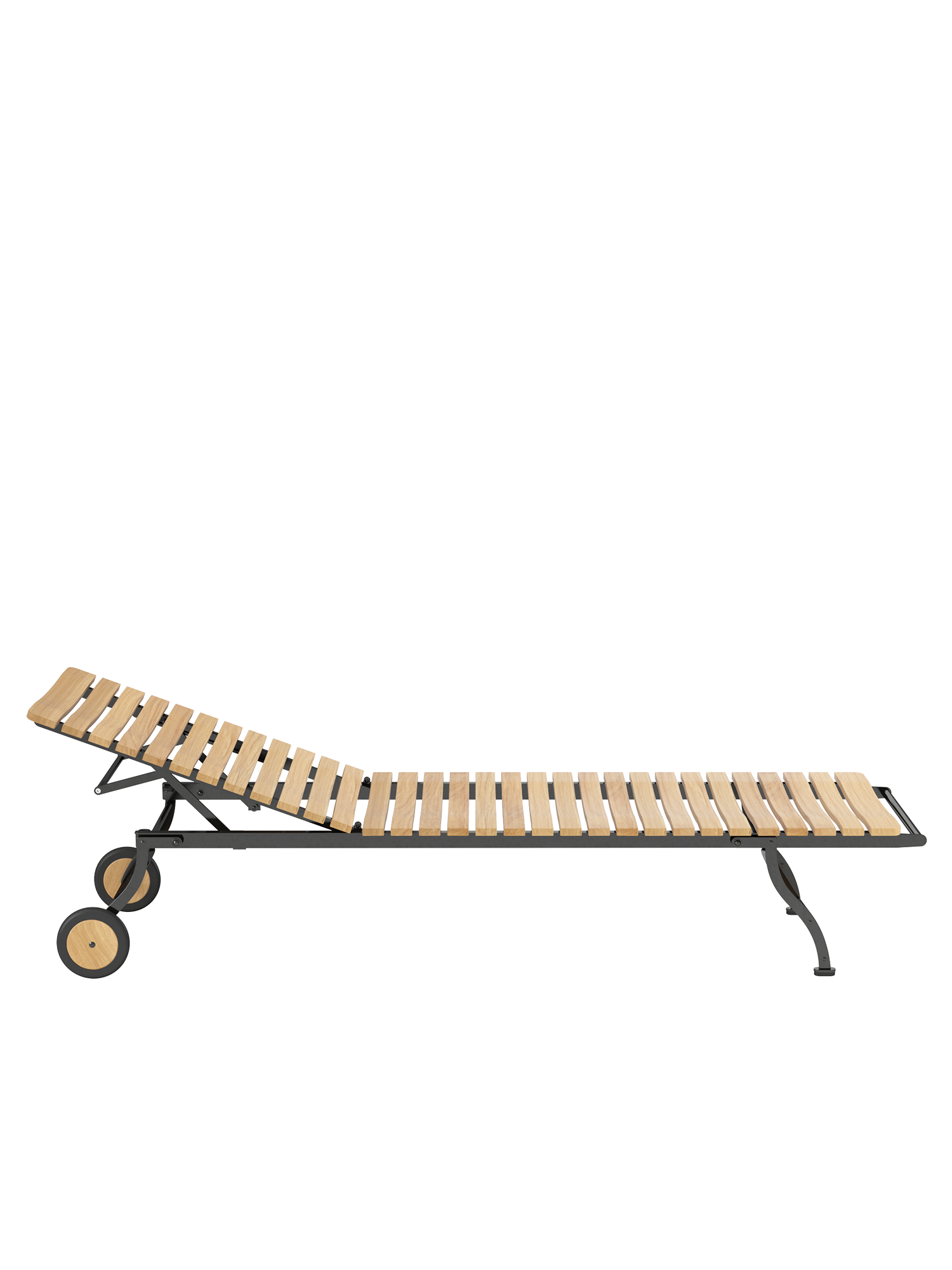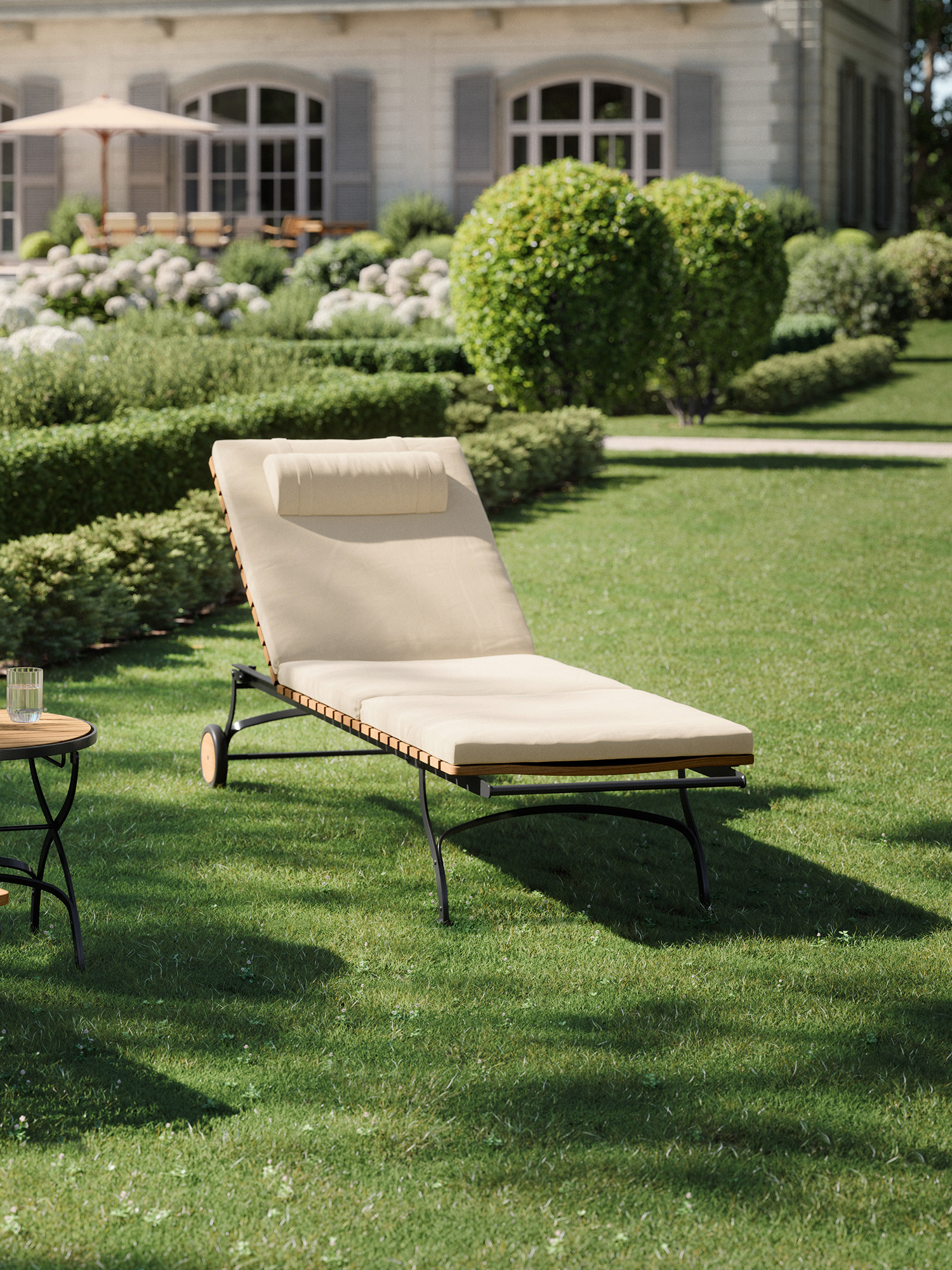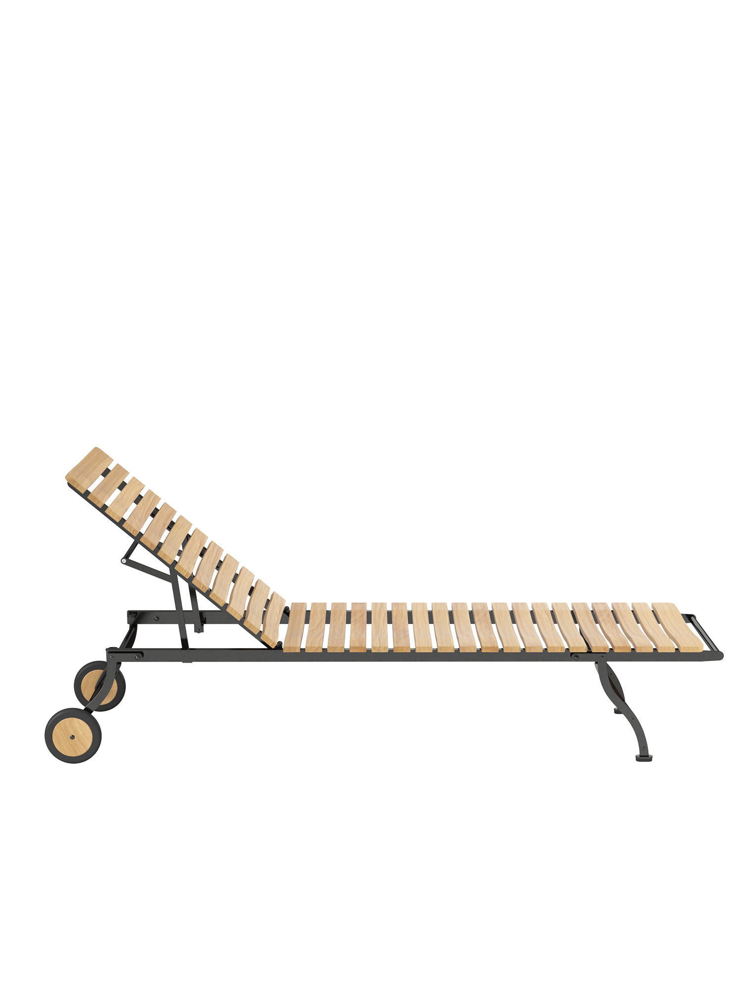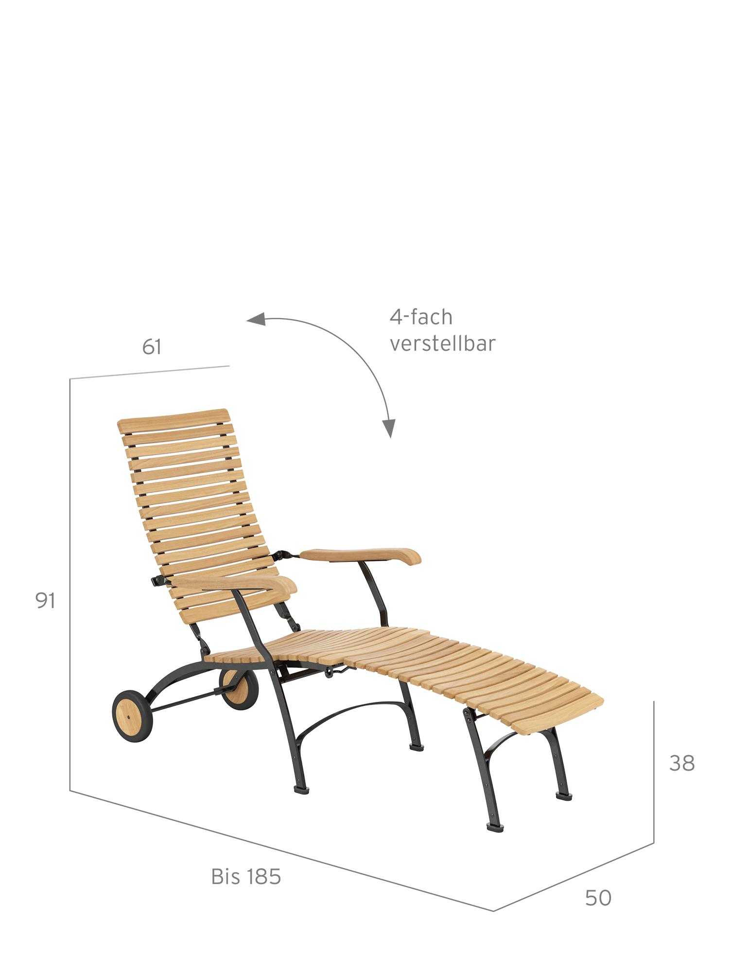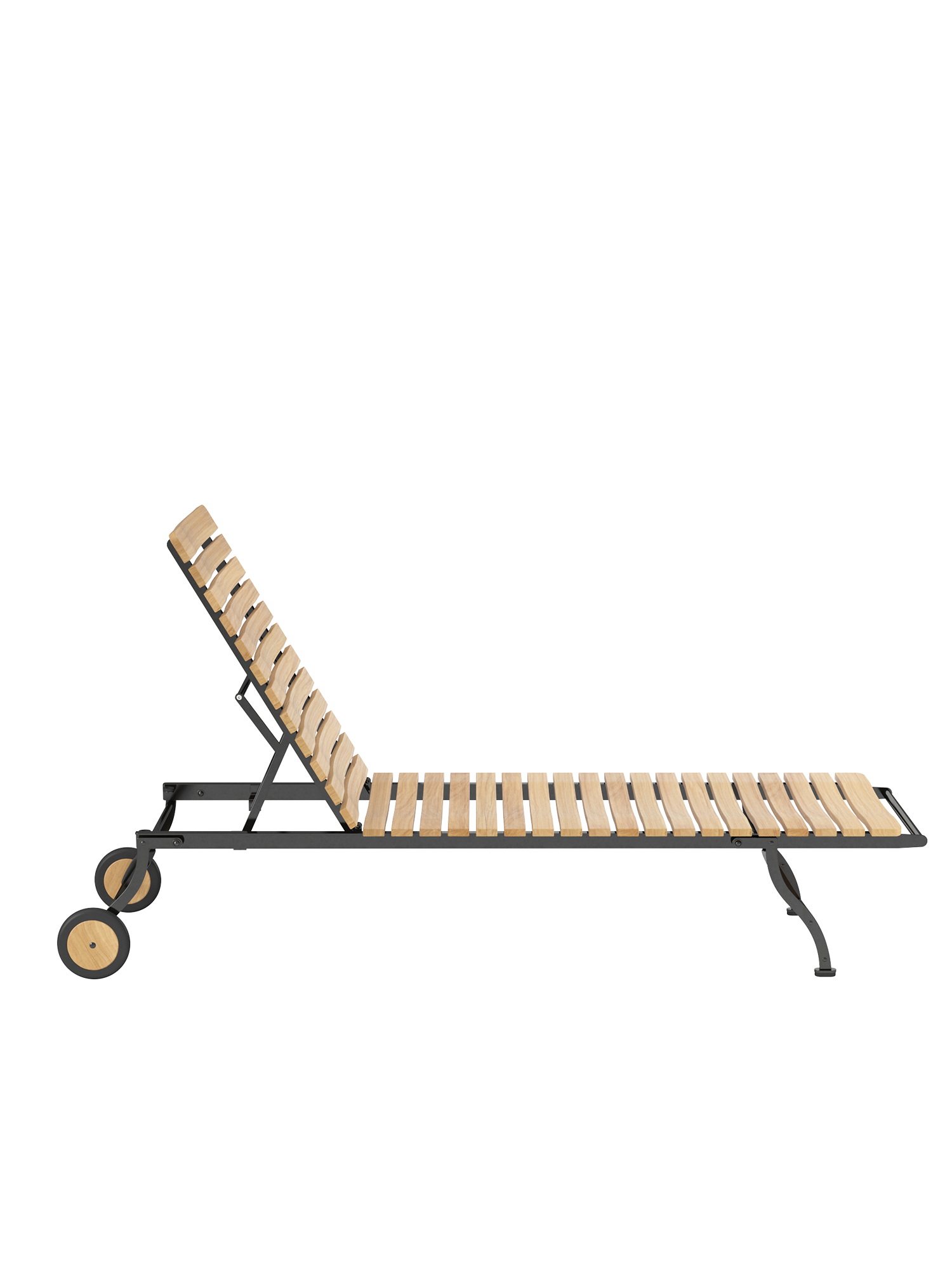 The frame is made of galvanised, rust-protected steel with a graphite black powder coating. Equipped with teak wheels, the lounger can be easily moved around the garden. Abrasion-resistant foot glides protect valuable floors from scratches.