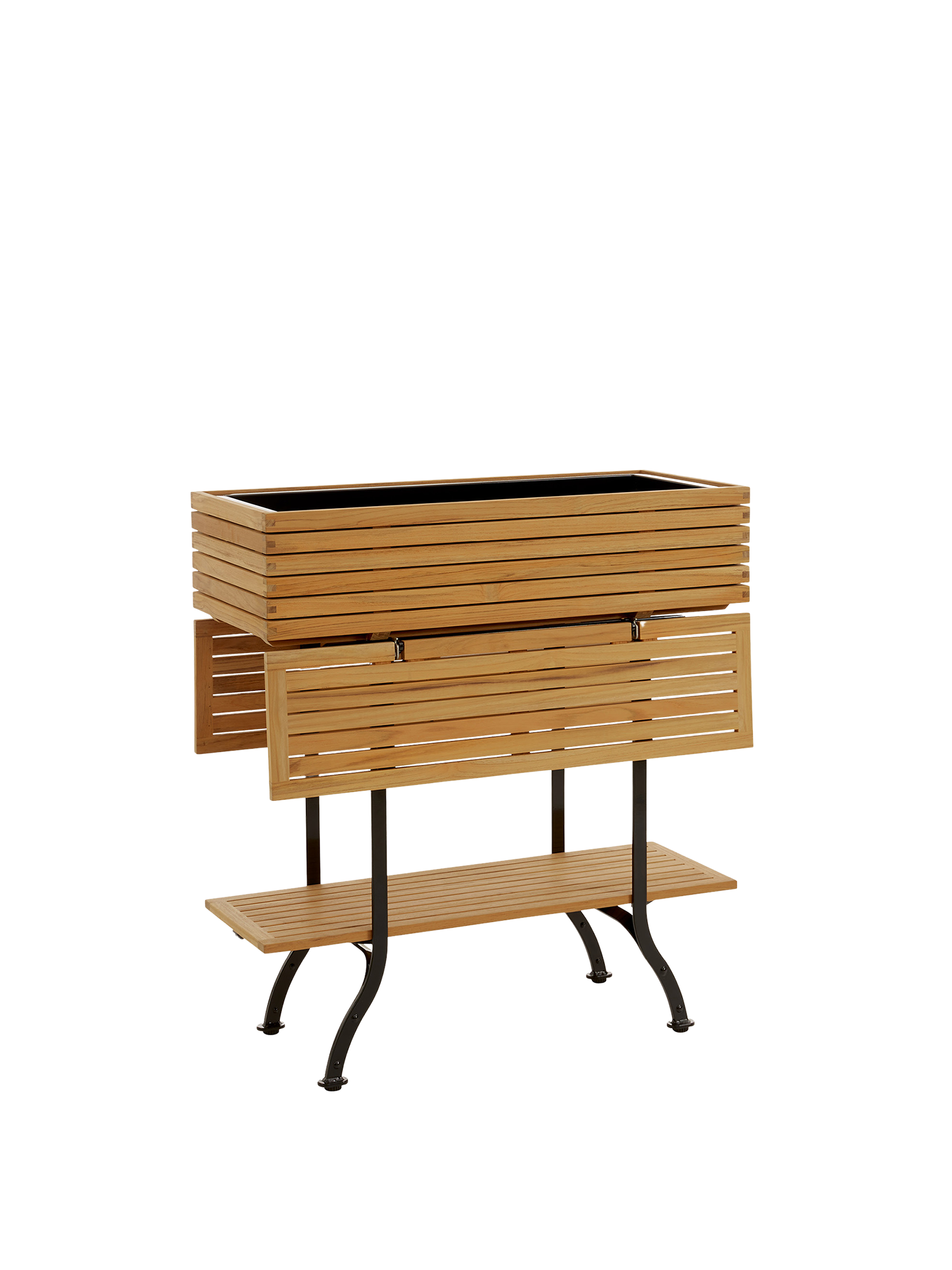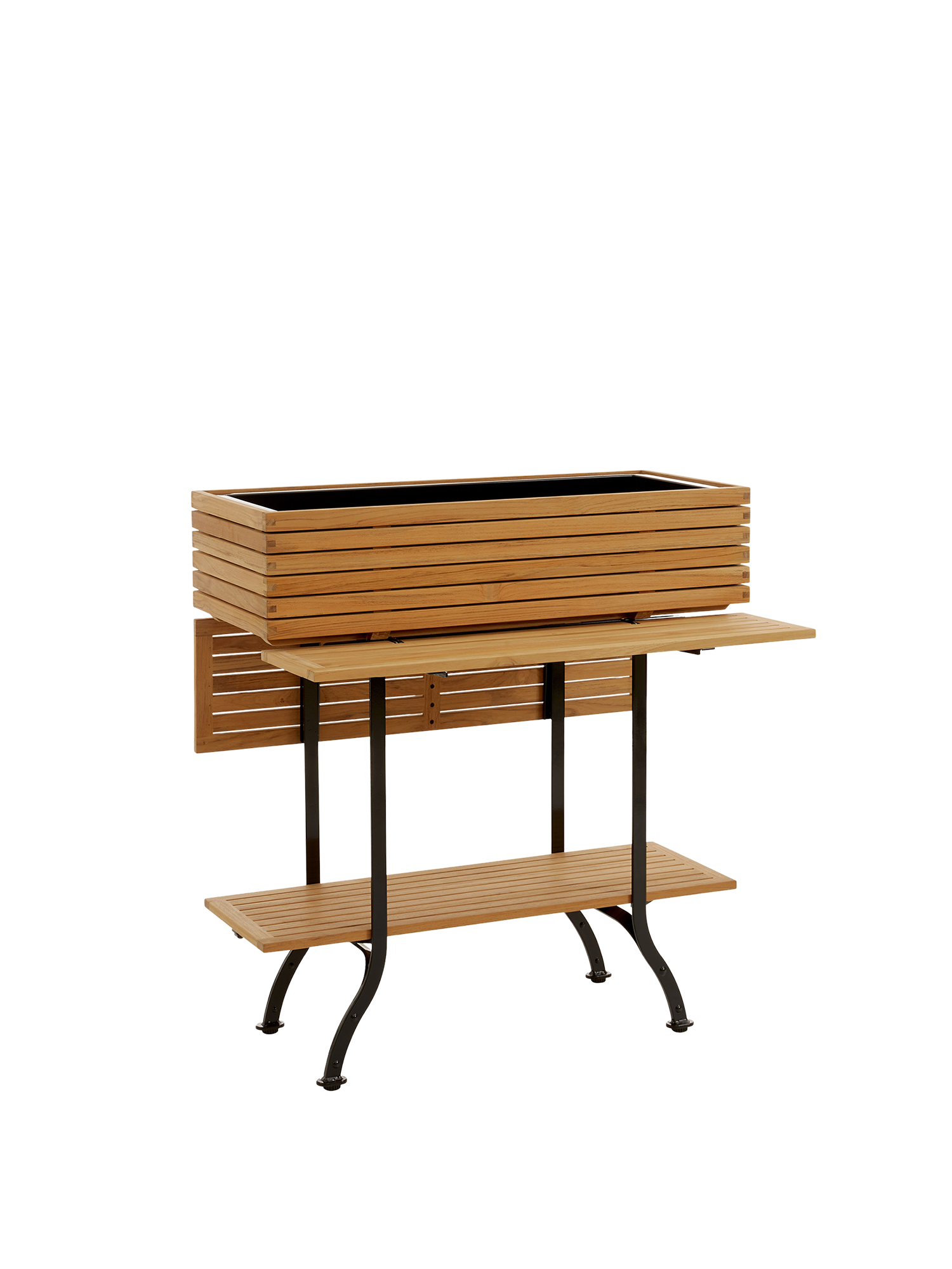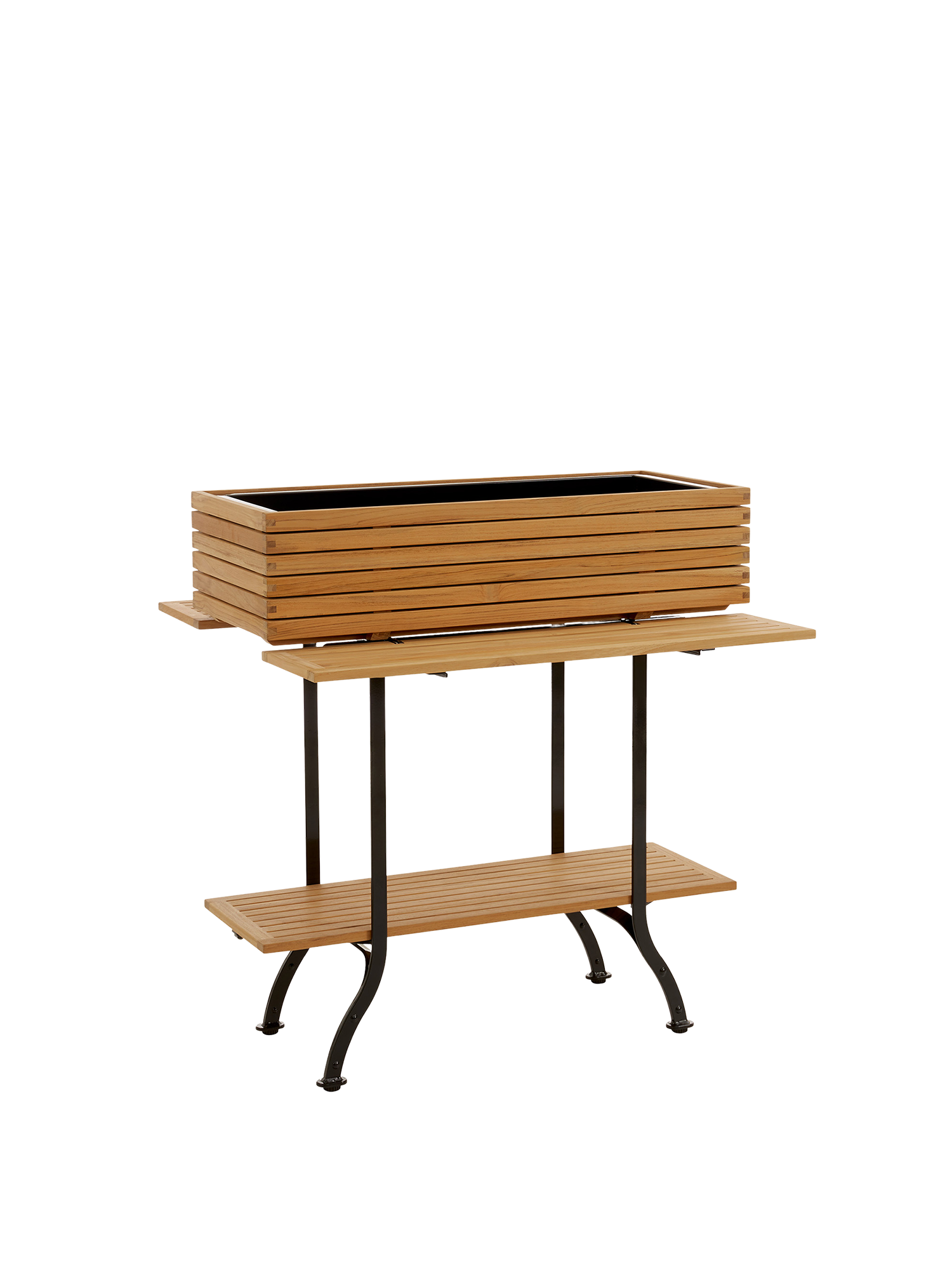 The frame is made from galvanised and therefore rust-protected steel, powder-coated in graphite black, the insert is made from aluminium with a black powder coating. Just as the practical shelf one level below, the outer case is made from massive teak slats.
