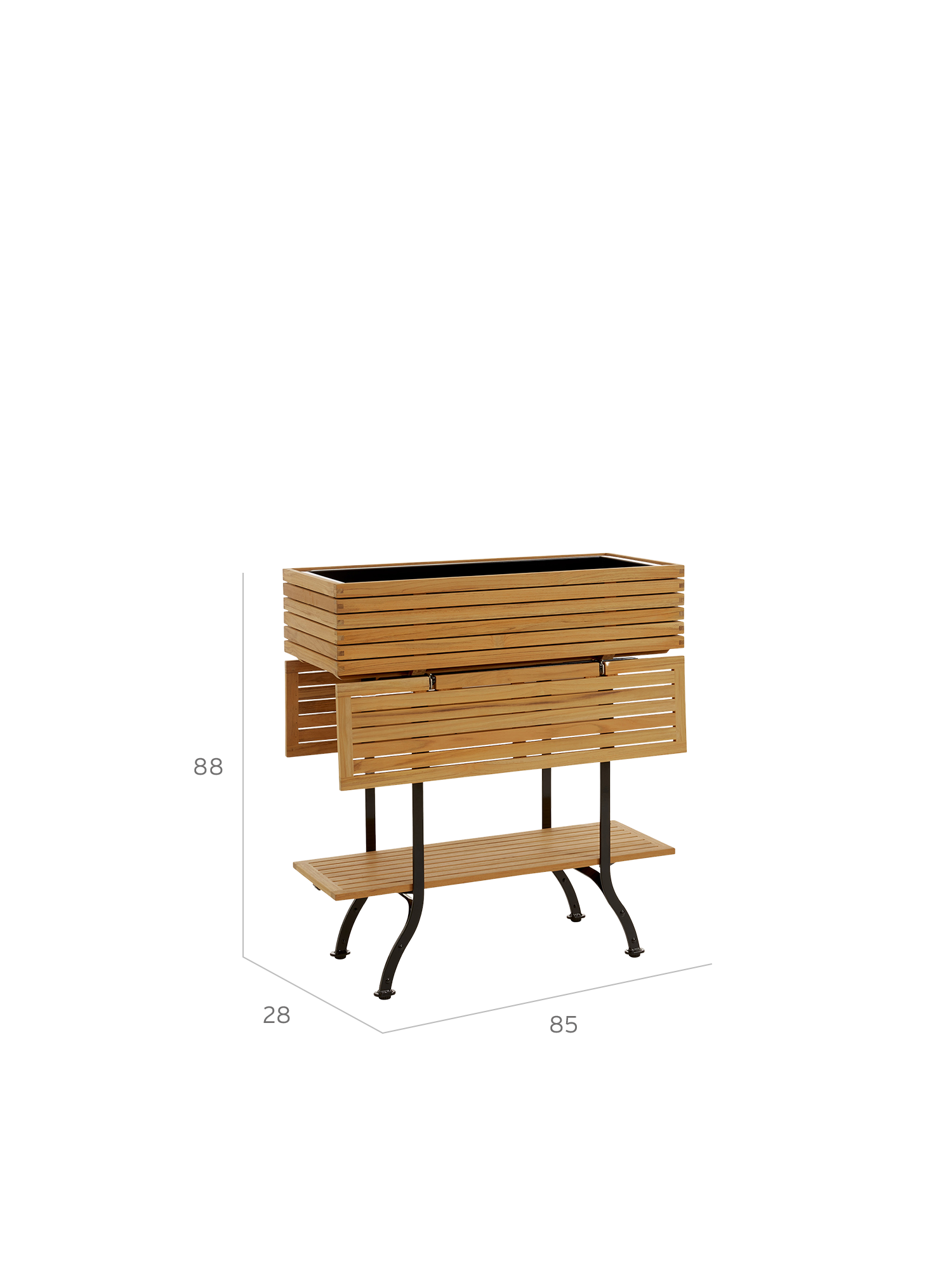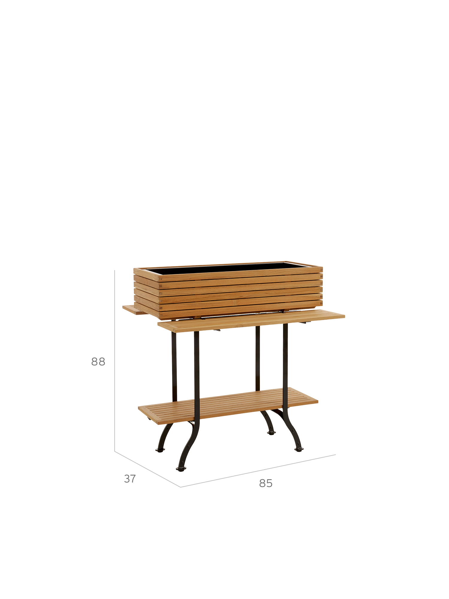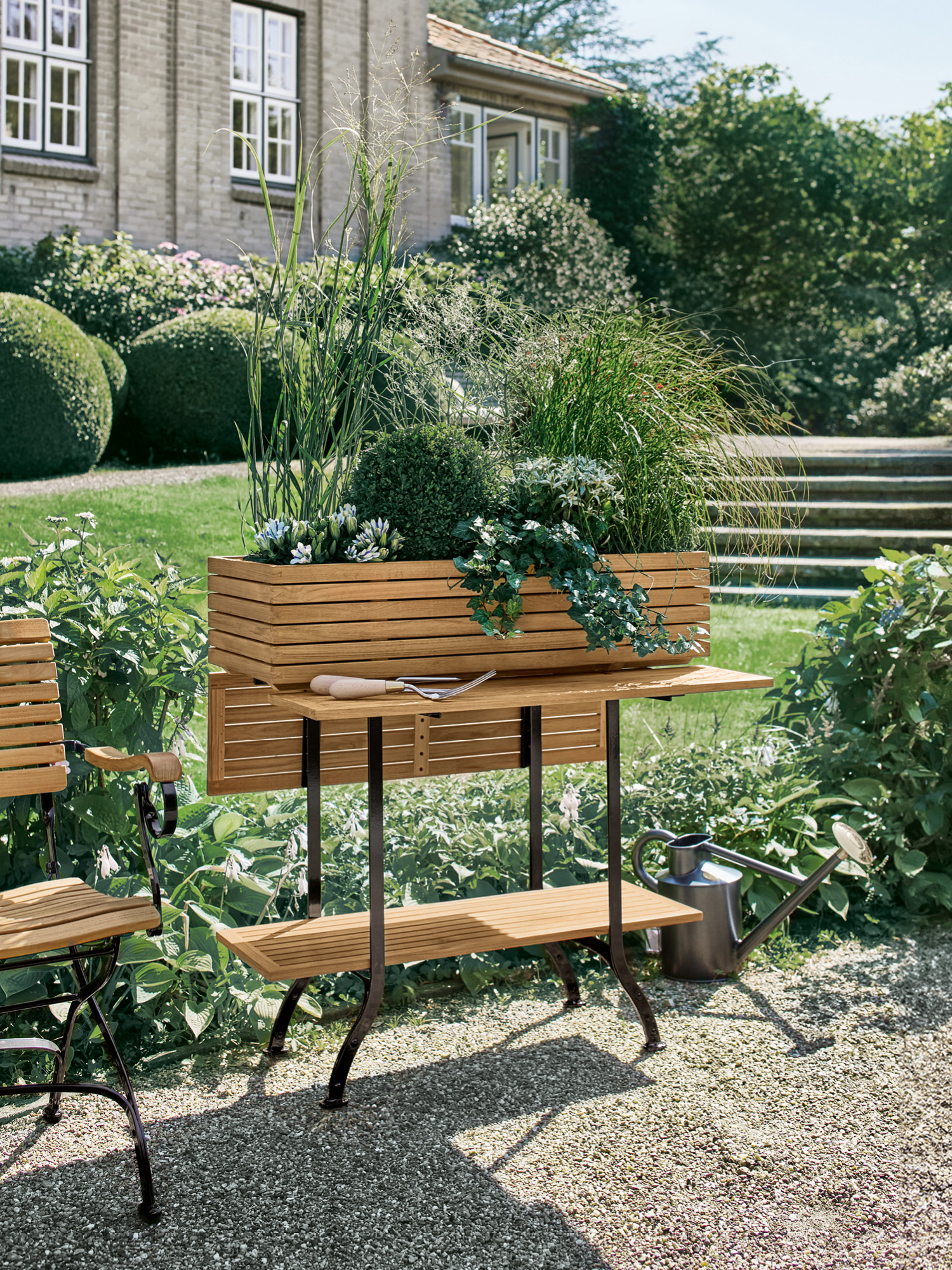 The frame is made from galvanised and therefore rust-protected steel, powder-coated in graphite black, the insert is made from aluminium with a black powder coating. Just as the practical shelf one level below, the outer case is made from massive teak slats.