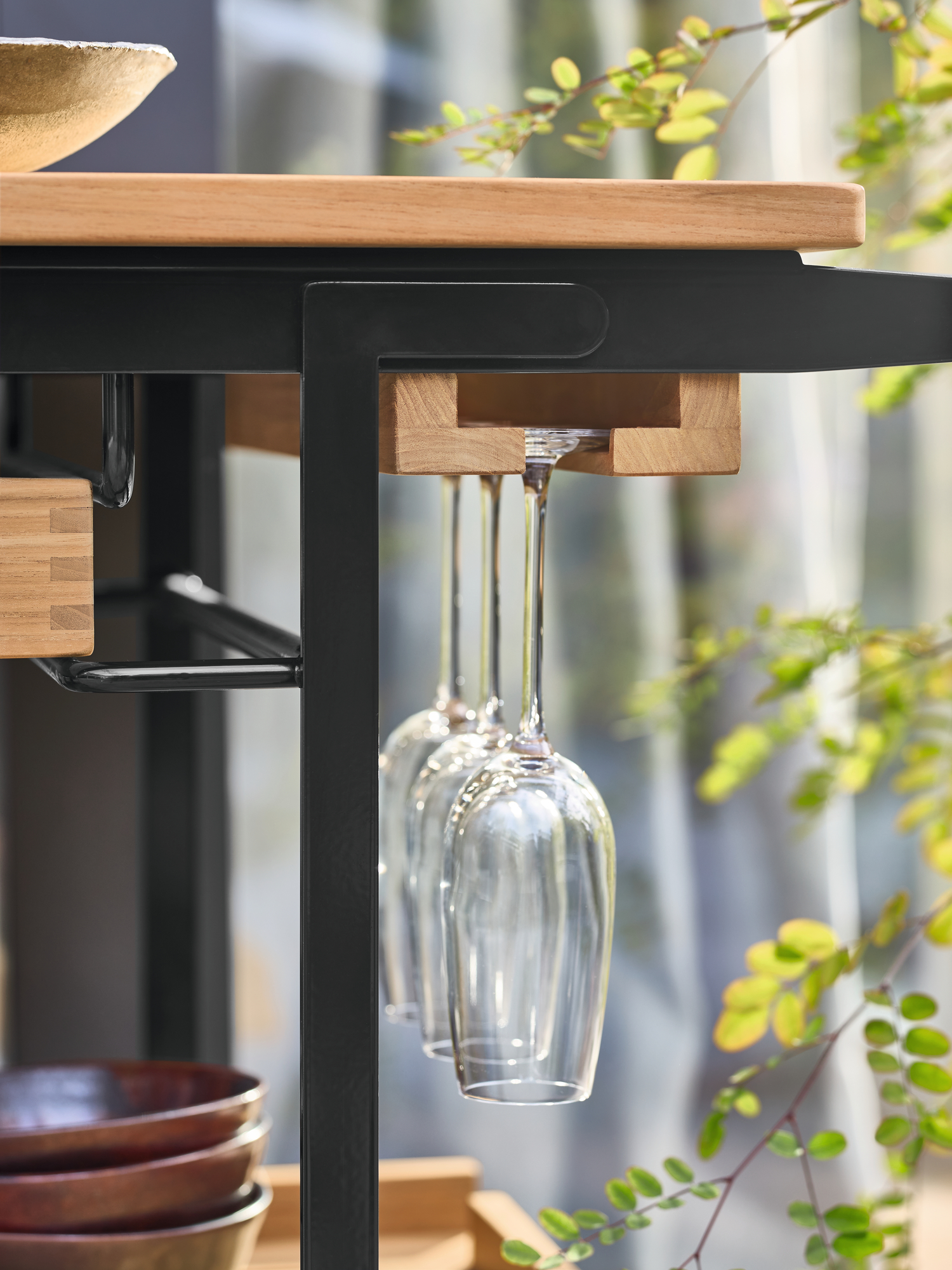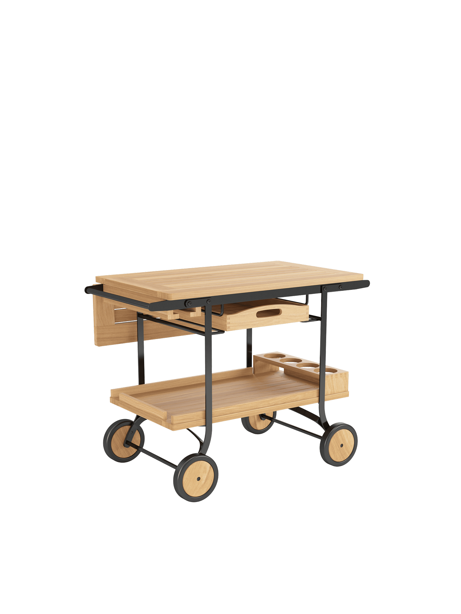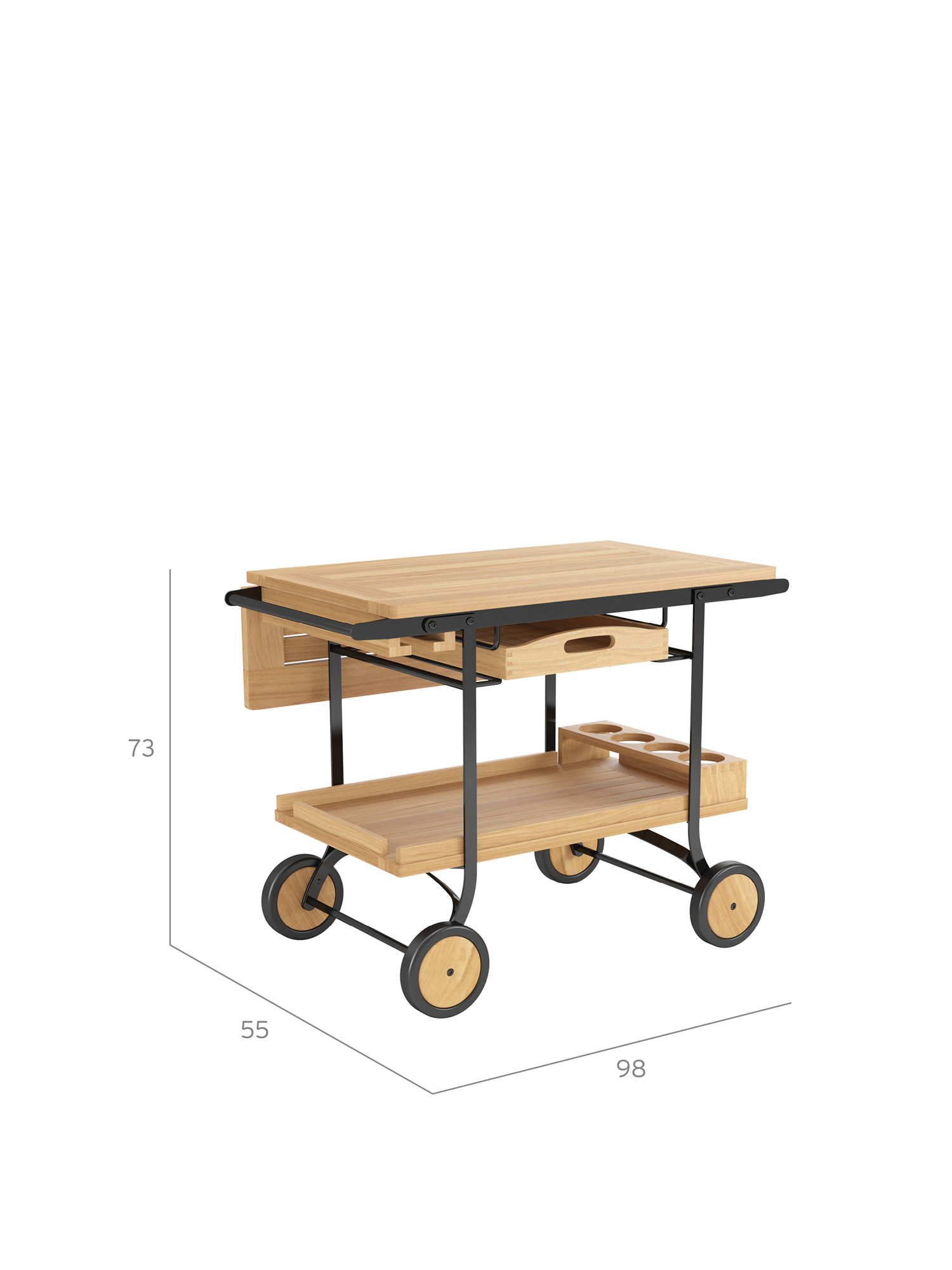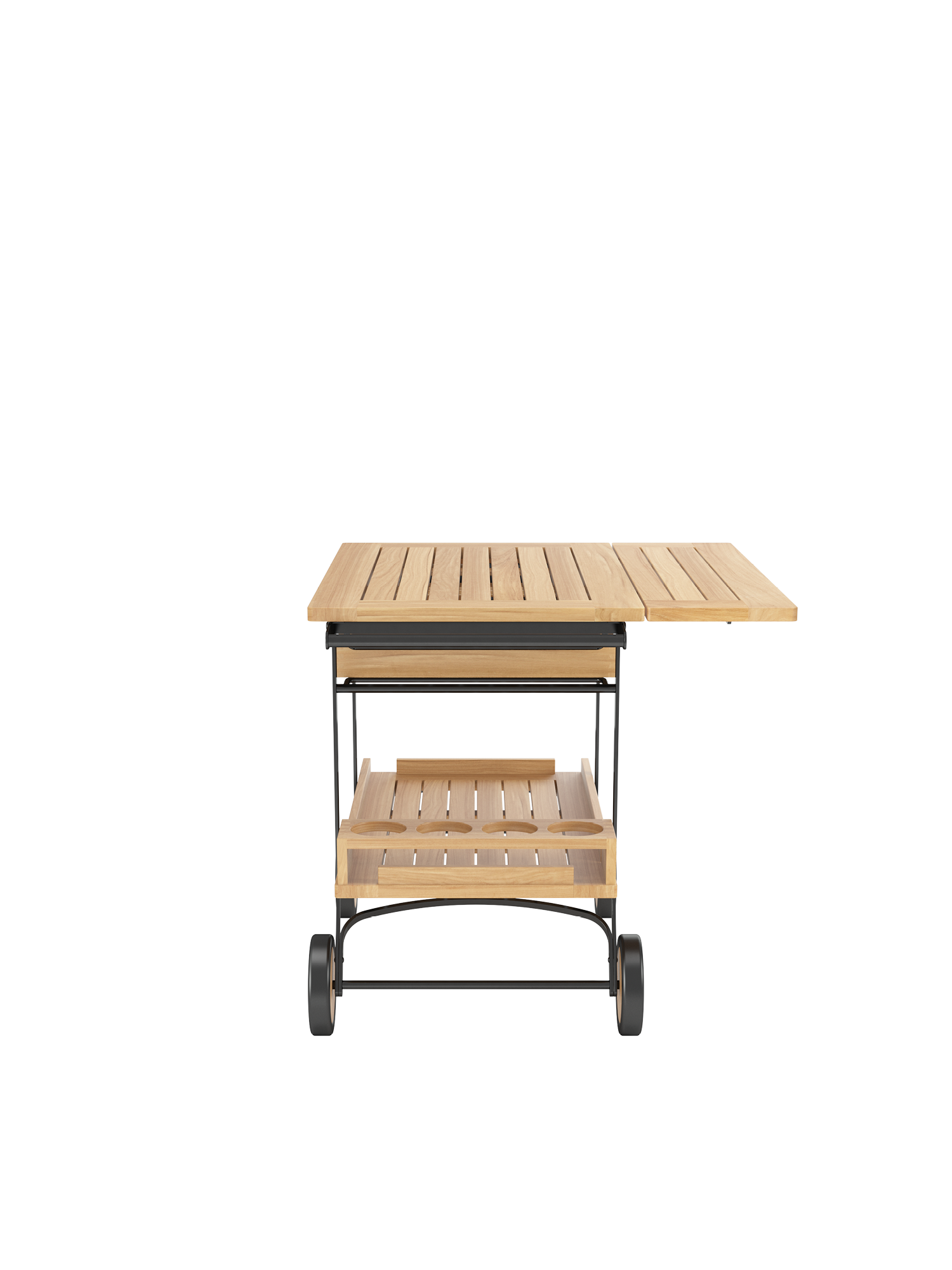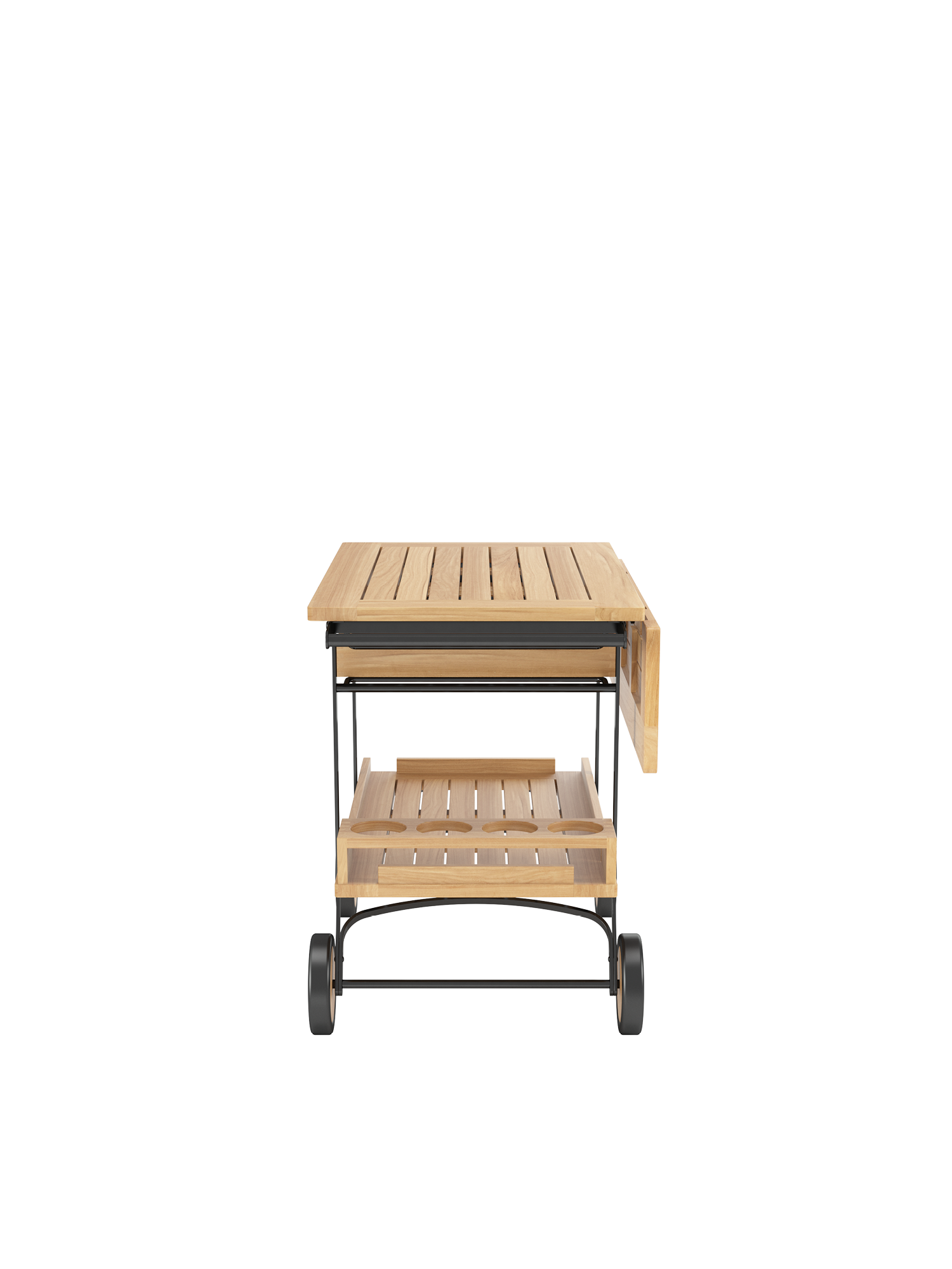 Effortlessly catering to large gatherings and intimate dinners alike, this elegant bar trolley ensures refreshments are always within easy reach. Made from weather-resistant materials, it features a spacious work surface that can be extended with a foldable element. A fully removable drawer for napkins, cutlery, and small items also serves as a tray, which is available separately. The bottle holder, lower shelf, and a rail for securely transporting glasses are all crafted from teak. With sturdy handles and four teak wheels with rubber tyres, the serving trolley can be moved safely and conveniently.