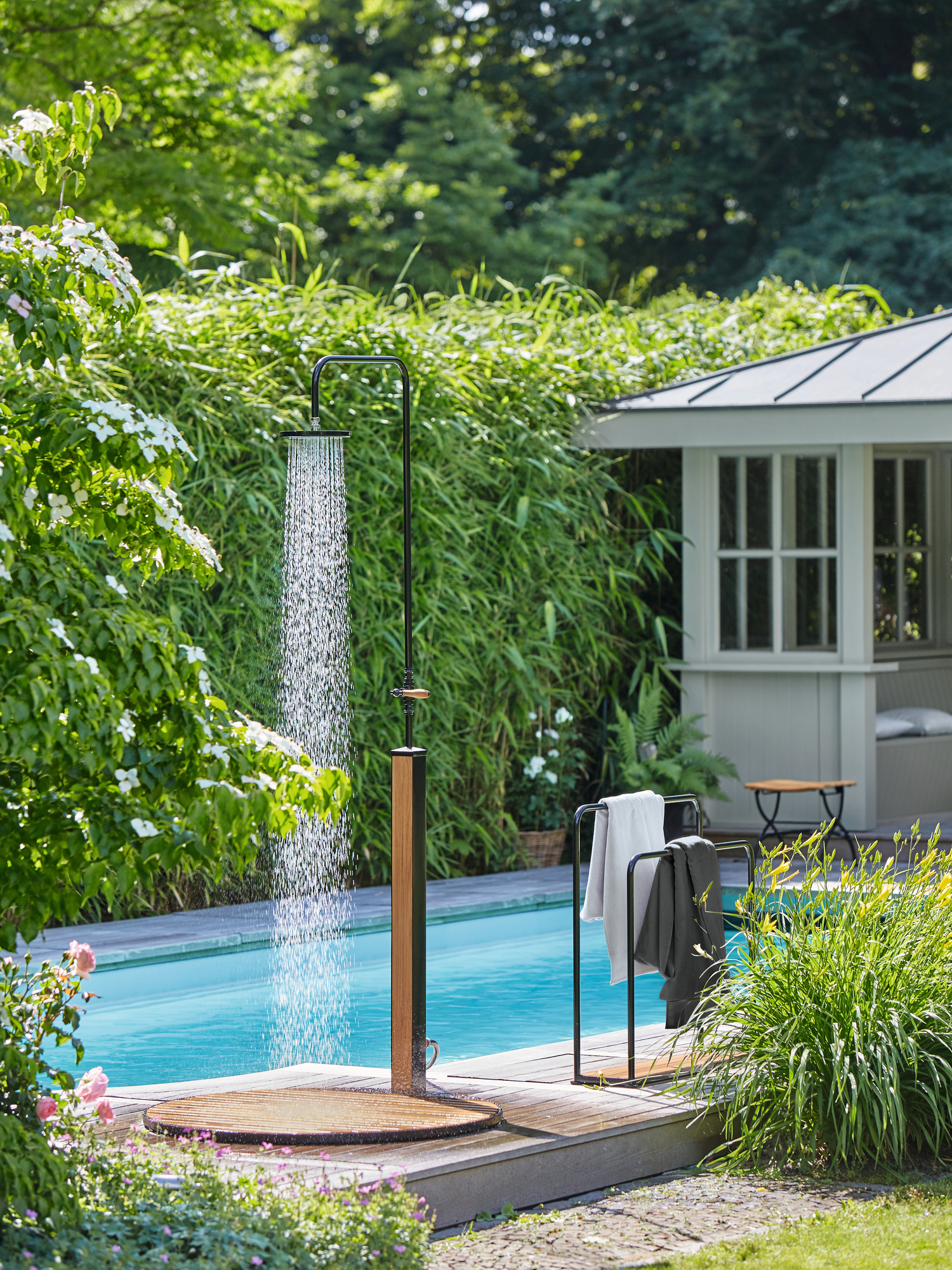 The perfect garden shower accessory (Ref. 2257) made of black powder-coated steel with a teak wood base.