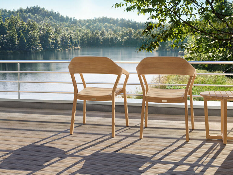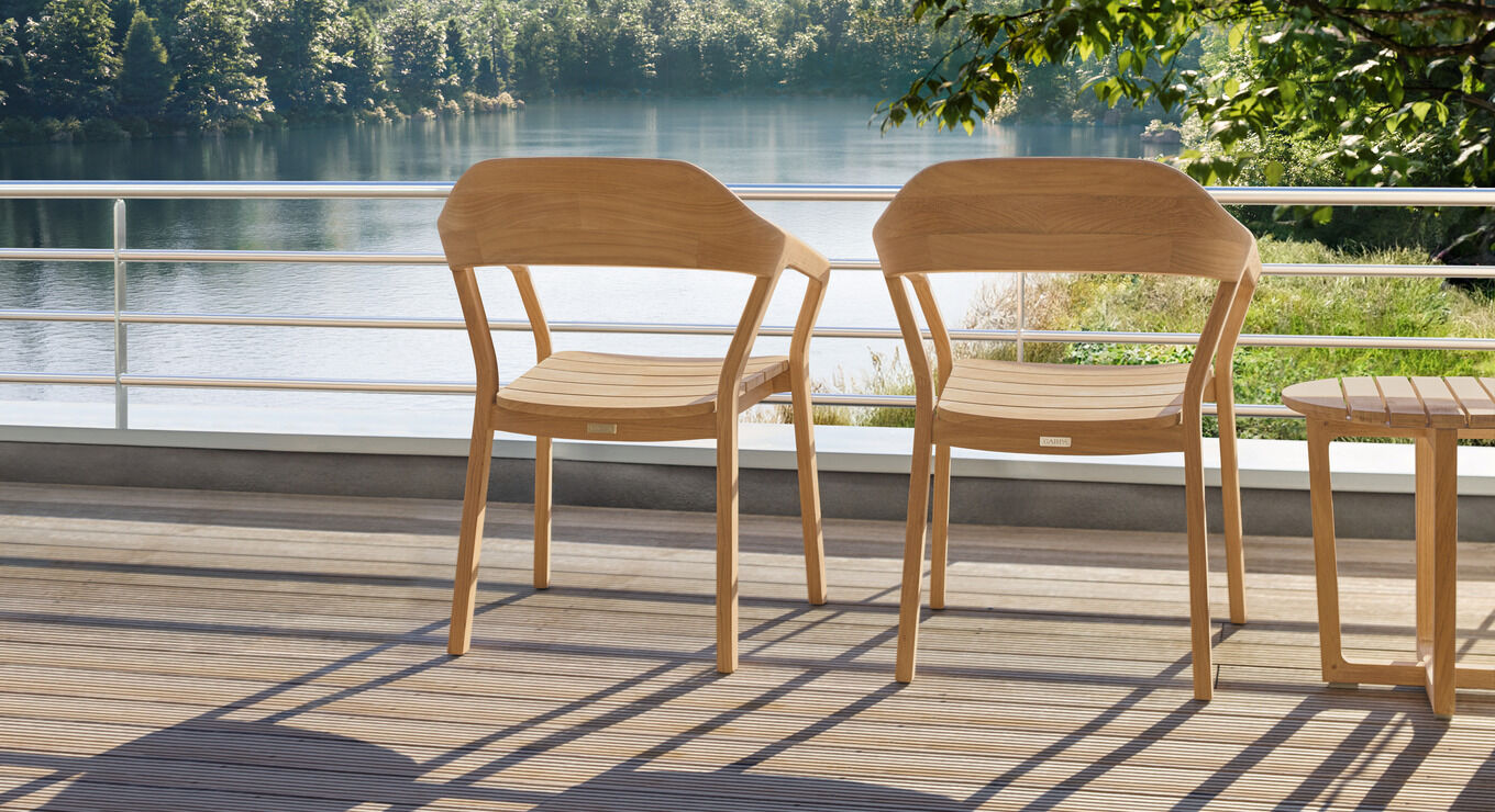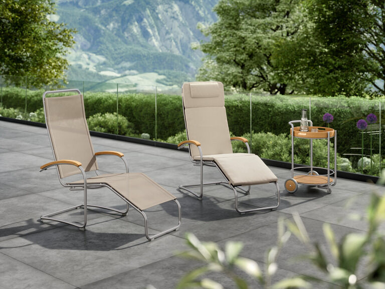 Selected chairs and high-back chairs can be folded or stacked and come together on the balcony to form a flexible seating arrangement. Light, airy rocking chairs gently carry you into deep relaxation.